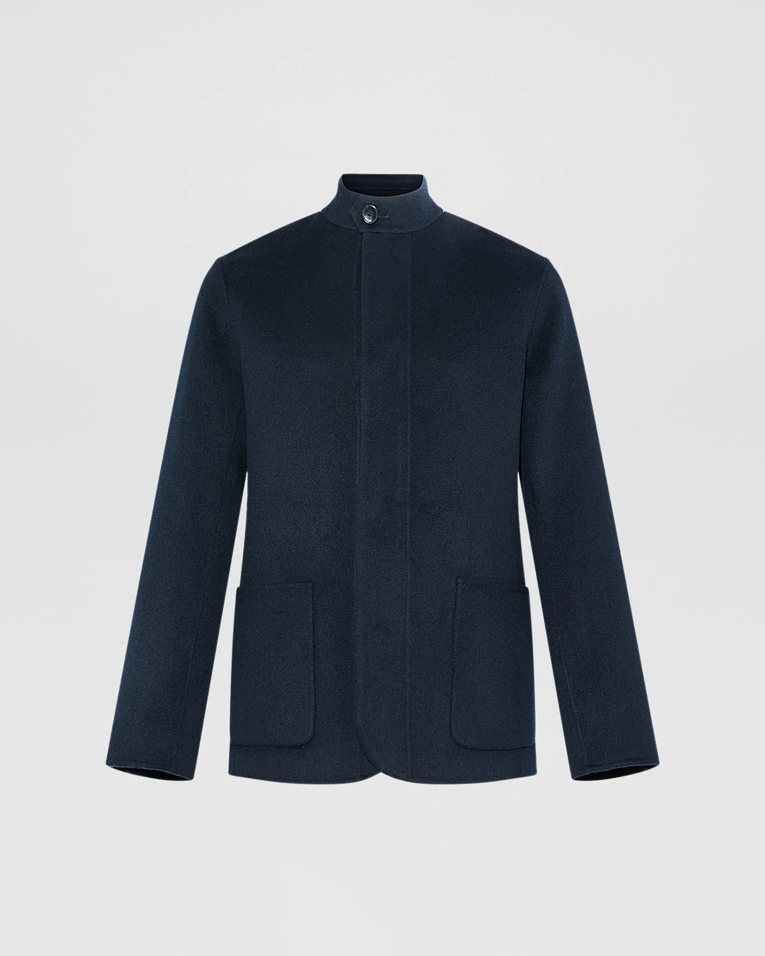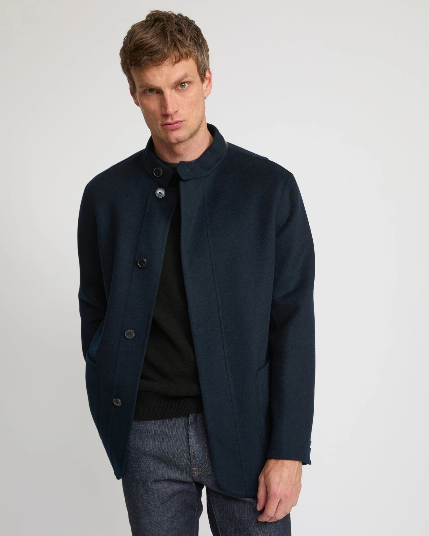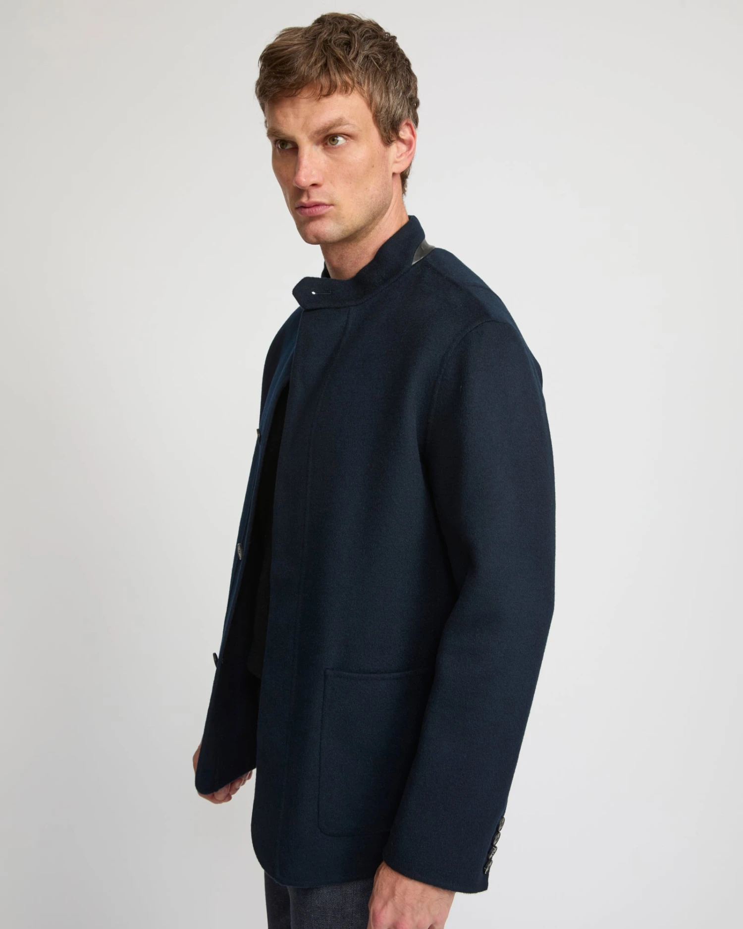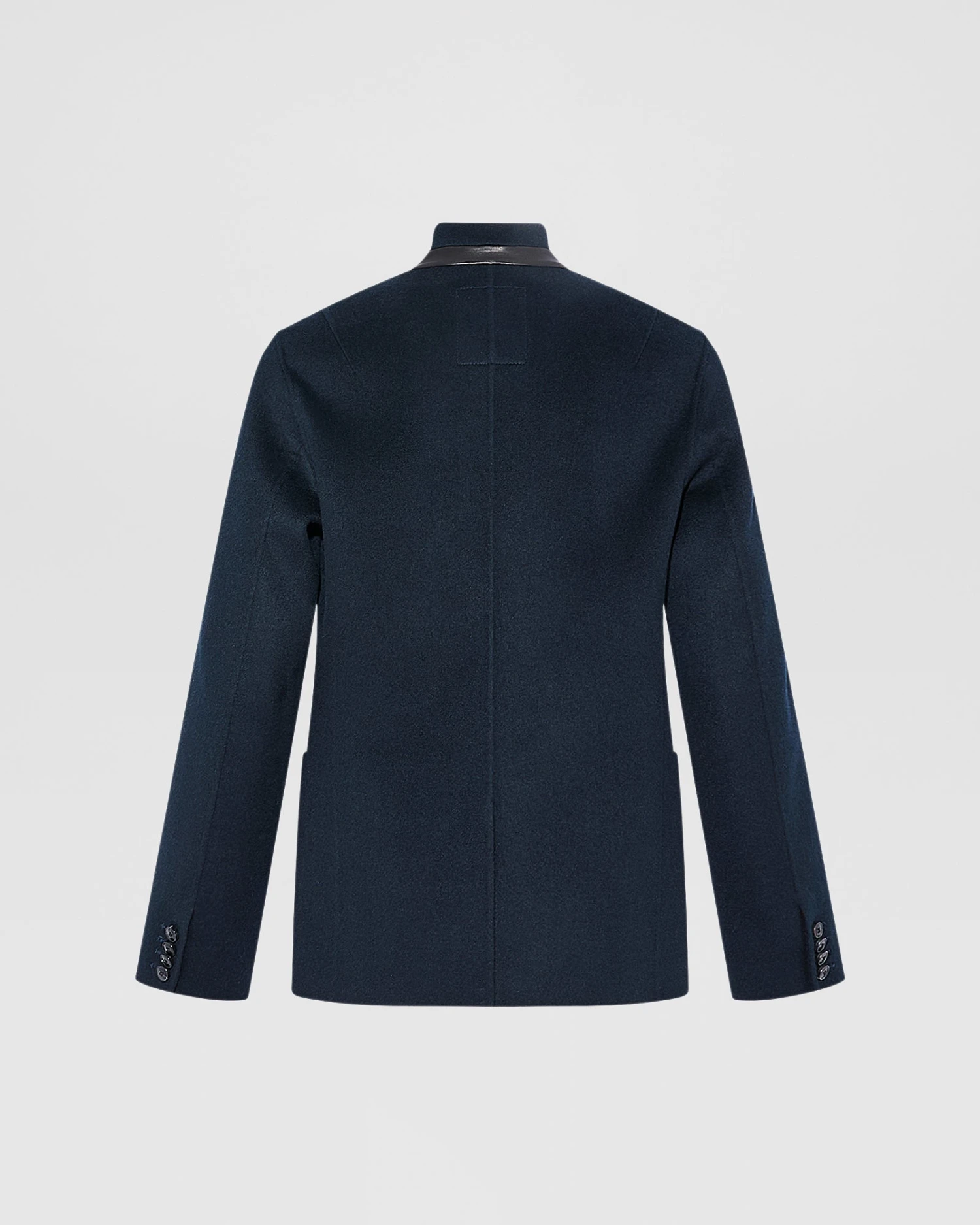 Une élégante veste façon blazer en tissu laine et cachemire double face, avec des détails en cuir d’agneau lisse pour jouer les effets de texture au pied du col et sur la poche intérieure.