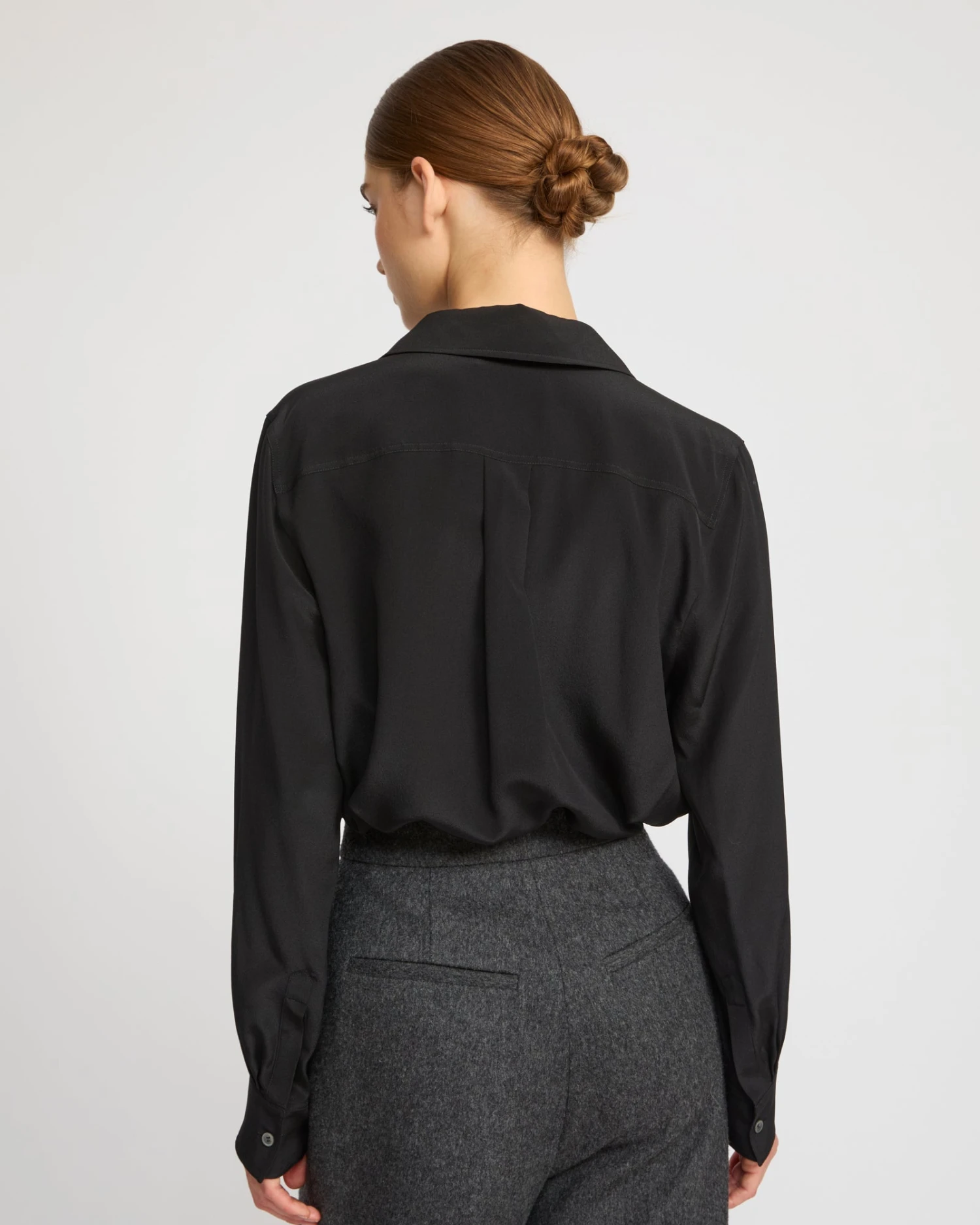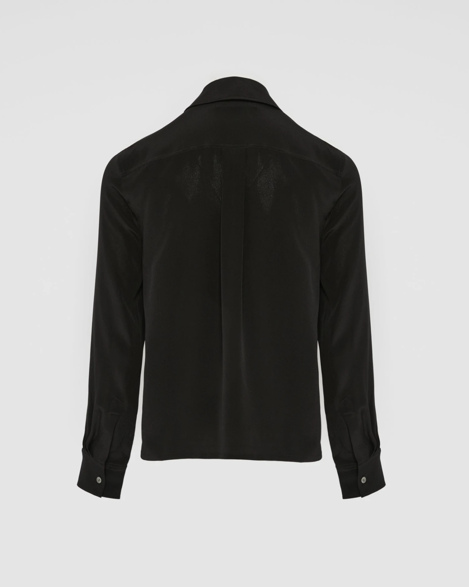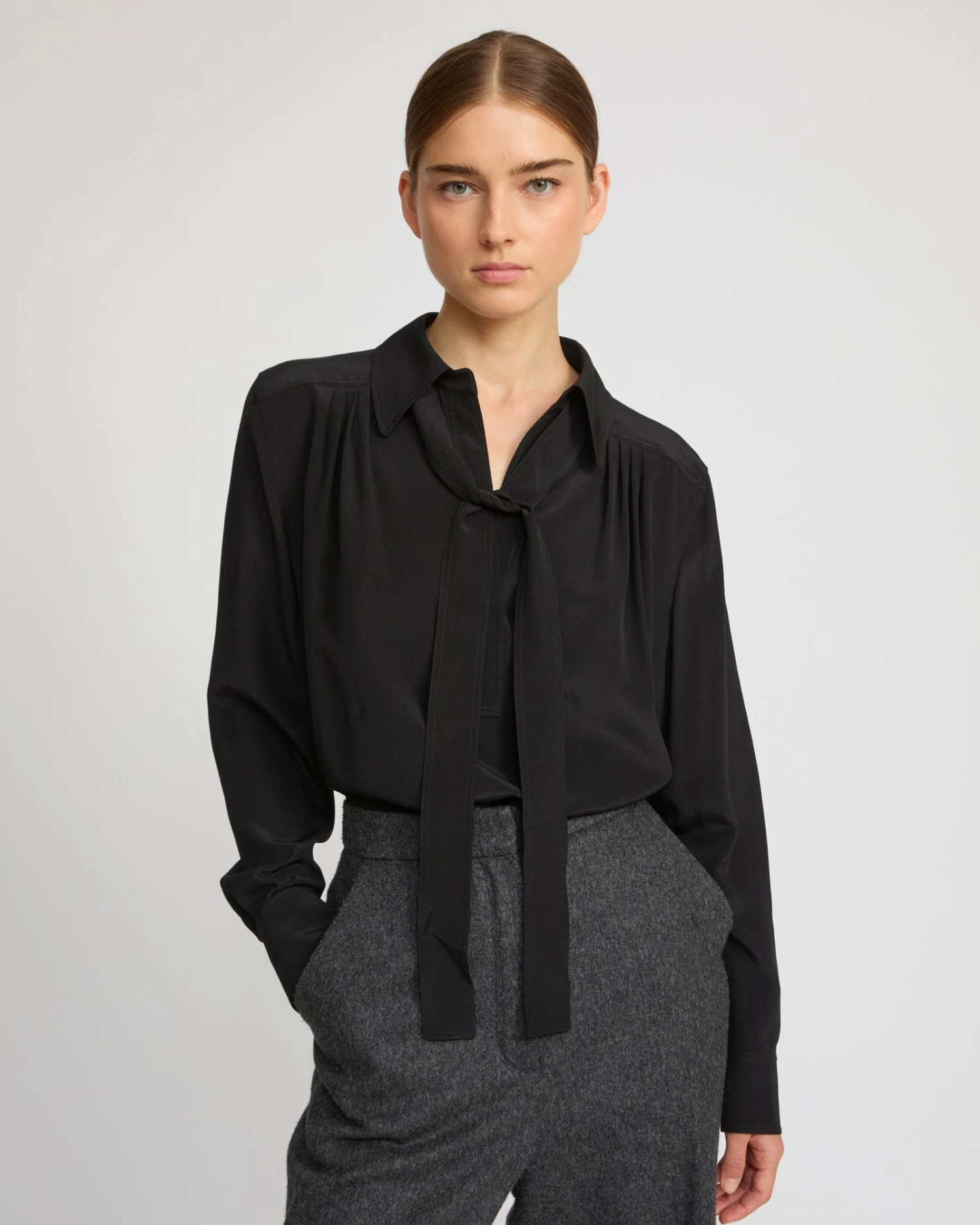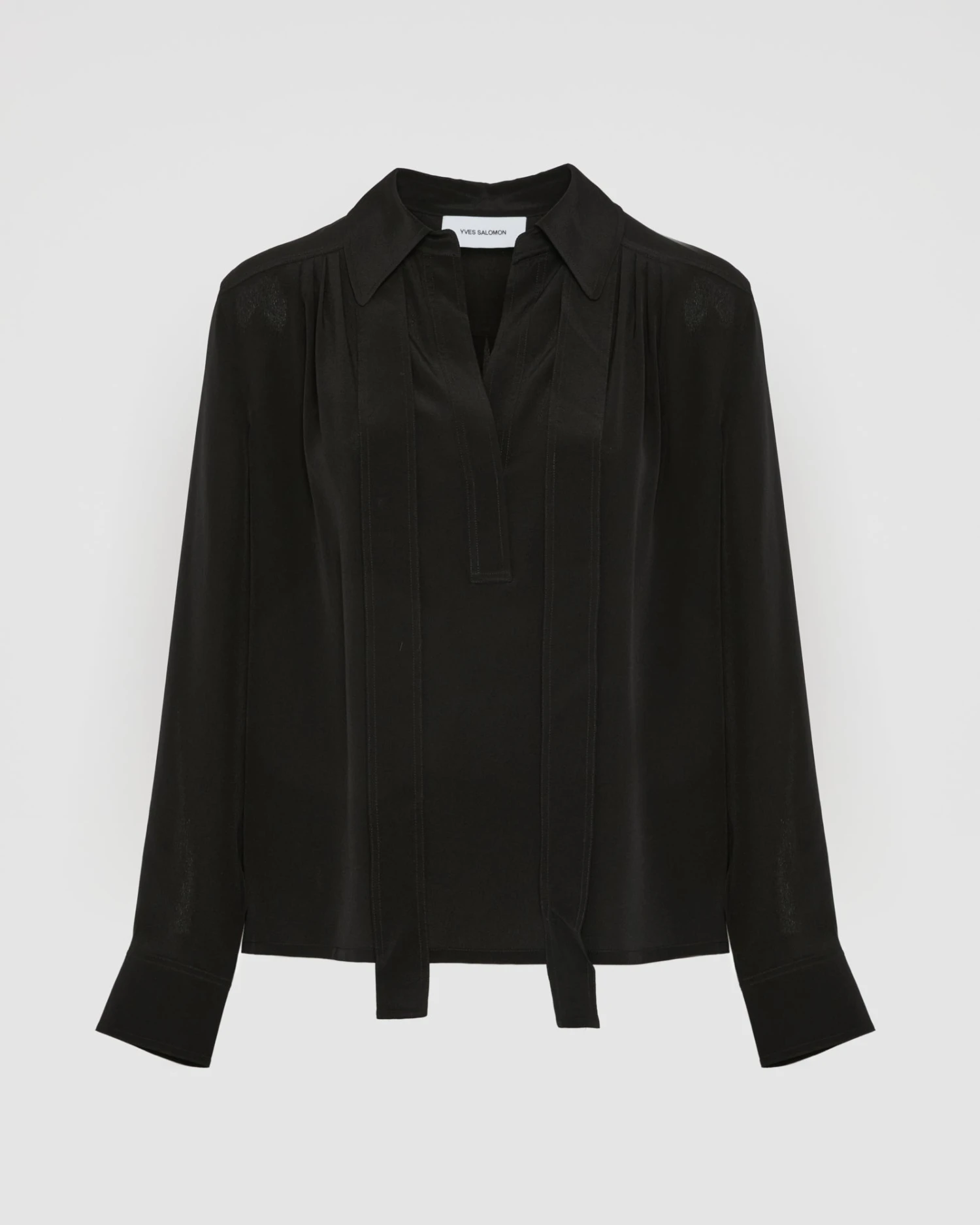 Forme loose et col polo pour cette blouse, travaillée en crêpe de soie fluide, à la main légère. Une grande lavallière amovible permet de multiples options de porté.