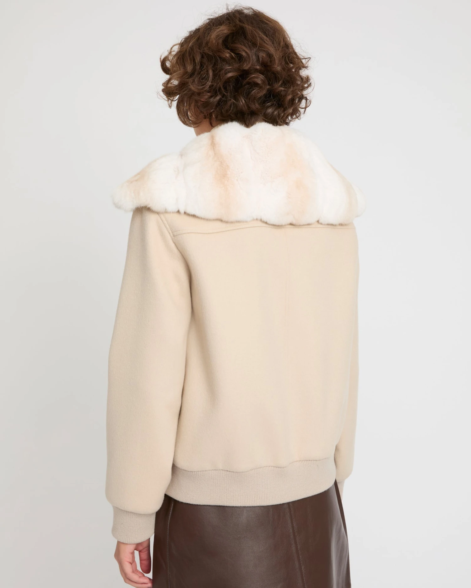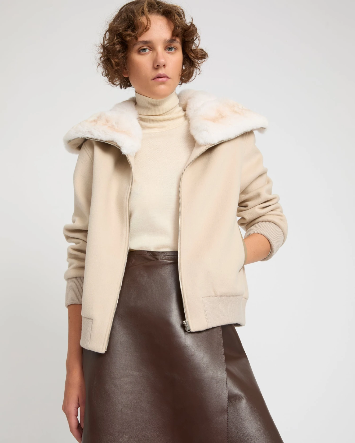 Une allure sportive pour ce petit blouson court zippé, réalisé dans une maille souple en laine et cachemire. Un large col amovible en fourrure de chinchilla moelleux apporte une touche luxueuse.