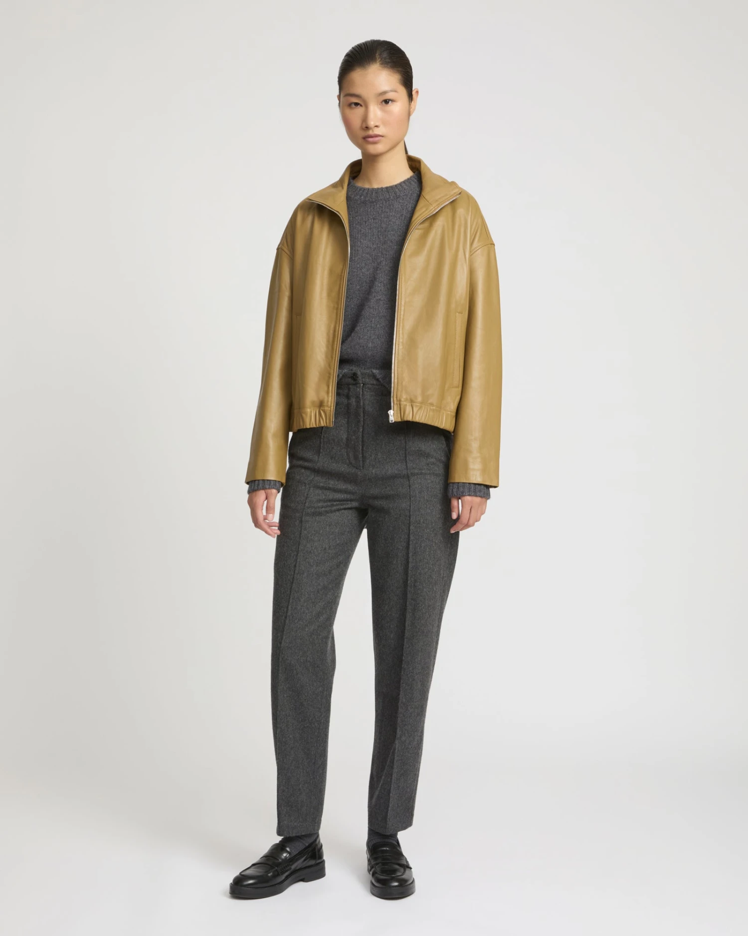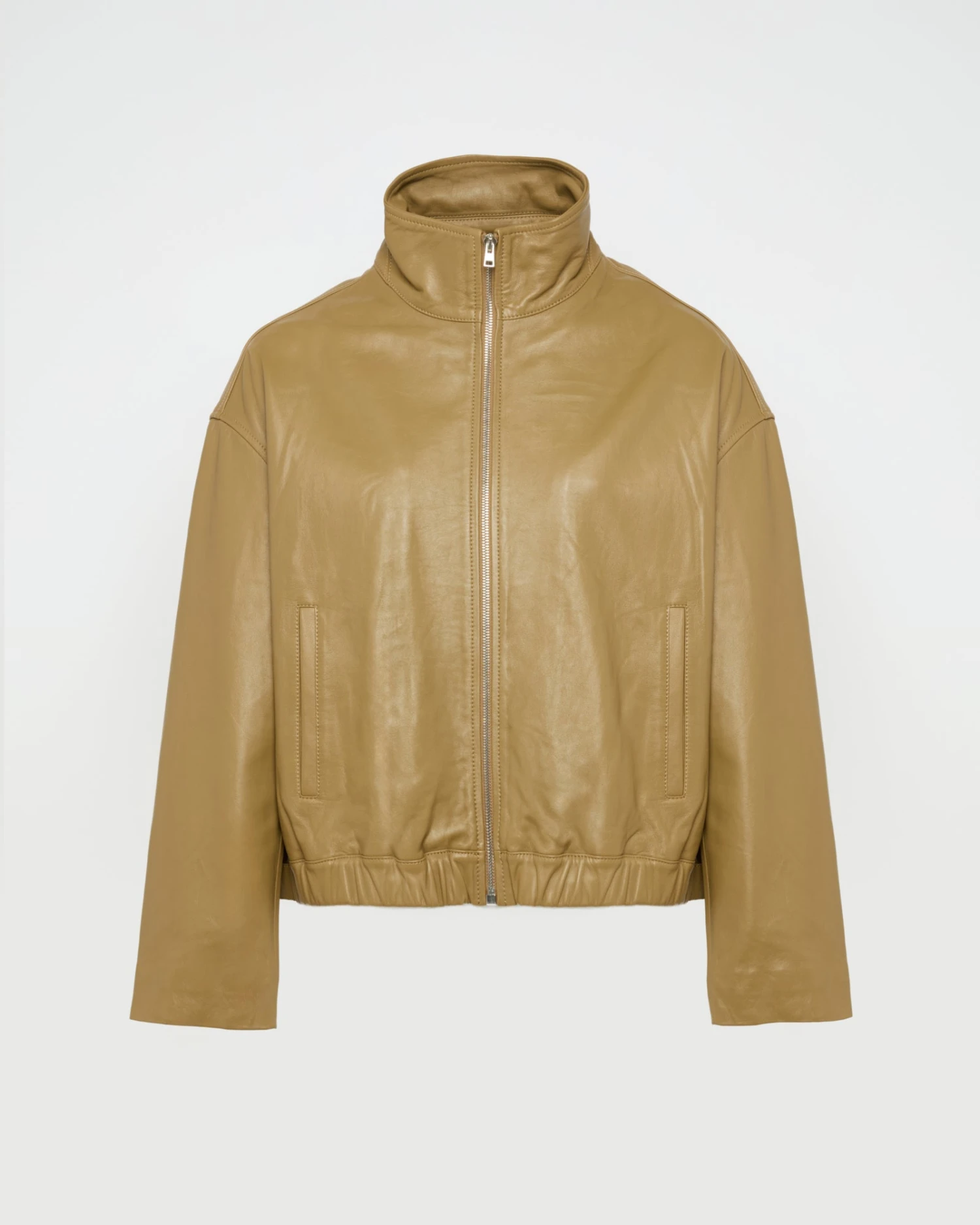 Le cuir d’agneau souple met en valeur les lignes d’inspiration masculine de ce blouson court au col montant. Sa forme légèrement ample et ses poches côté soulignent une attitude à la fois décontractée et intemporelle. Des pattes de serrage permettent de moduler le porté.