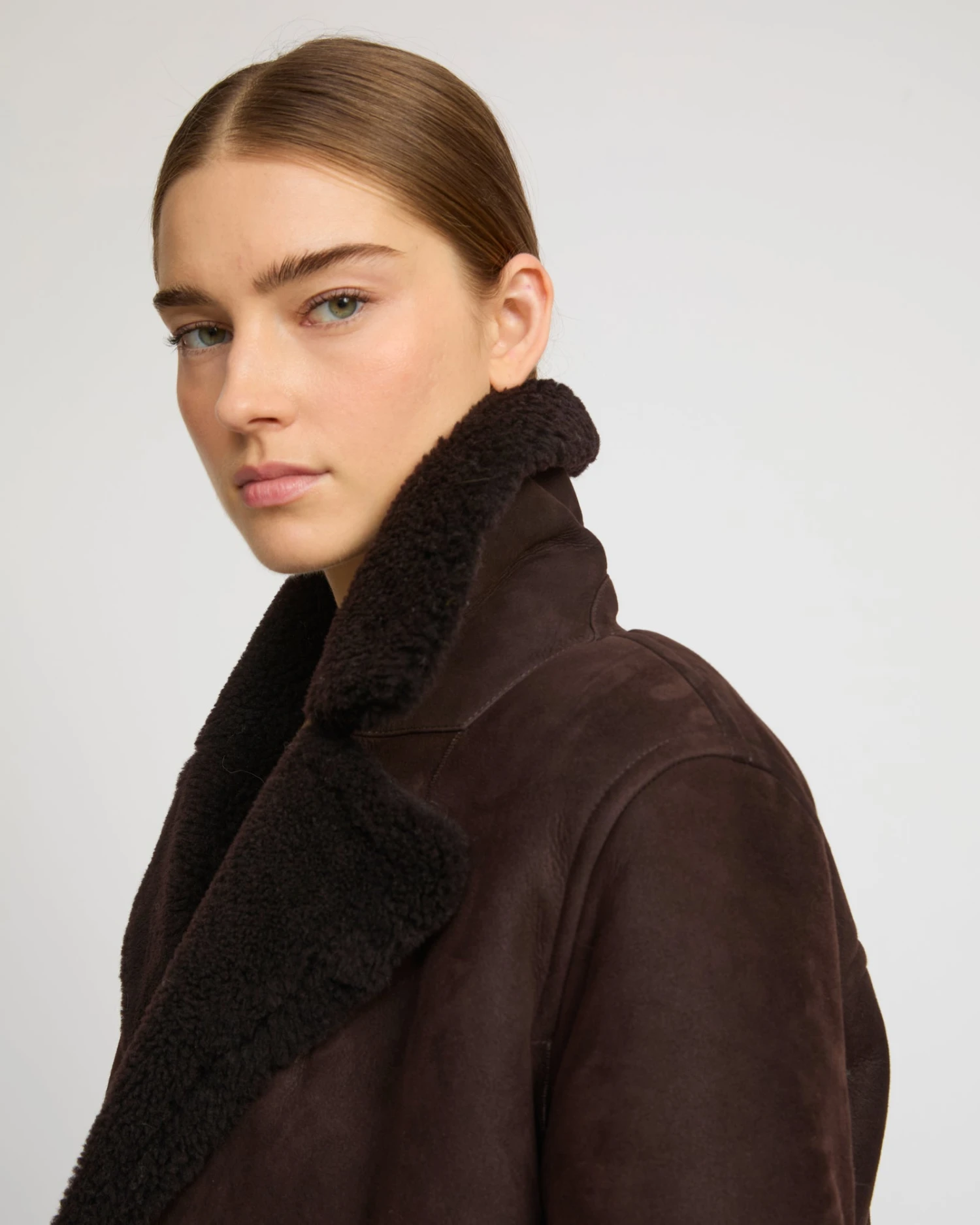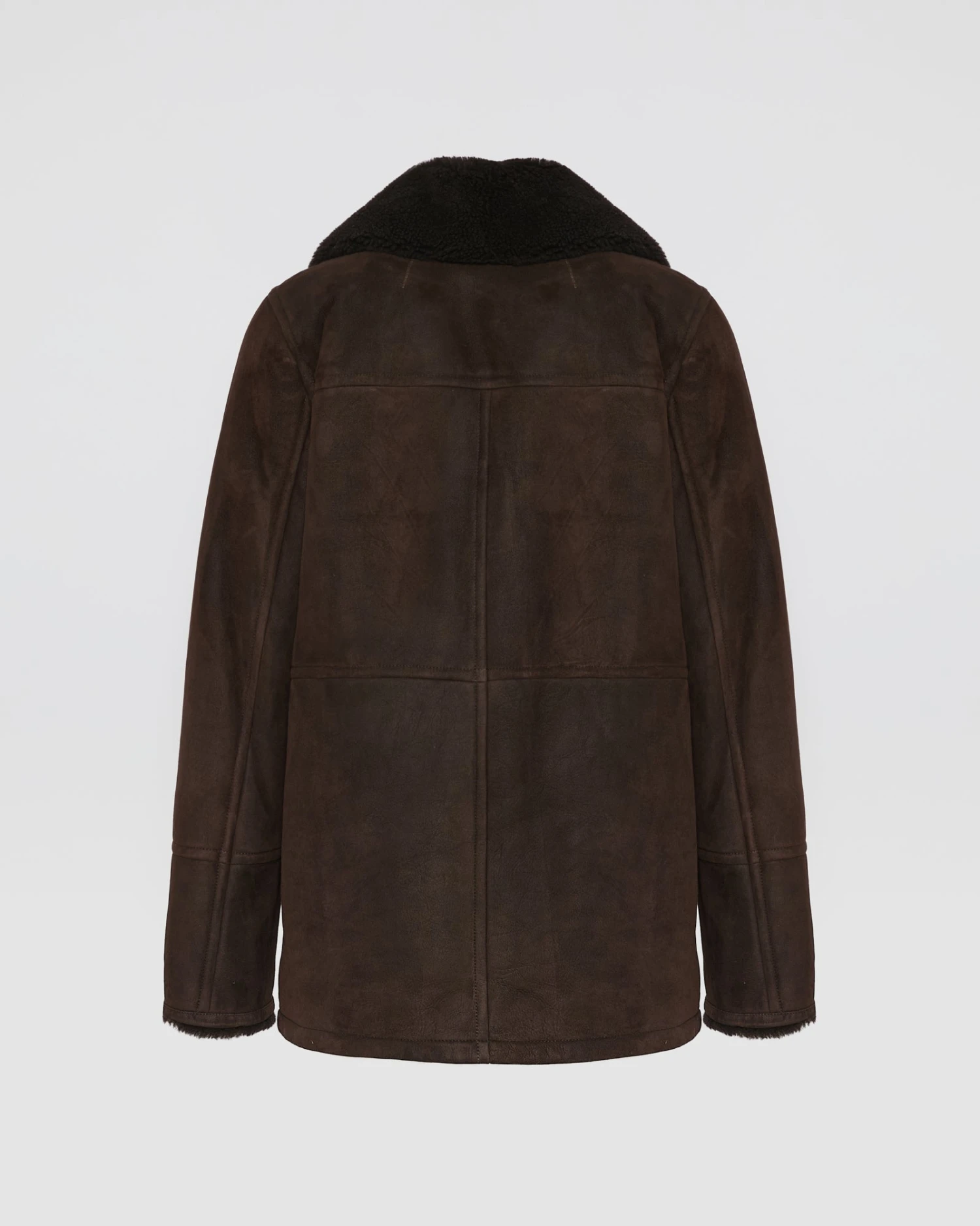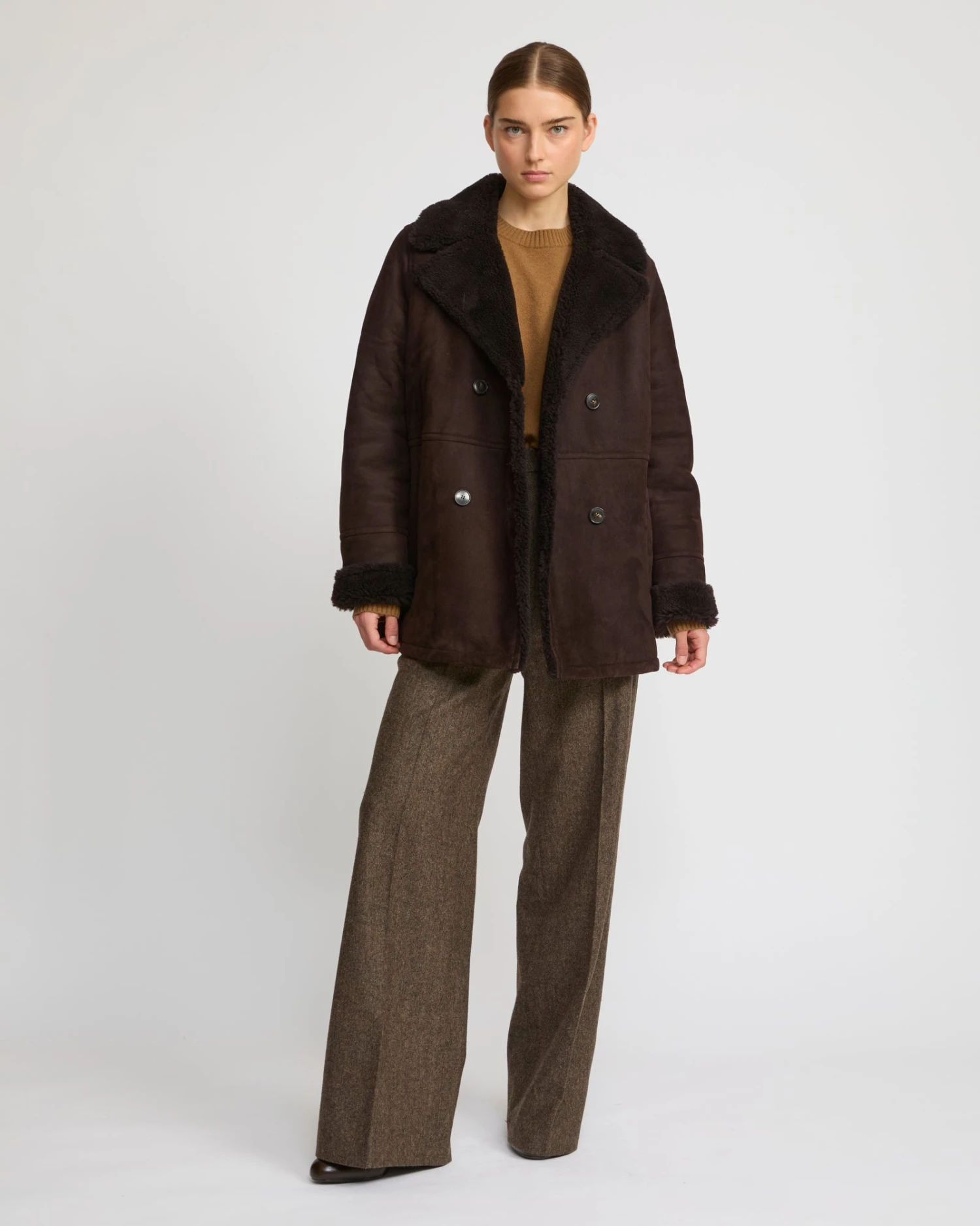 La forme classique du caban, travaillée dans une peau lainée en agneau Gonfio avec une finition douce effet suède à l’extérieur, et une doublure douce et chaleureuse. La texture de l’agneau est visible sur les larges revers du col cranté. Fermeture par double boutonnage. –