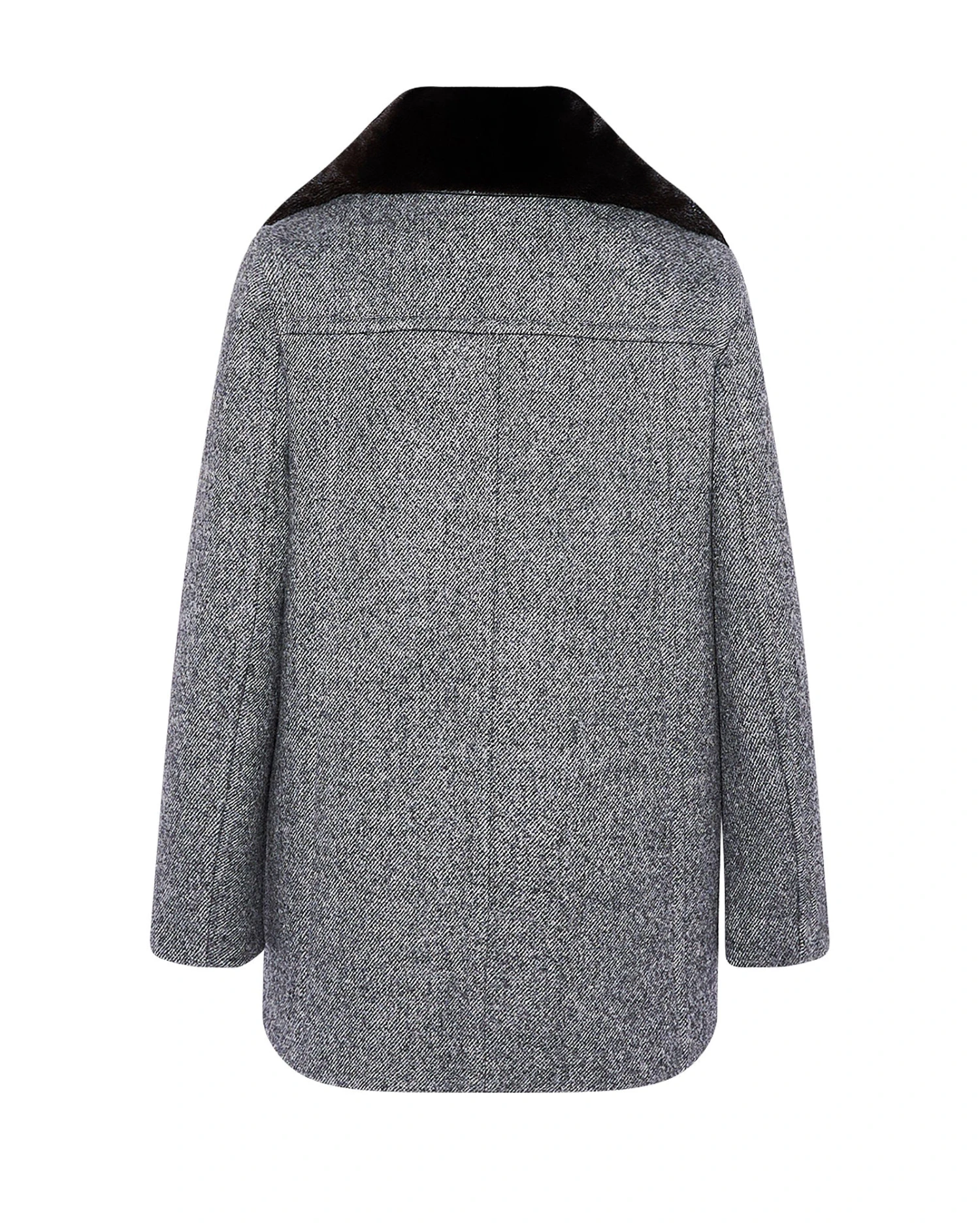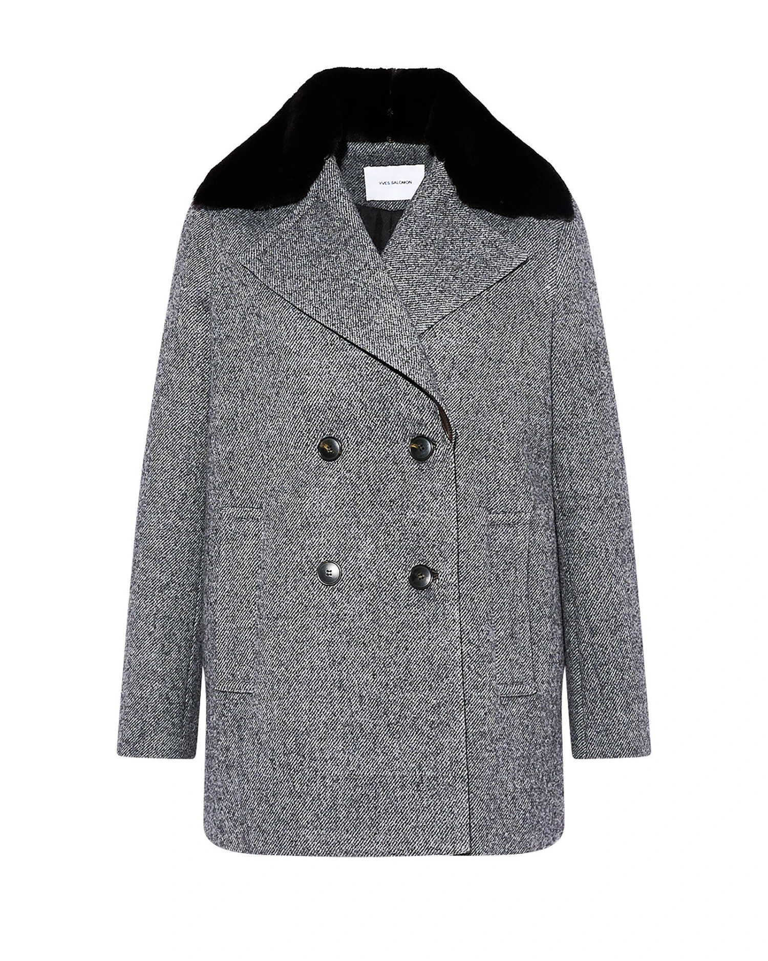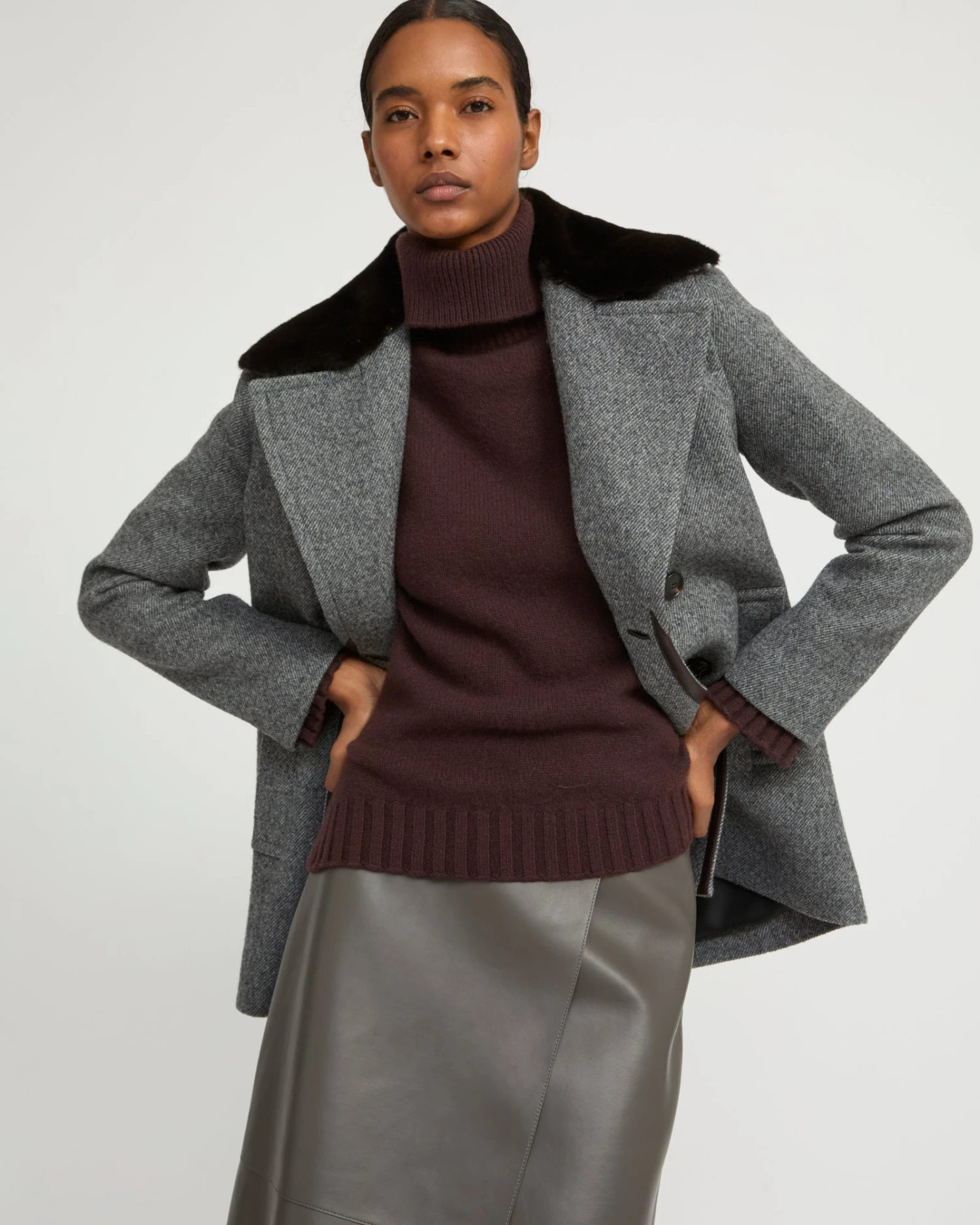 Les lignes du caban classique se réinventent dans une version légèrement évasée, en lainage vierge, avec un large col amovible en fourrure de vison doux et brillant, pour une touche luxueuse.