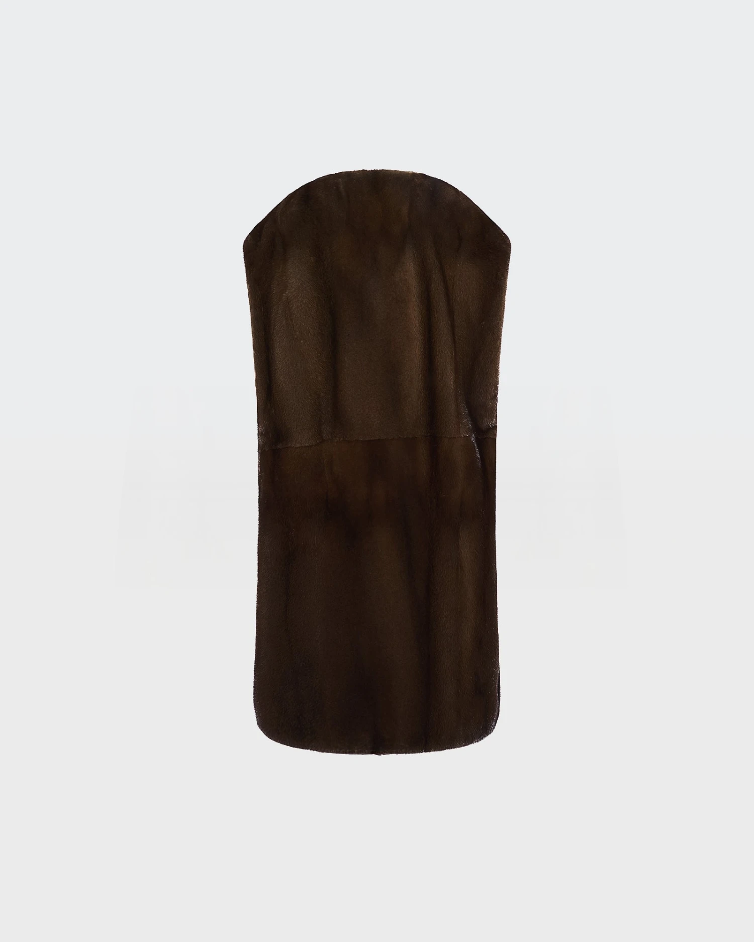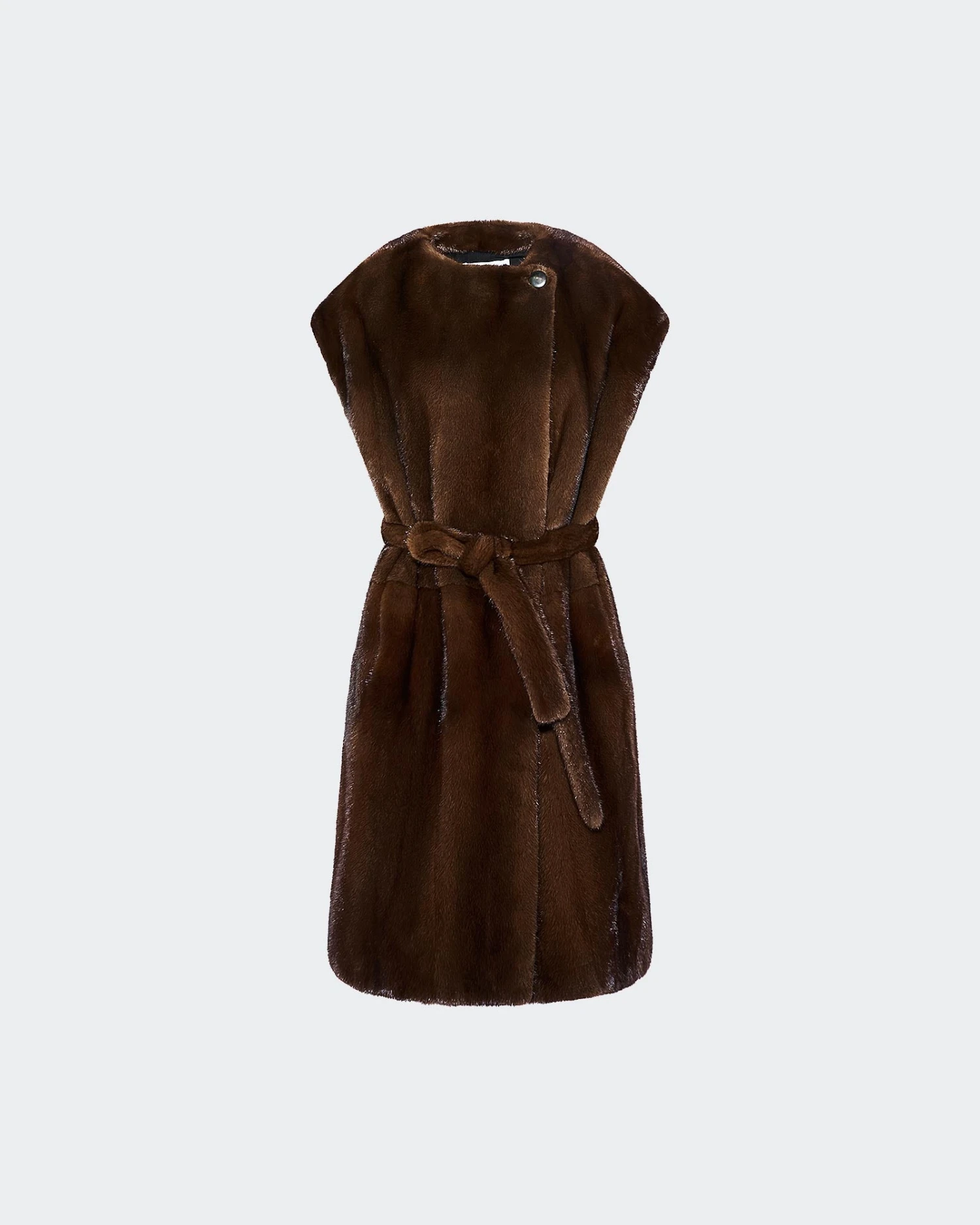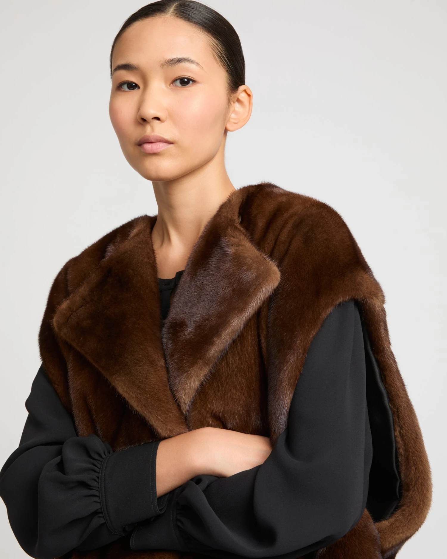 La texture luxueuse de la fourrure de vison long poils apporte sa main unique à une cape légèrement oversized, dont les lignes simples mettent en valeur cette matière noble. Une ceinture assortie en vison permet de moduler la silhouette. La cape peut se porter ouverte ou fermée grâce à des crochets invisibles et un bouton au col.