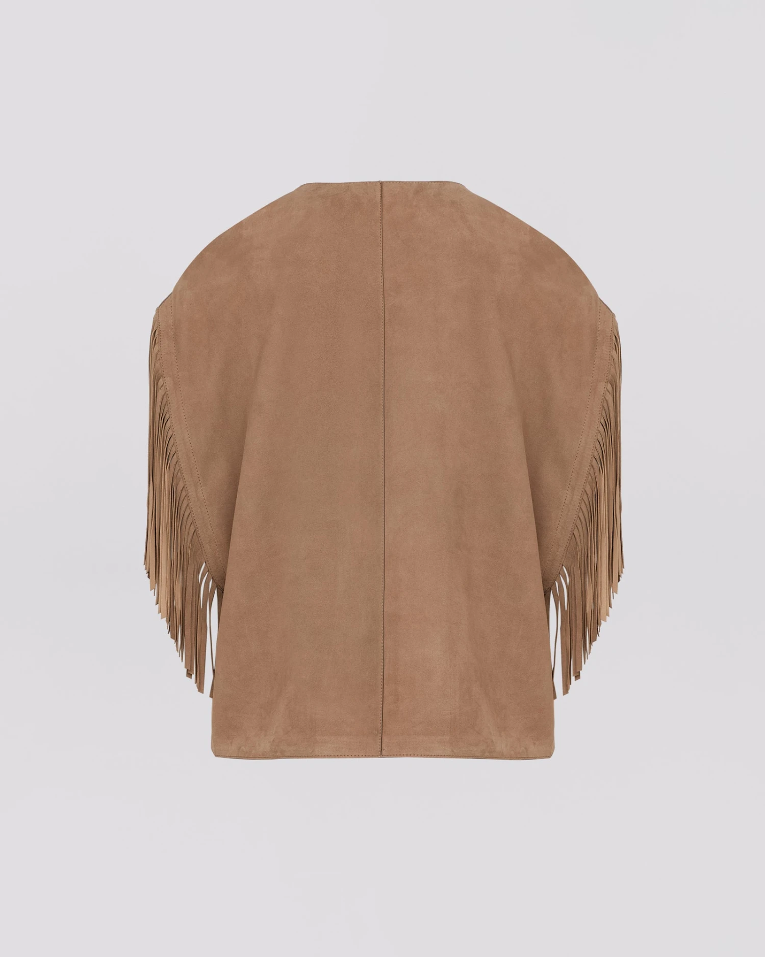 Alliance d’un corps en cuir velours double-face avec sa texture veloutée, et de longues franges travaillées à la main pour une cape courte qui ne passe pas inaperçue.