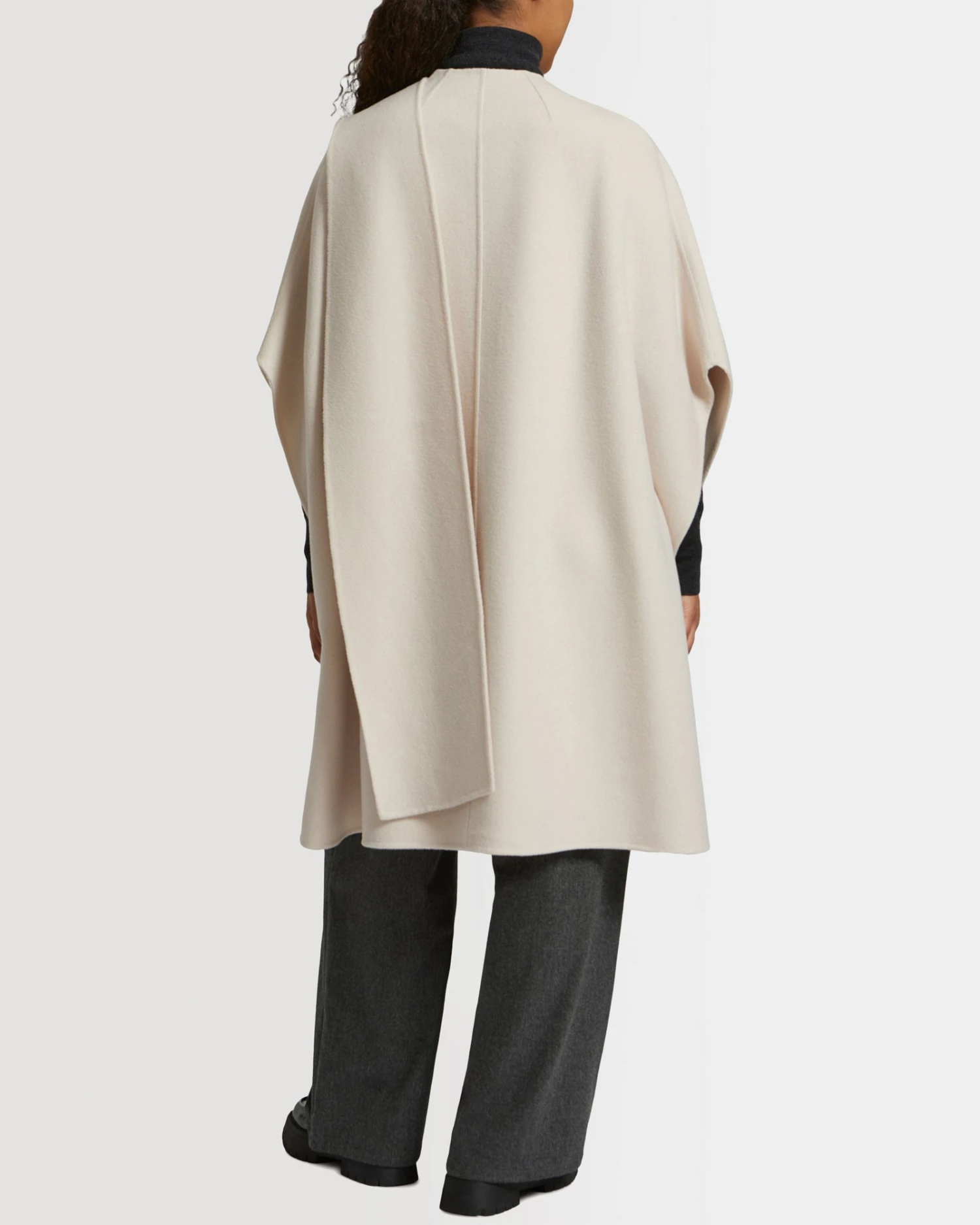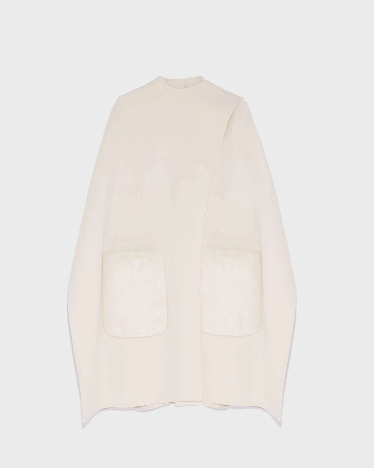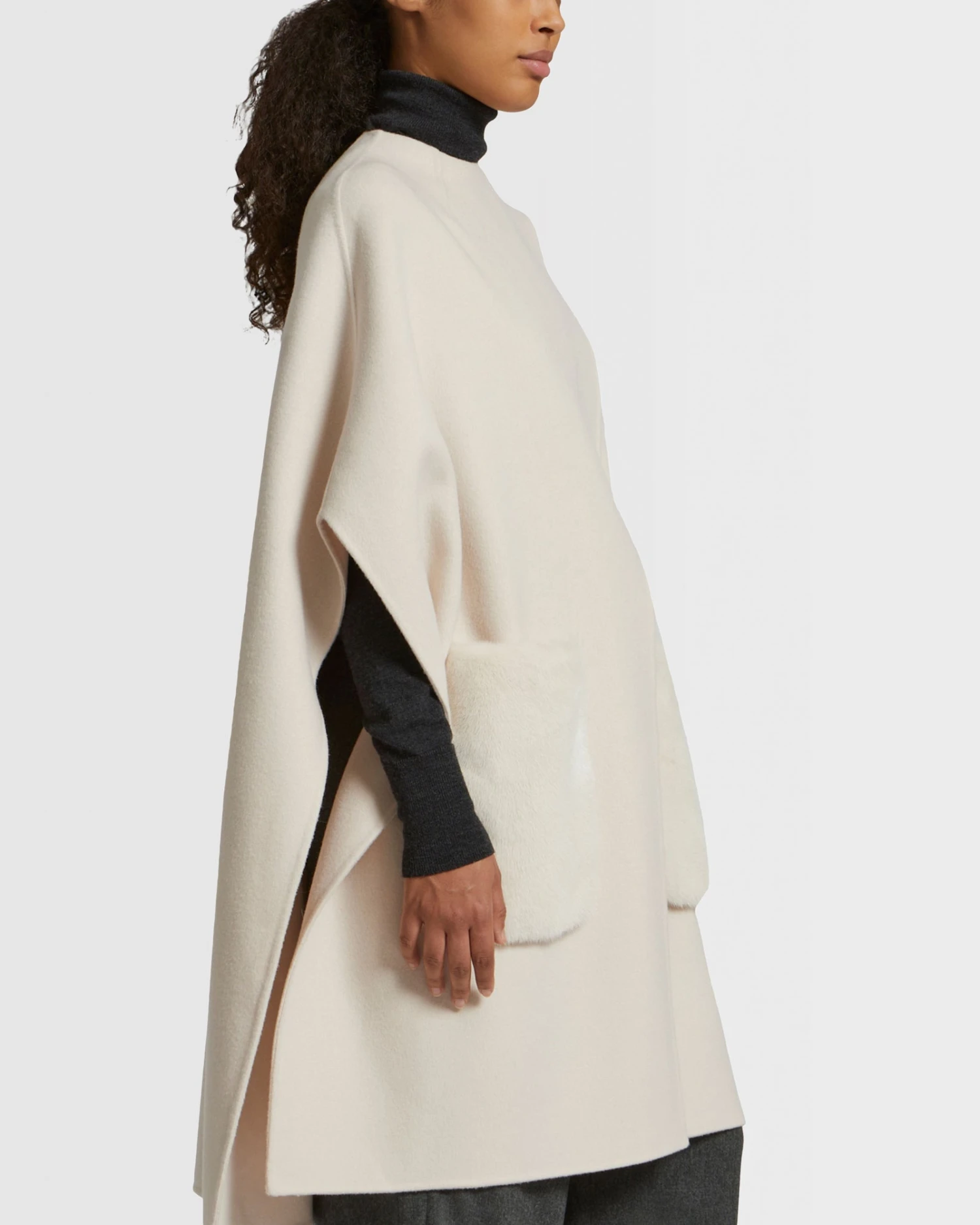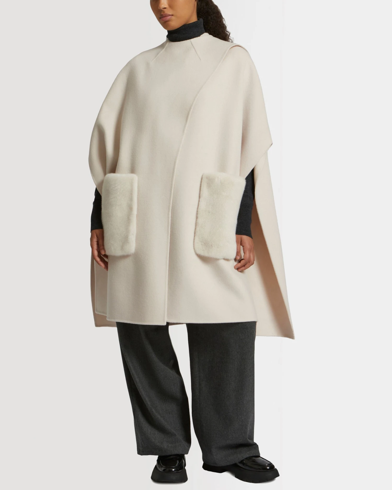 Une cape longue et enveloppante qui combine le confort à l’élégance. Confectionnée en lainage cachemire, sa ligne minimaliste offre une allure à la fois rétro et résolument moderne. Doté de sur-poches en fourrure de vison qui s’attachent et se détachent grâce à un système de boutons-pression, ce modèle est aussi versatile qu’intemporel.
