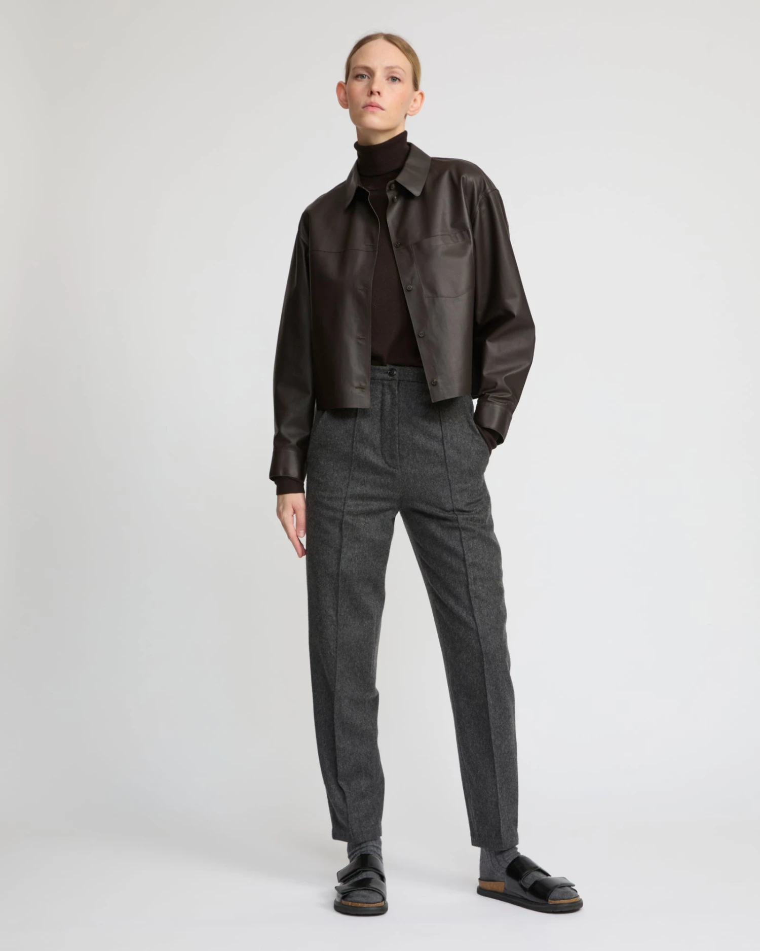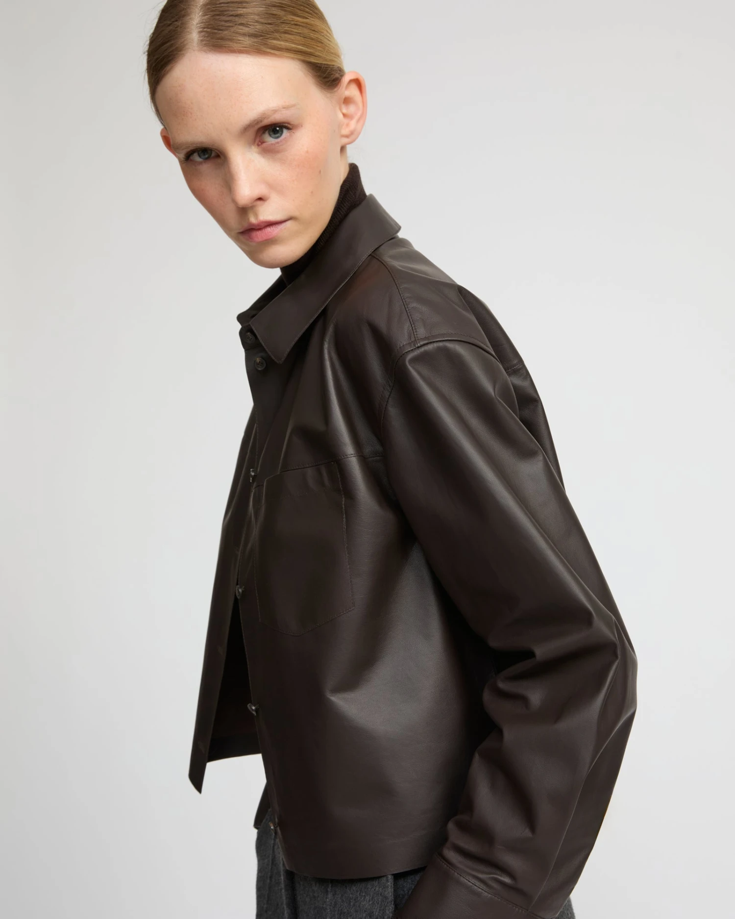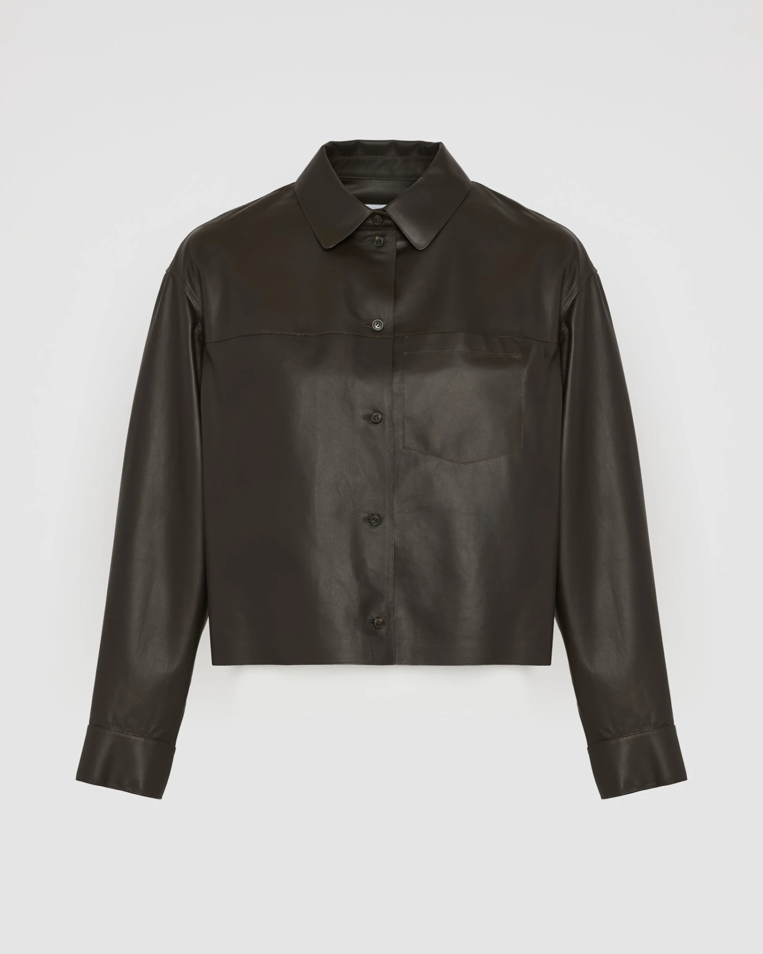 Forme courte et coupe boxy pour cet hybride élégant de la veste et de la chemise, travaillé dans un cuir d’agneau fin, souple et brillant. Petit col chemise et poche plaquée avant. À porter sur un pull ou une chemise longue pour un jeu de superpositions.