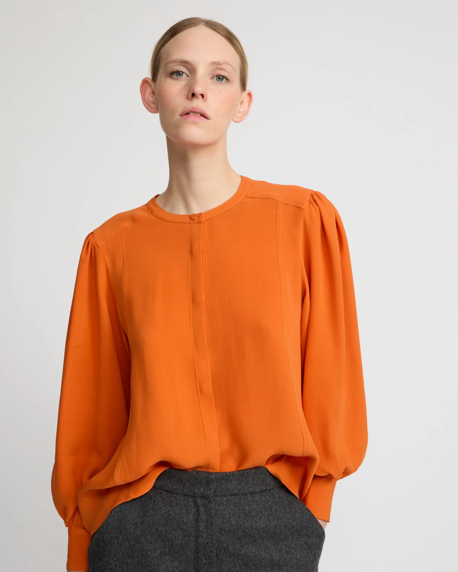 Une matière fluide en crêpe de soie met en valeur la coupe travaillée de cette blouse aux manches légèrement ballon, terminées de poignets boutonnés, et au petit col officier.