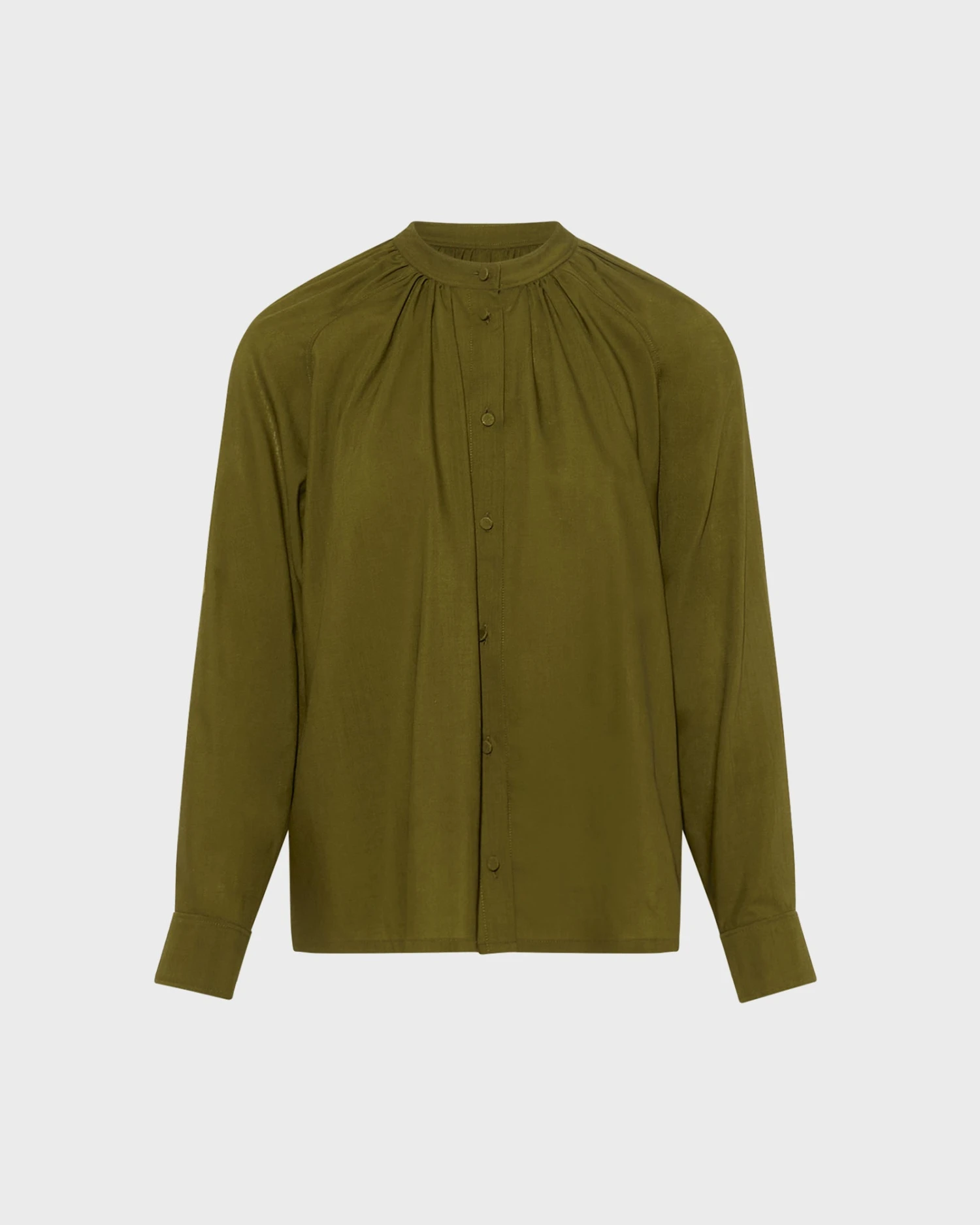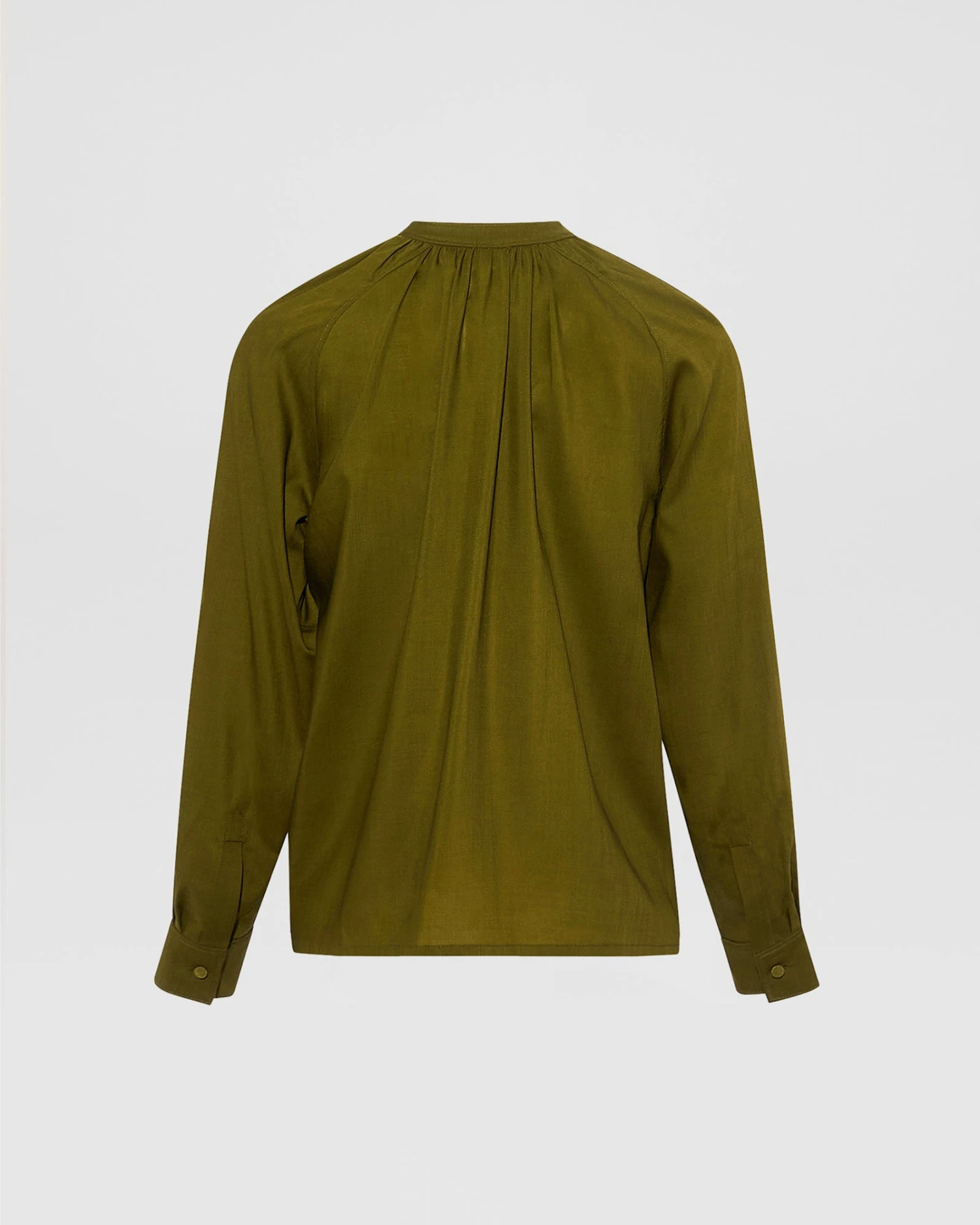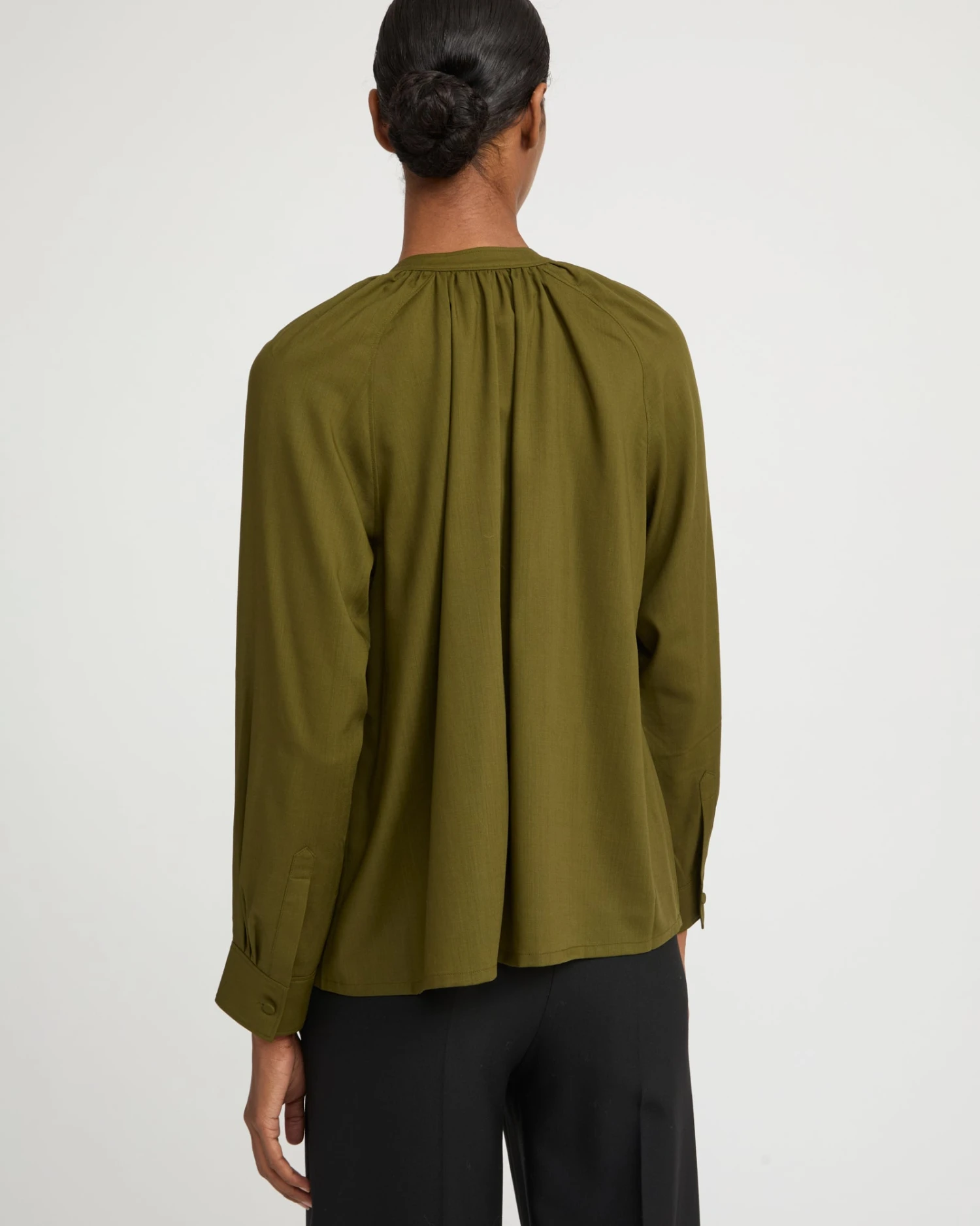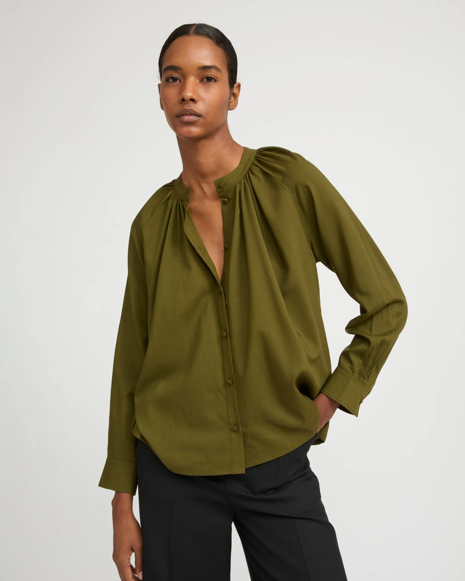 Travaillée dans une voile de laine fluide, cette chemise élégante se ferme par des boutons recouverts de cuir d’agneau ton sur ton. Sa forme légèrement oversized comporte des manches ballon et un jeu de drapés au niveau du col officier et du plastron.