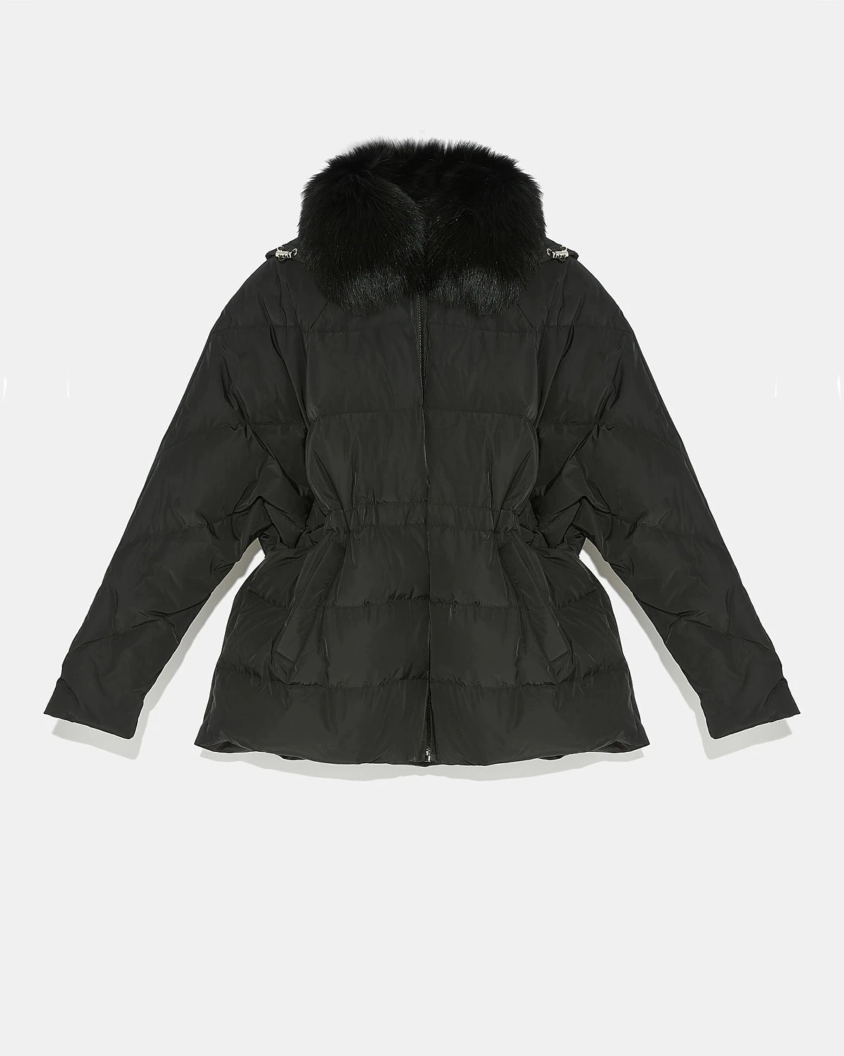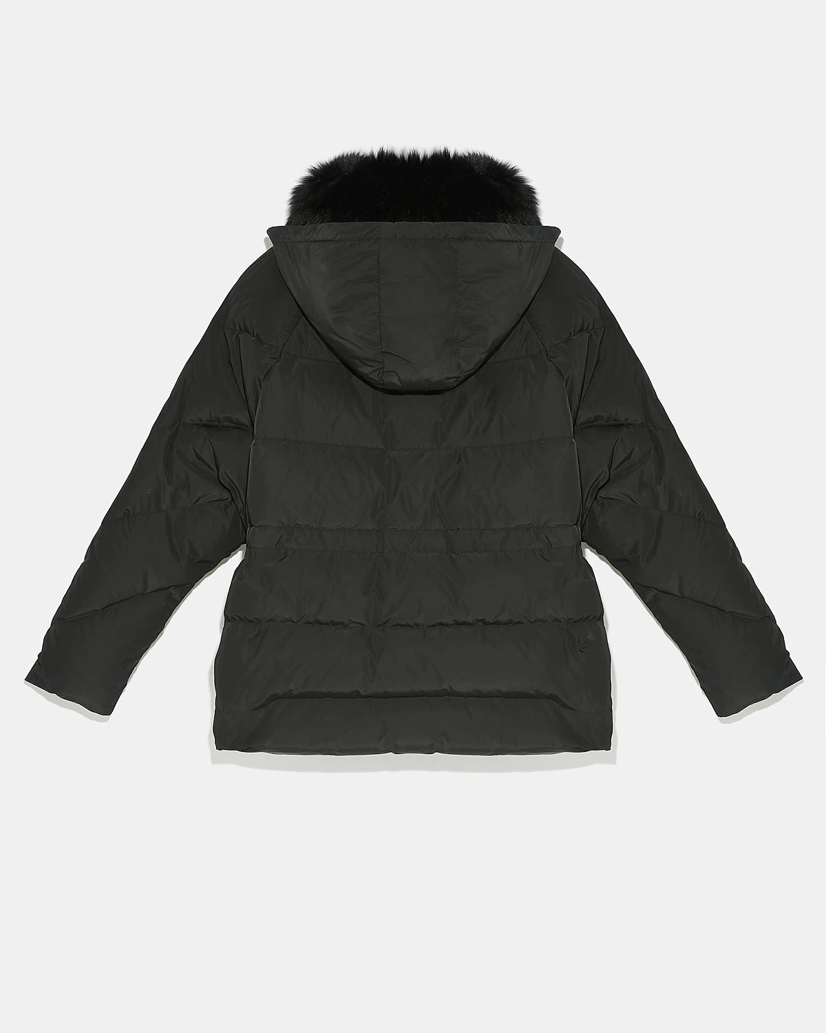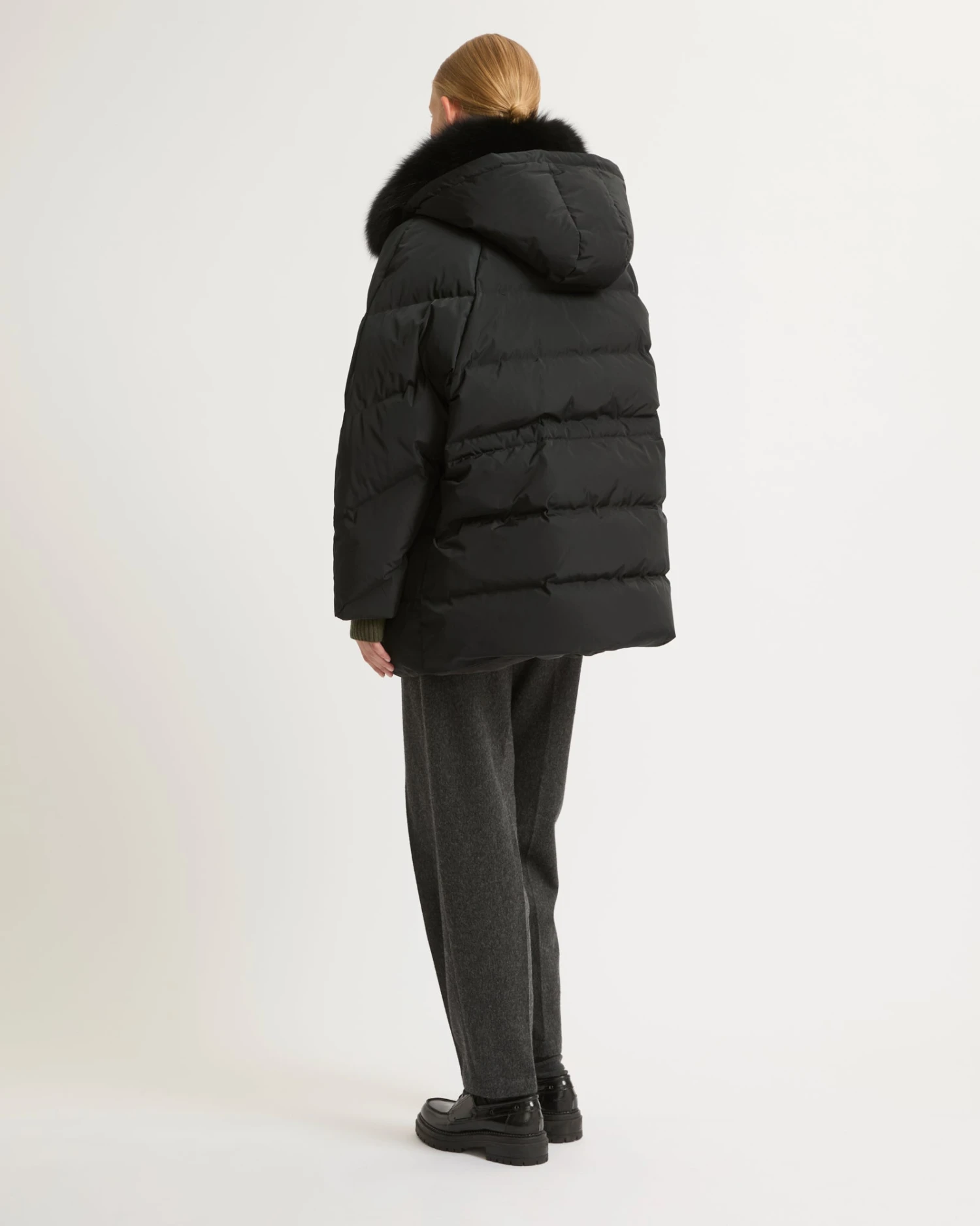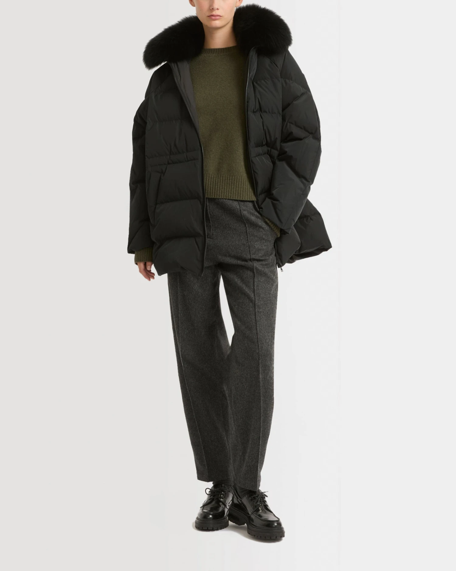 Une forme cape évasée pour cette doudoune matelassée en tissu technique lisse. Une capuche amovible permet de mettre en valeur le volume de la veste, tandis qu’un petit col en renard, également amovible, apporte sa touche d’élégance.