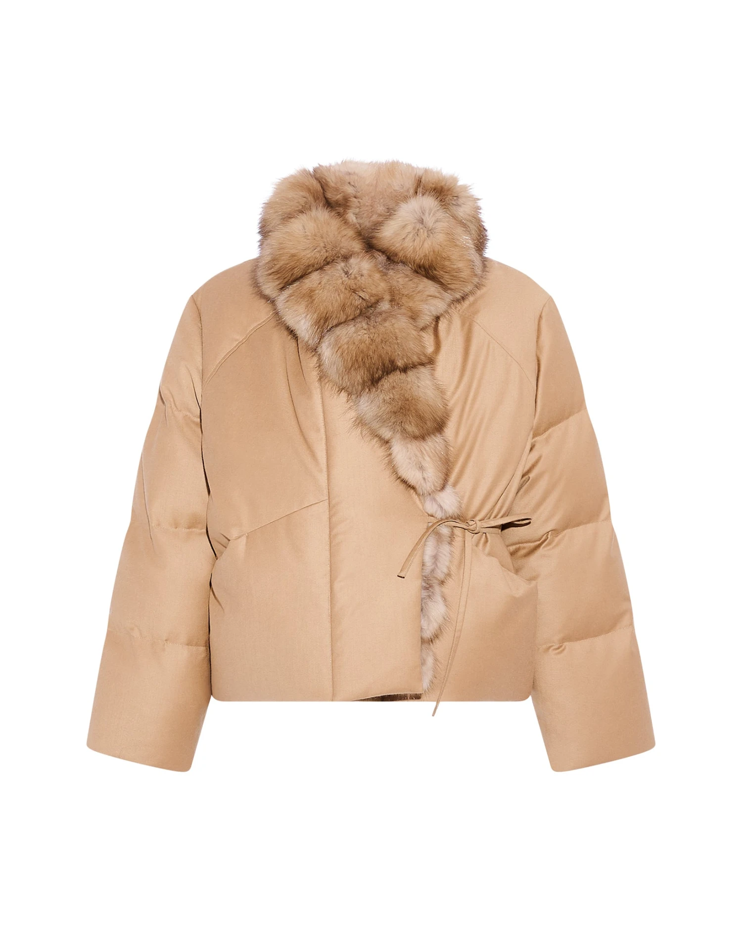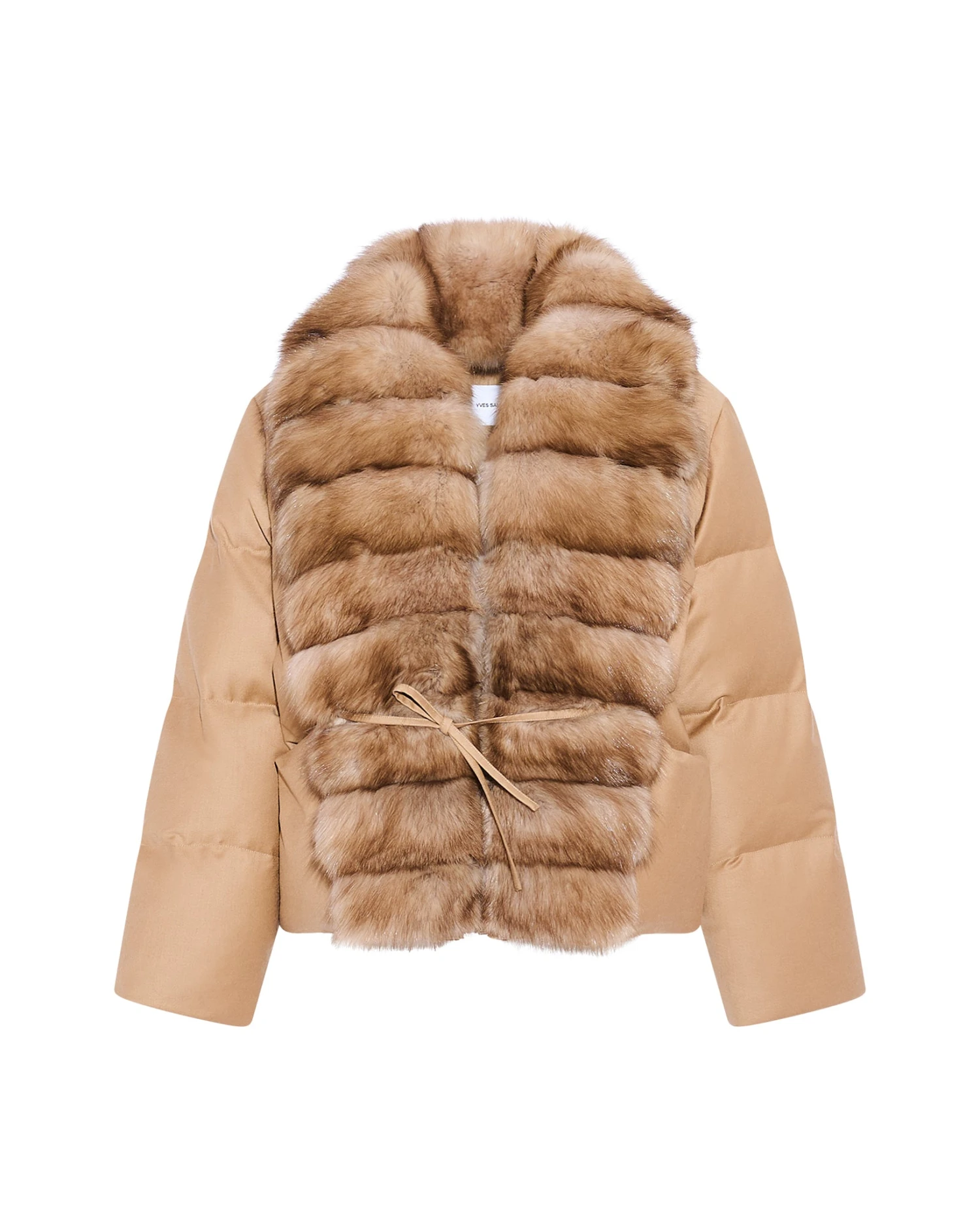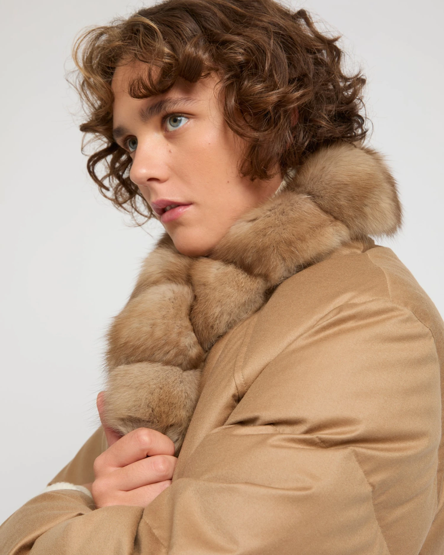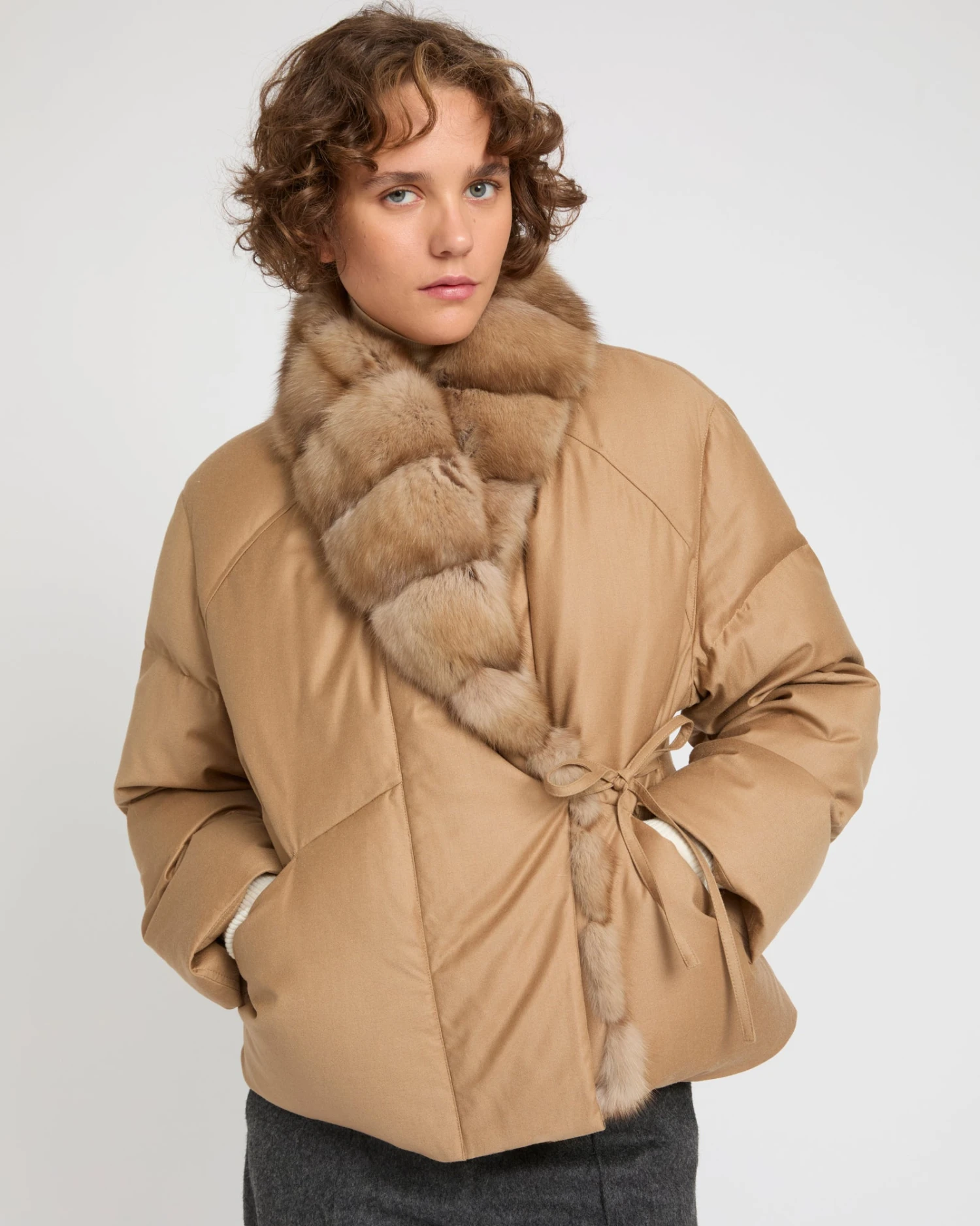 Une doudoune courte en flanelle Loro Piana qui joue les effets de style et de textures. Son tissu laine et soie Loro Piana utilise la technique Storm System pour garantir une parfaite protection contre les éléments. Sa fermeture avant asymétrique est zippée, mais peut également se nouer avec un lien pour dévoiler ou non le grand col amovible en fourrure de zibeline, avec sa matière noble et douce.