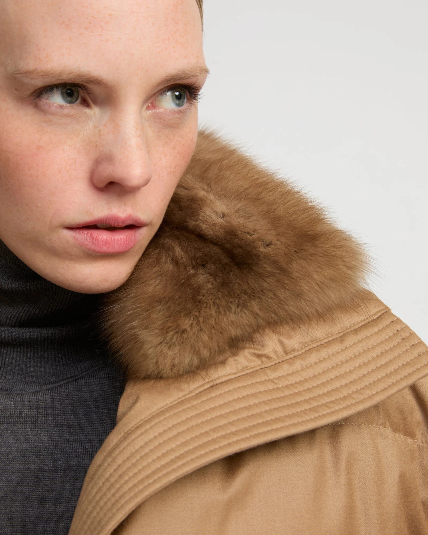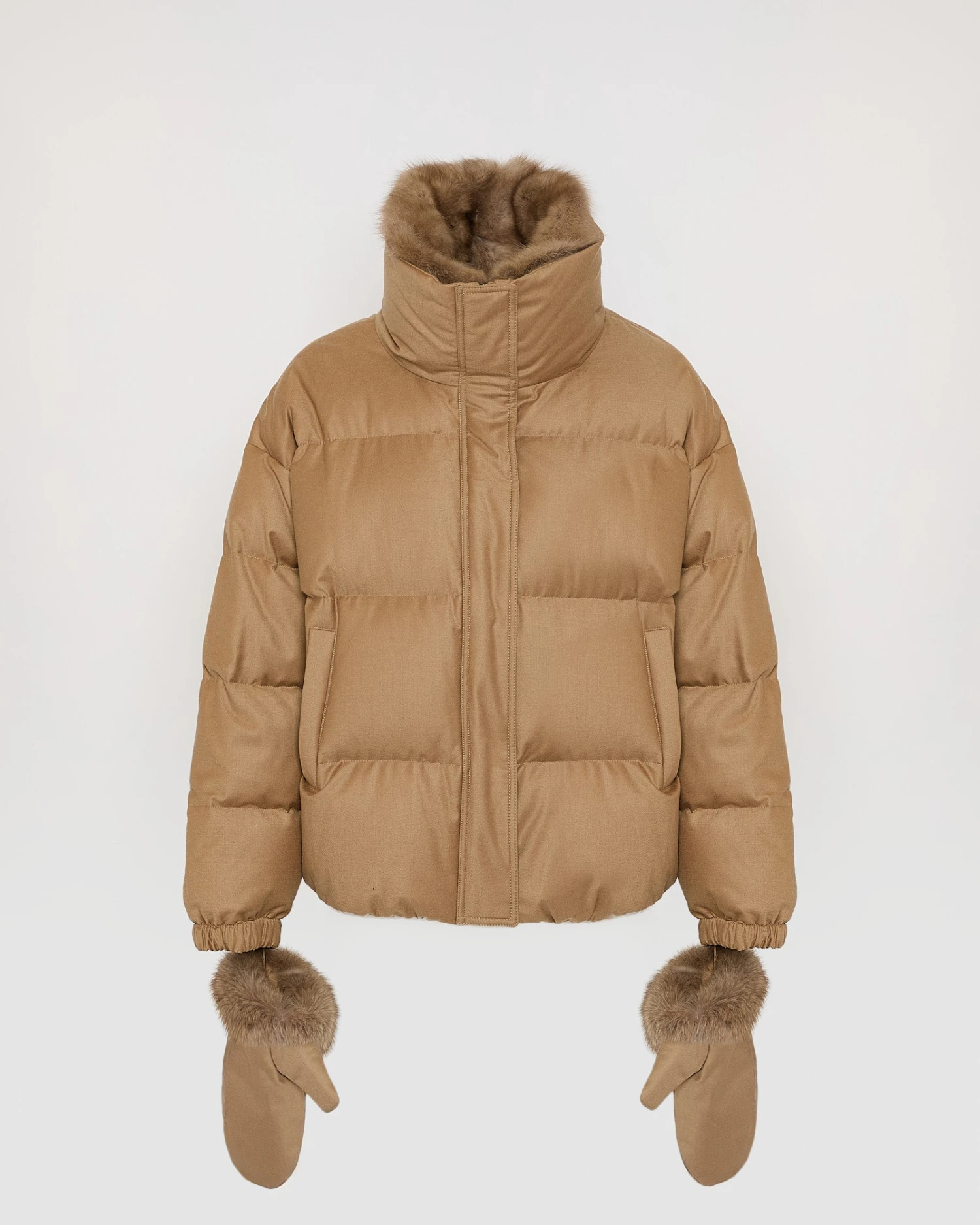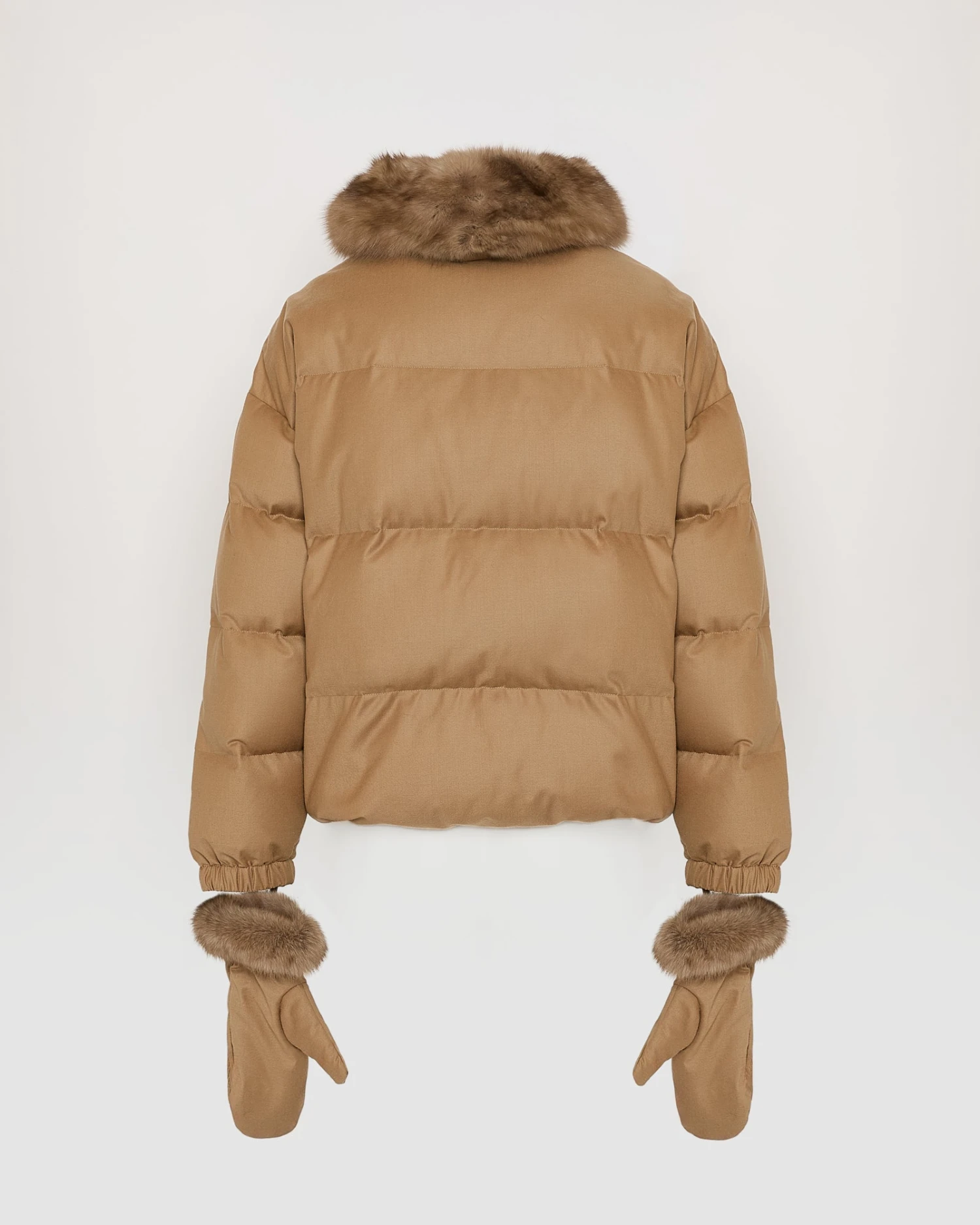 Alliance d’une matière en flanelle Loro Piana avec une finition technique, travaillée dans une forme doudoune longueur taille et de la zibeline luxueuse, qui vient se poser sur un col amovible. Pour plus de chaleur et de coordination, ce modèle propose des moufles assorties.