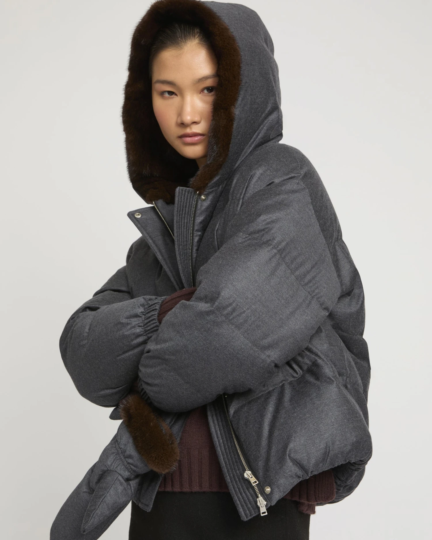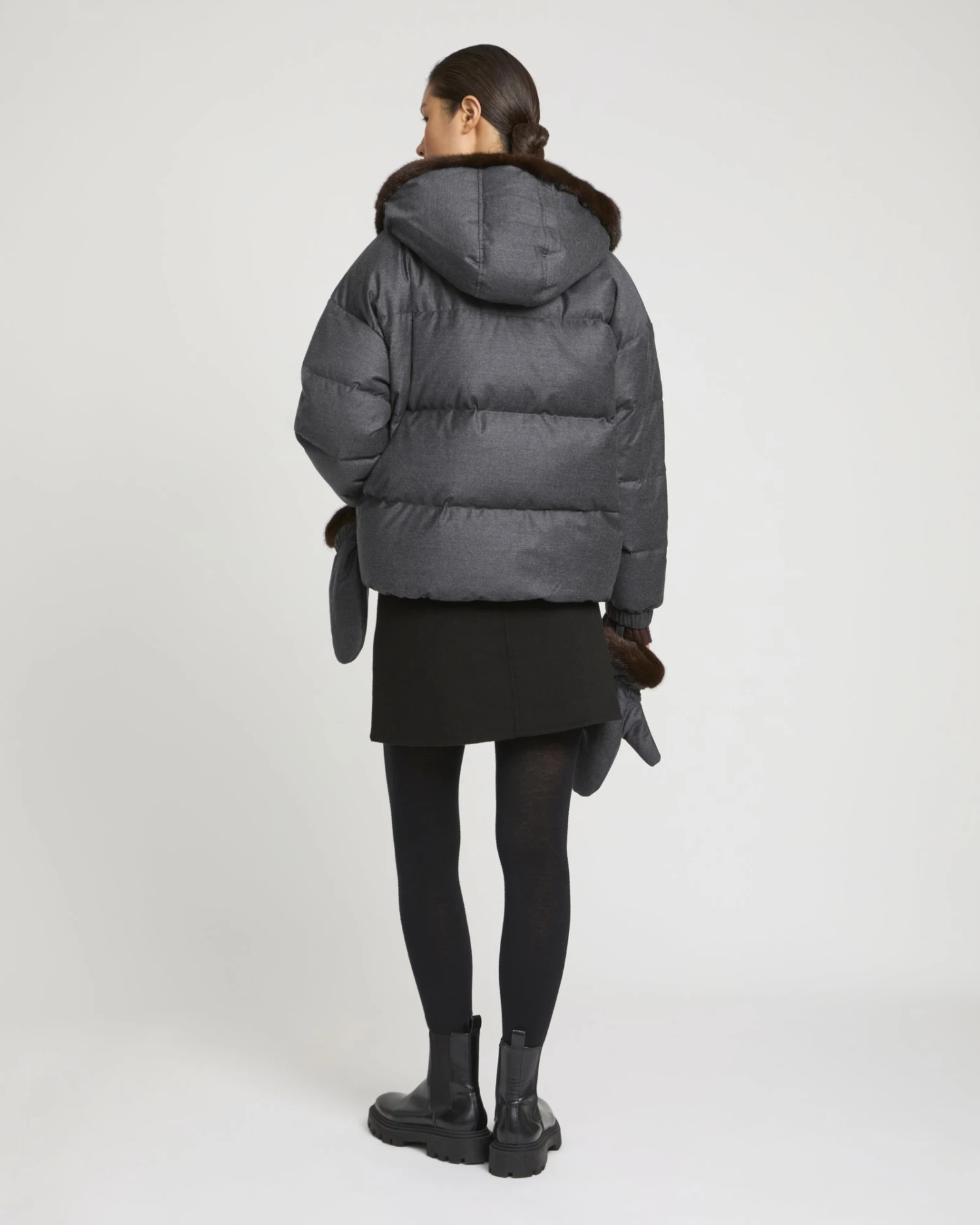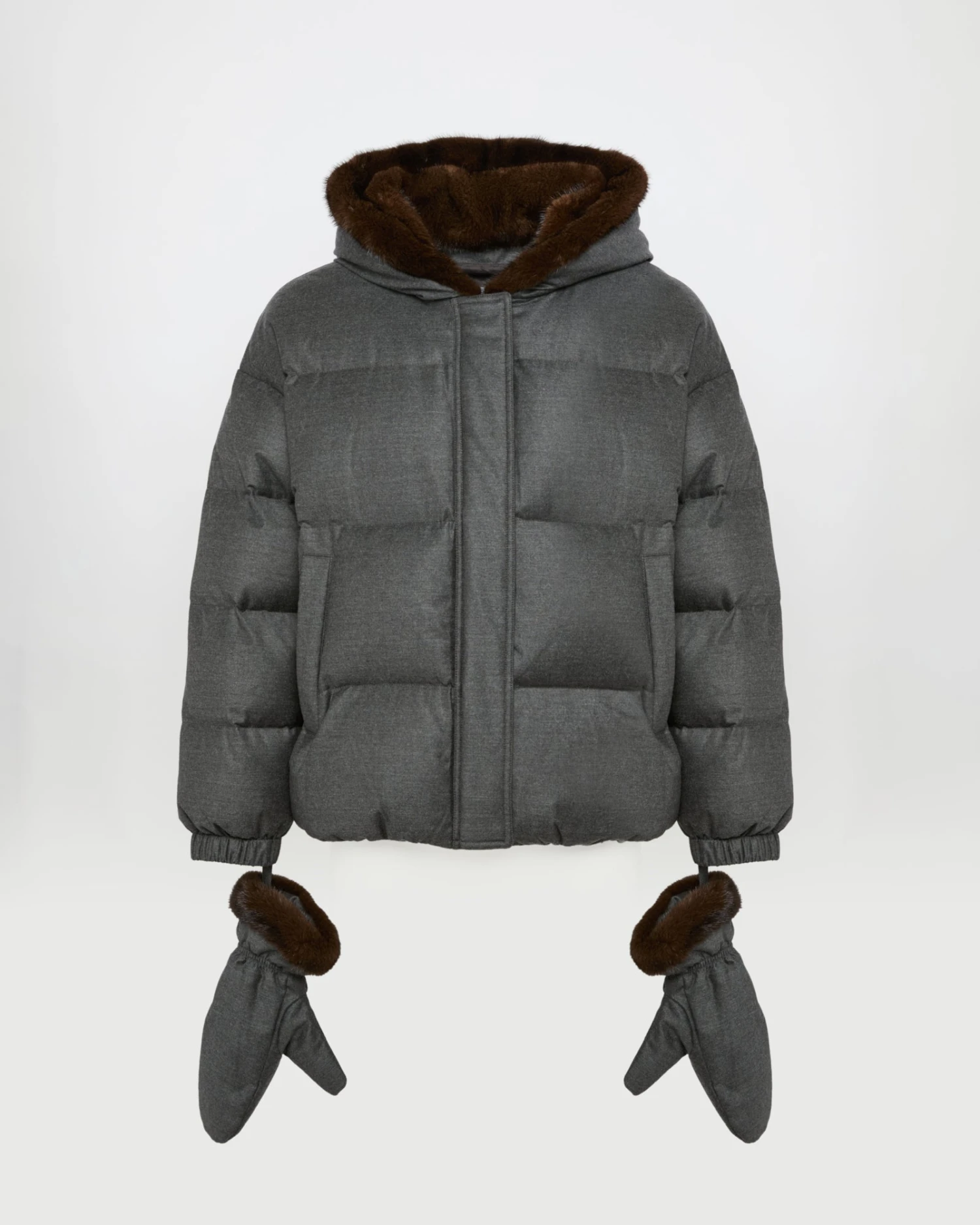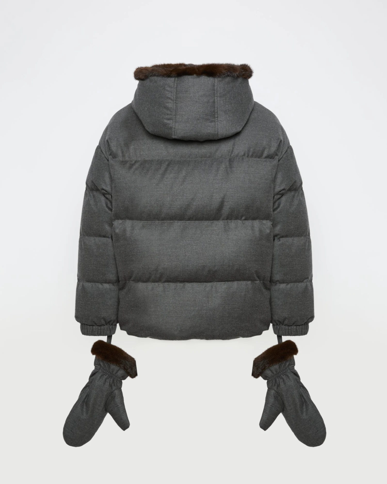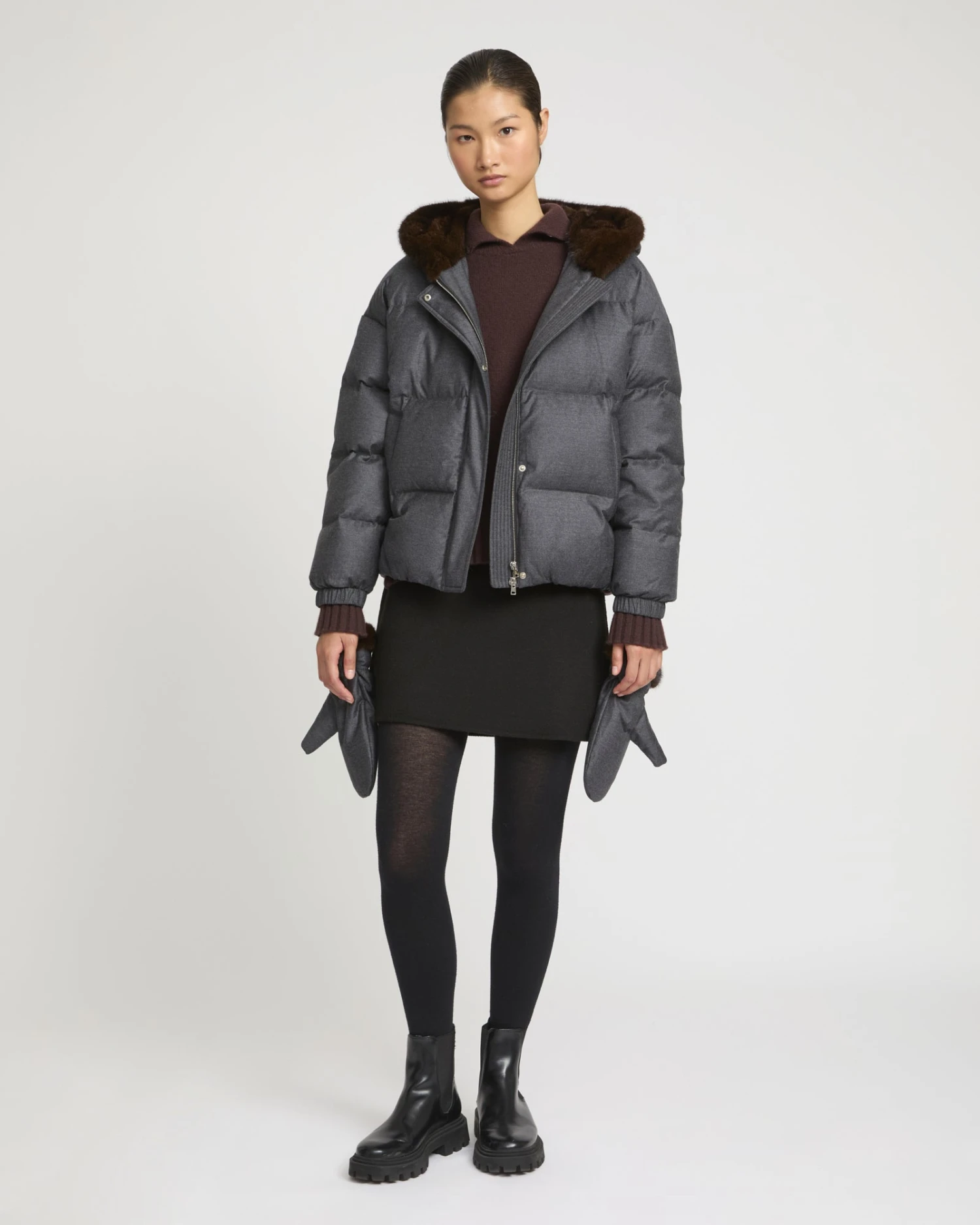 Réalisée dans un tissu flanelle Loro Piana, avec un tour et une doublure de capuche en fourrure de vison luxueuse et résistante, cette doudoune courte associe élégance et technicité. Son tissu Loro Piana utilise la technique Storm System pour garantir une parfaite protection contre les éléments. Les éléments en vison sont amovibles, à l’instar des moufles en tissu assorti, également avec une bordure vison, qui se clipsent à la veste pour plus d’aisance.