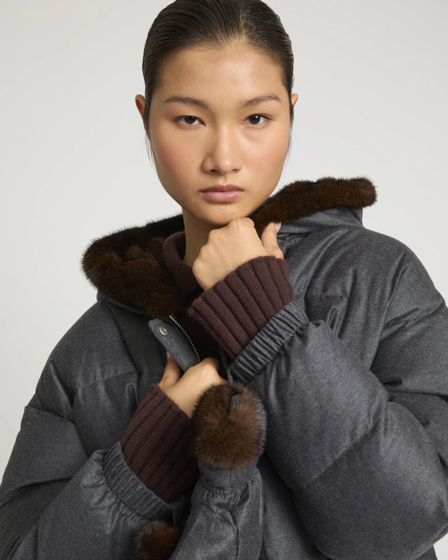 – Moufles en tissu flanelle avec bord en fourrure de vison amovibles