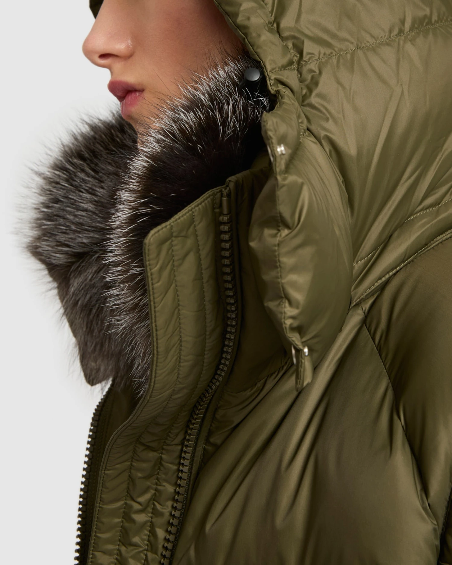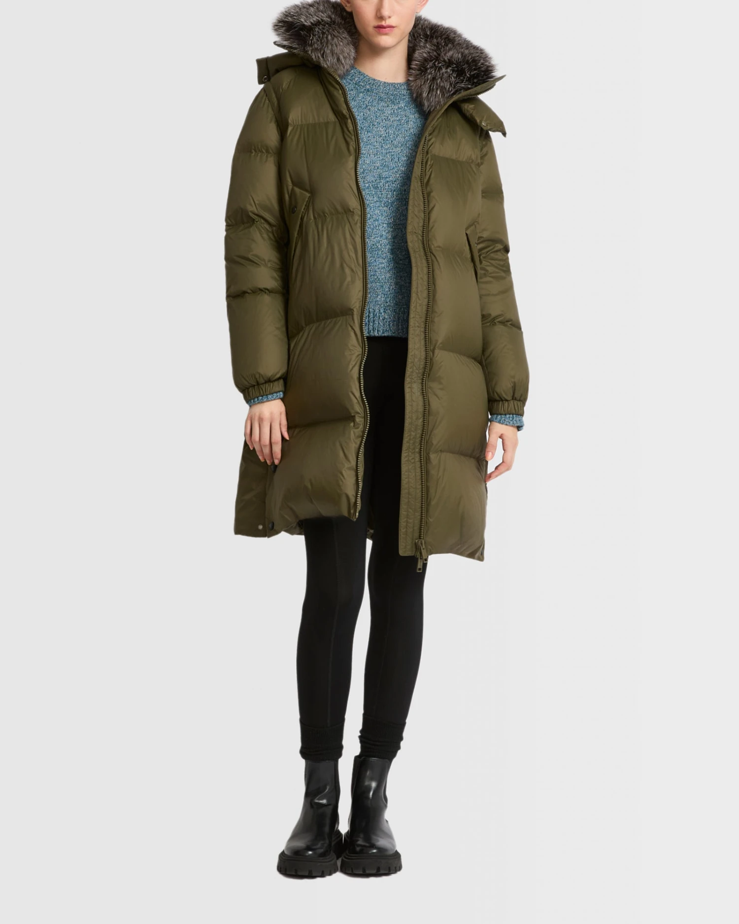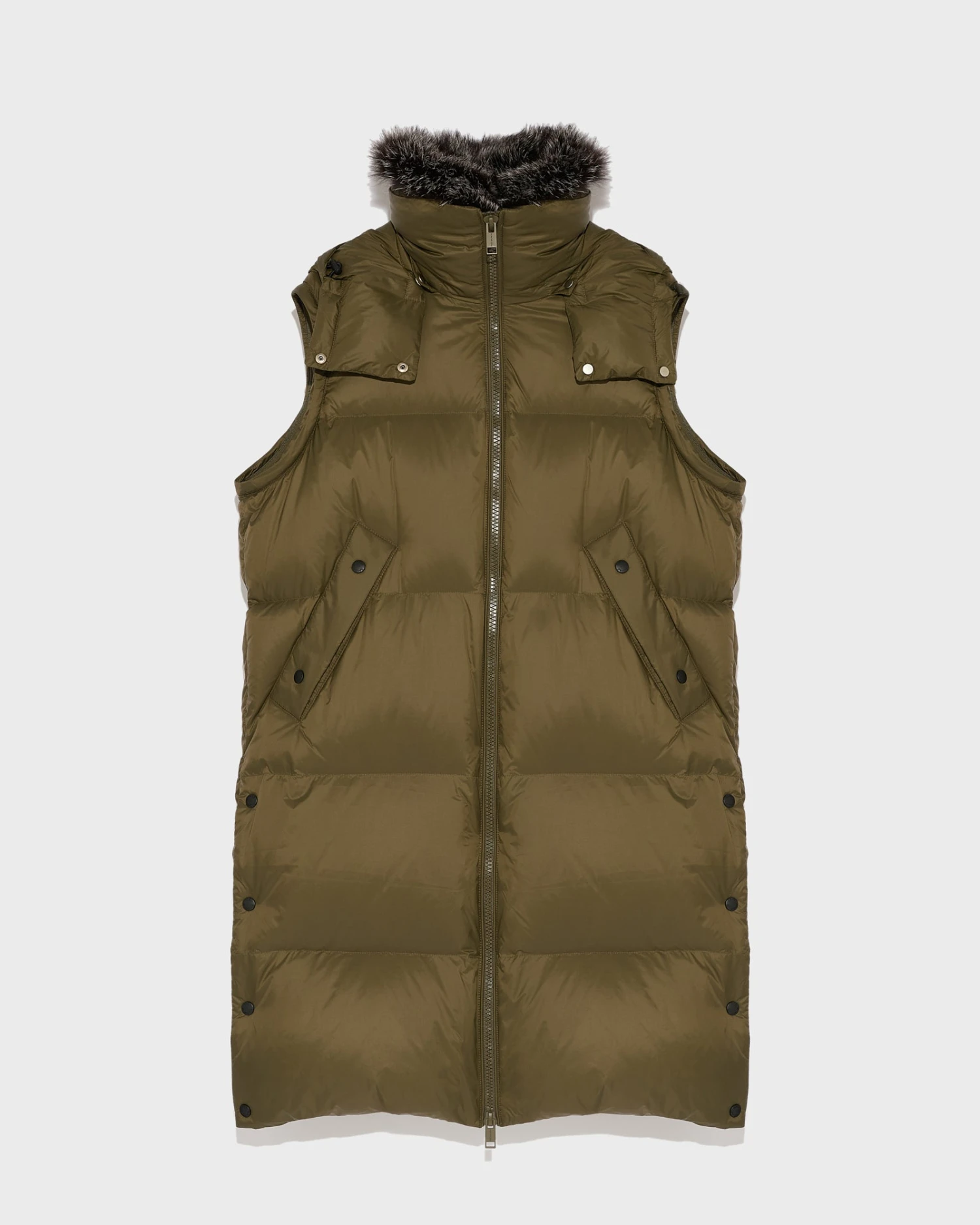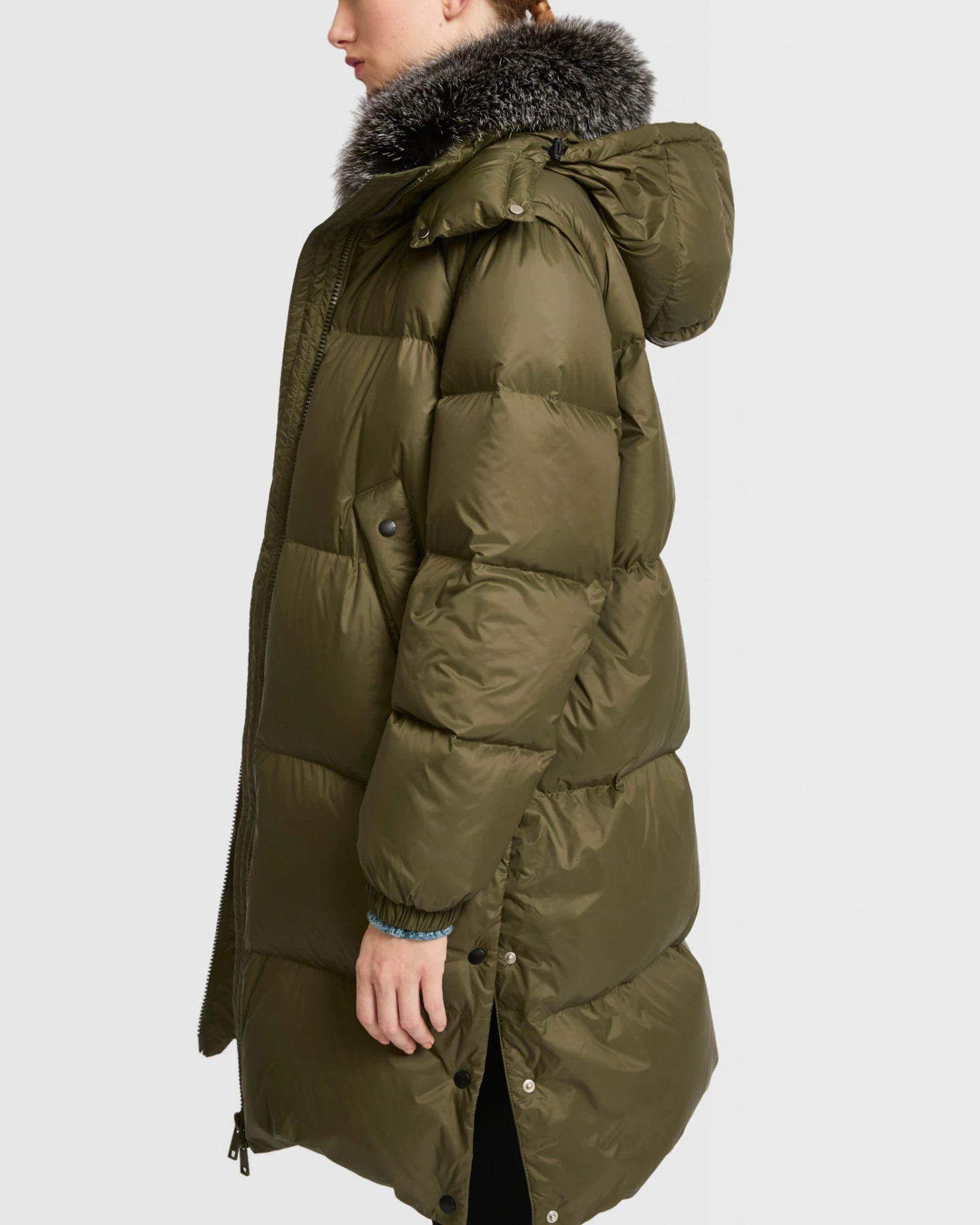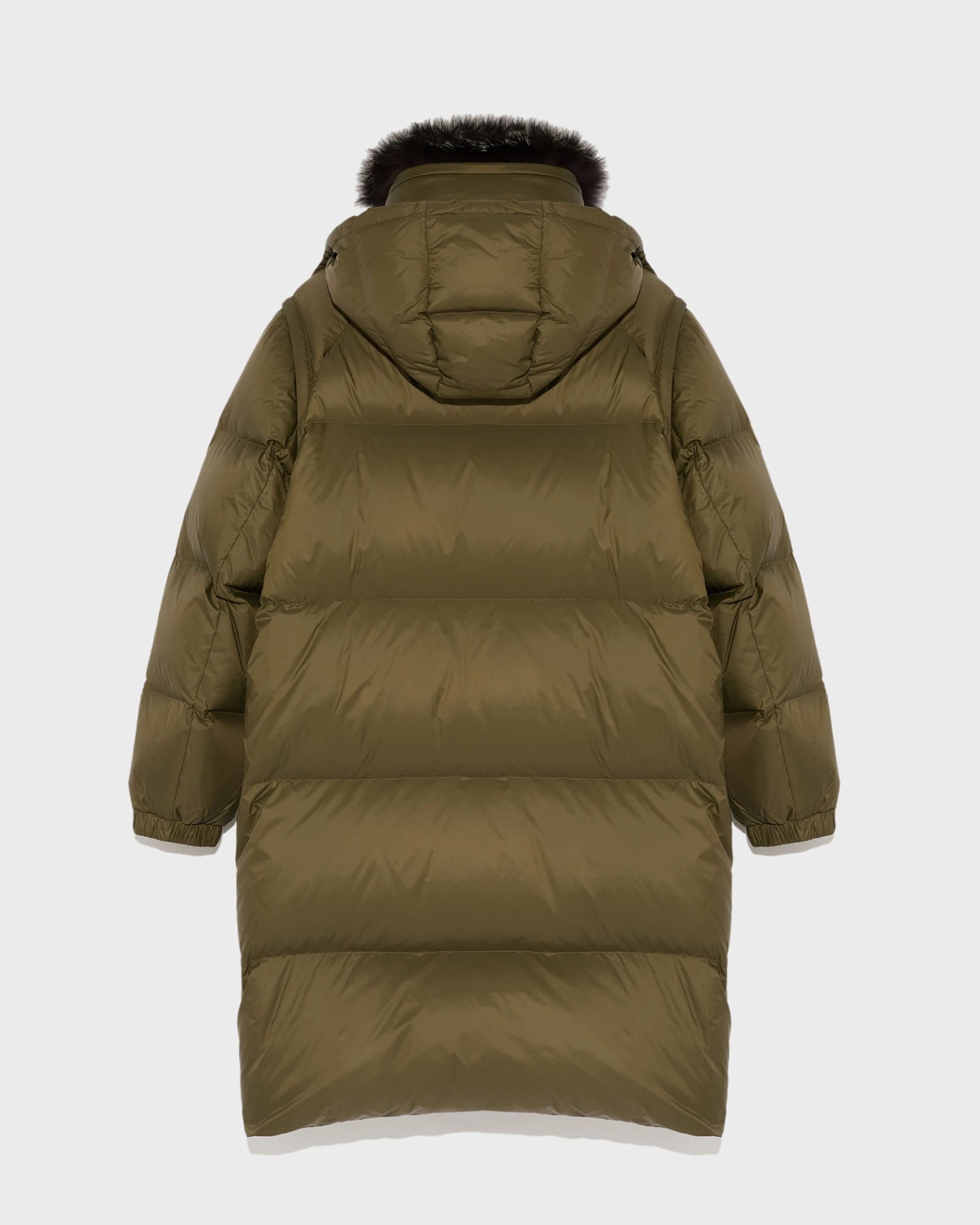 Parfaitement adaptée au grand froid, cette doudoune associe les qualités d’un tissu technique rembourré de duvet de haute qualité à l’élégance chaleureuse d’un col en renard amovible. Une capuche amovible, propose une protection supplémentaire. Versatile, cette pièce longueur genou peut également se transformer en gilet grâce à des manches qui se dézippent selon les besoins. Un lien à la taille permet de moduler le volume. Deux larges poches accueillent les mains.
