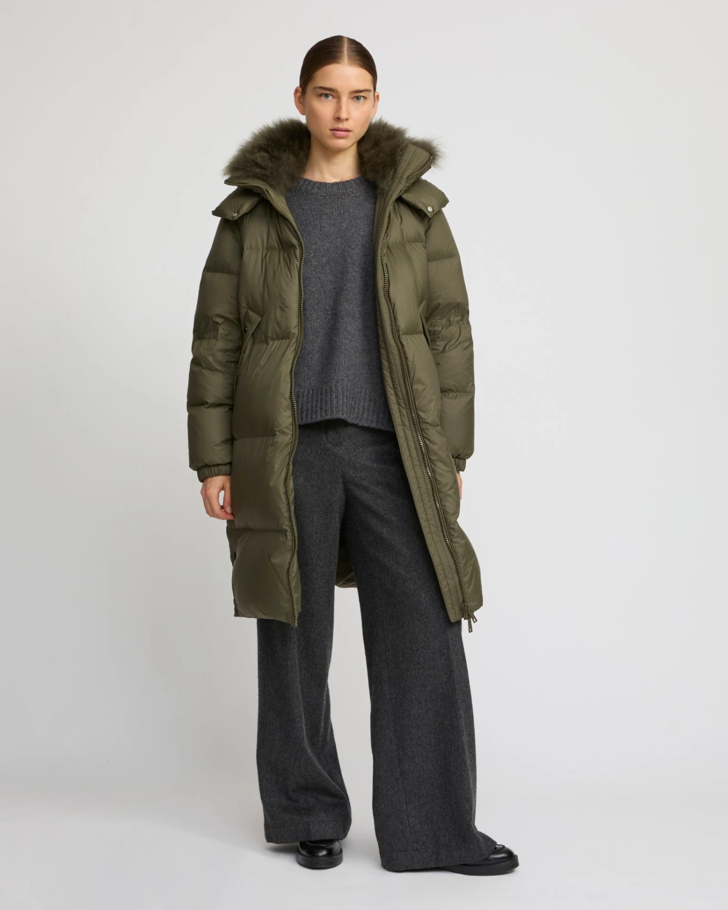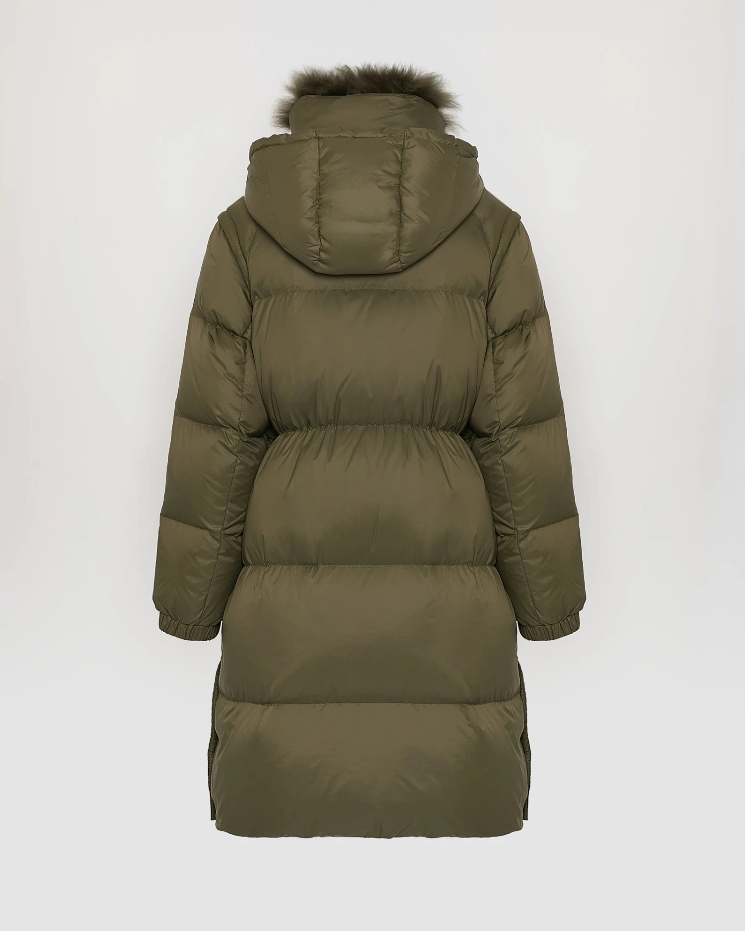 Une doudoune longue et enveloppante au style versatile qui reste légère et agréable à porter. Confectionné en tissu technique déperlant, ce modèle est garni de duvet et de plumes de canard de haute qualité pour garantir chaleur et respirabilité. Les détails de conception comprennent une fermeture zippée, deux larges poches passepoilées, des poignets élastiqués ainsi que des fentes côtés pressionnées et un lien de resserrage à la taille pour ajuster la silhouette. Dotée d’une capuche détachable et d’une garniture de col amovible en agneau à poils longs défrisés au toucher cachemire, cette doudoune allie le confort à l’élégance. Les manches peuvent également se détacher pour s’adapter au style et à la saison.