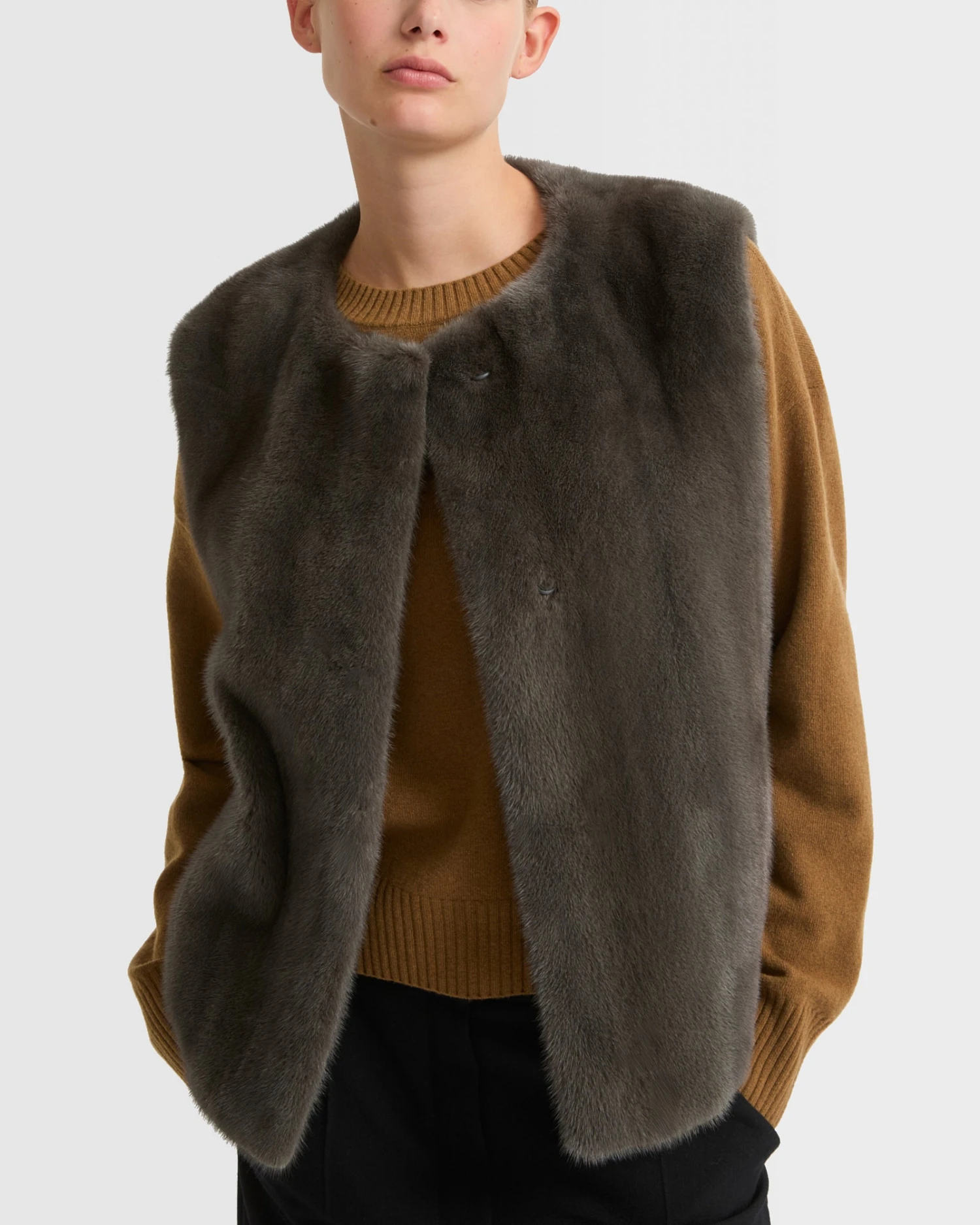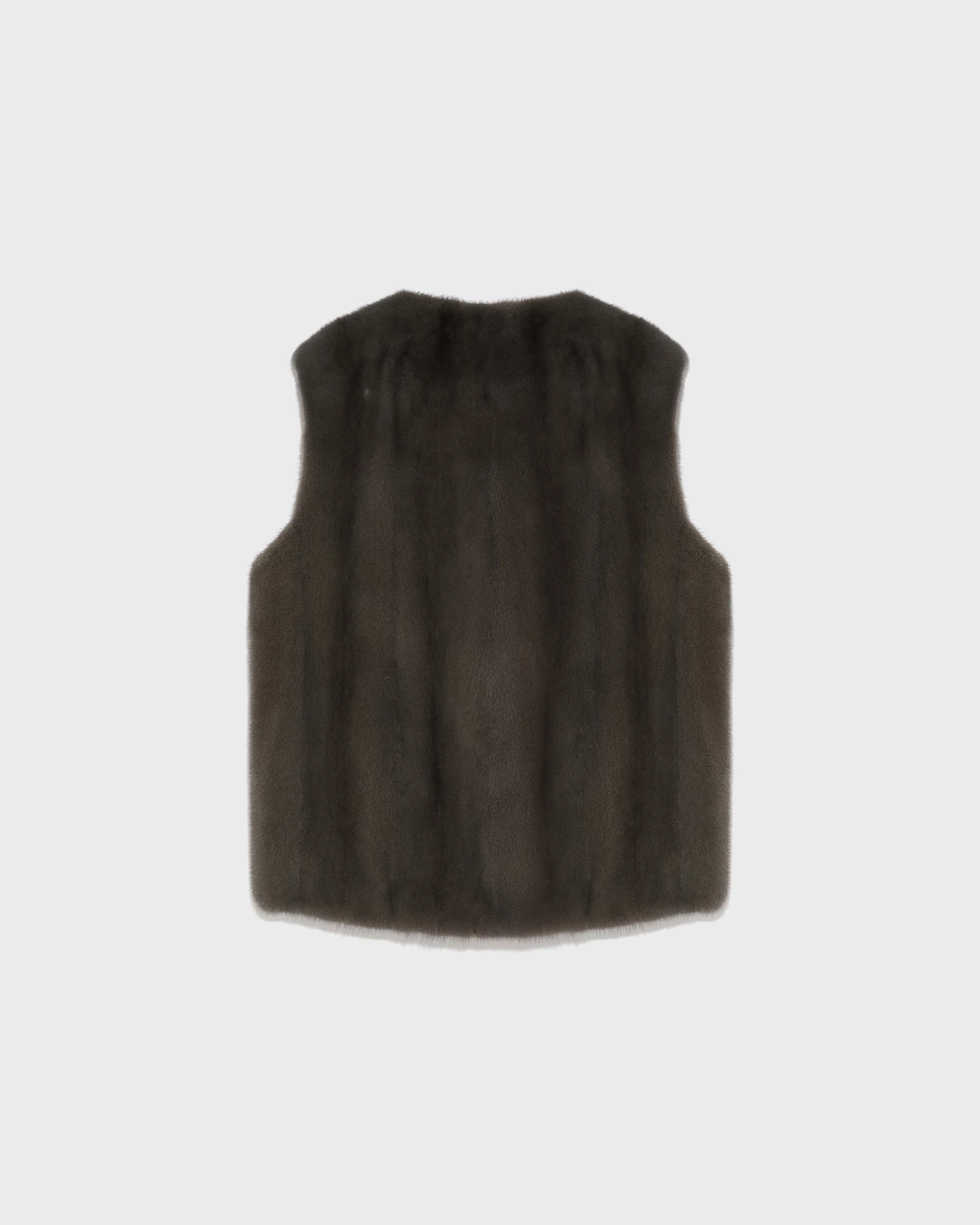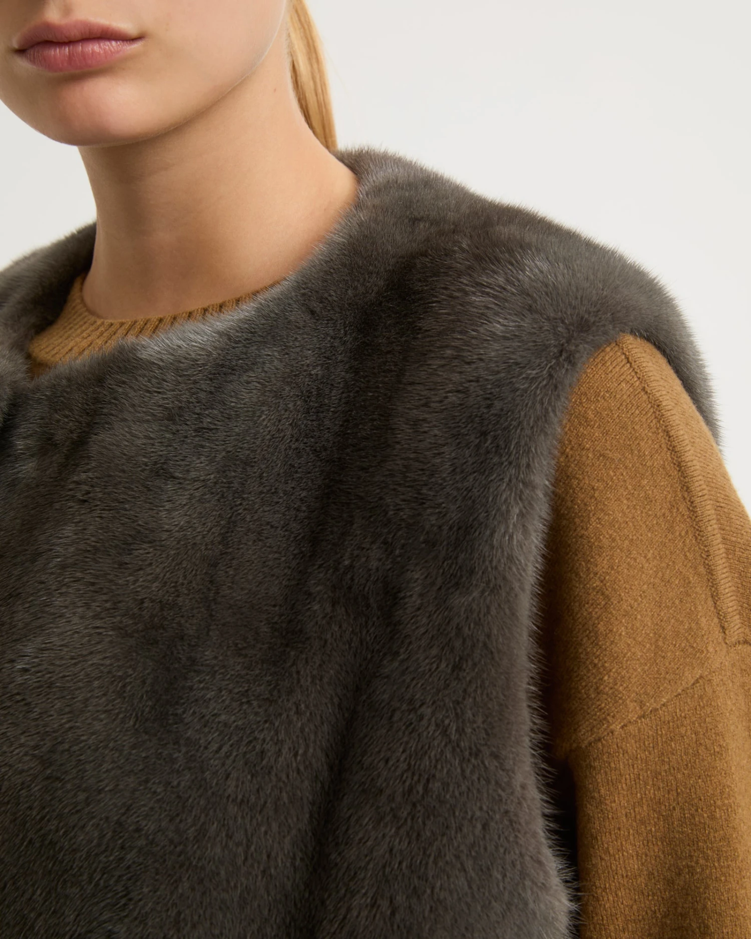 Avec sa forme légèrement « boxy » et sa coupe sans manches, ce petit gilet en vison apporte une touche finale chaleureuse et sophistiquée à toute tenue. Ses lignes contemporaines peuvent se porter en superposition d’une veste ou d’un manteau, ou venir se glisser en dessous. Deux poches accueillent les mains.