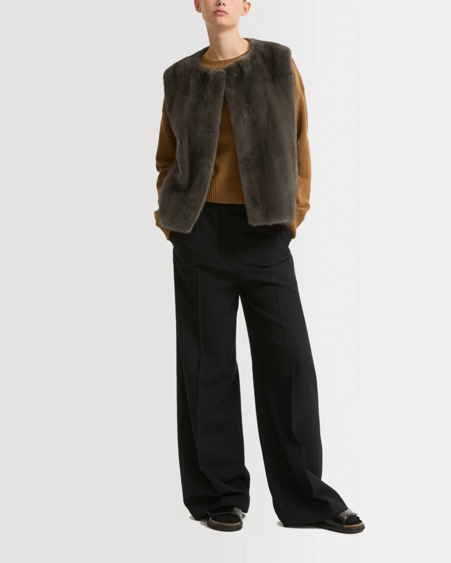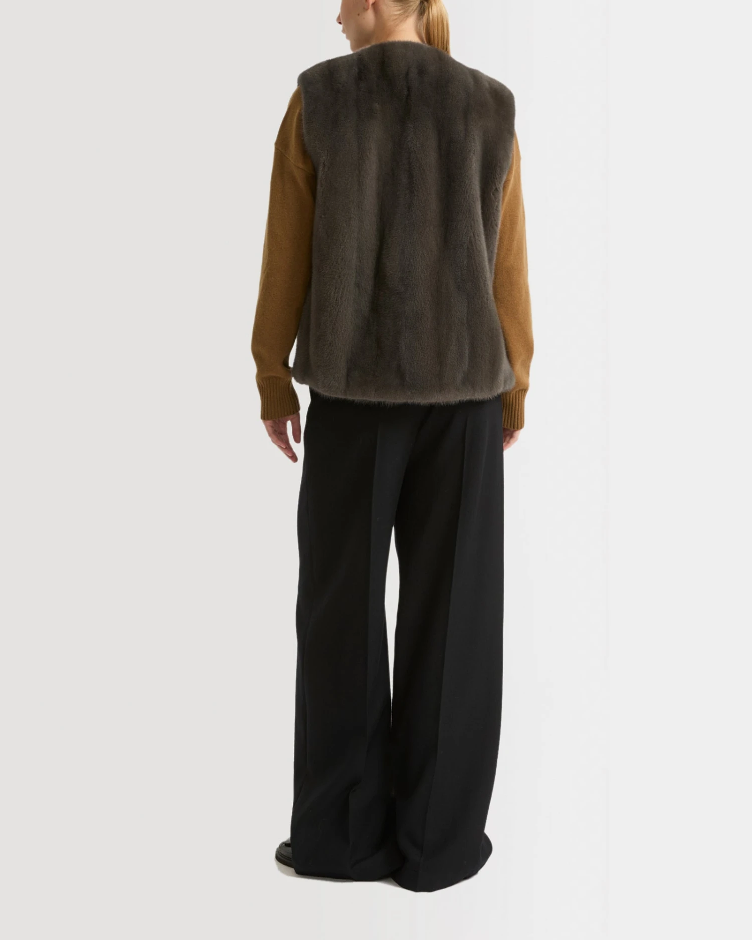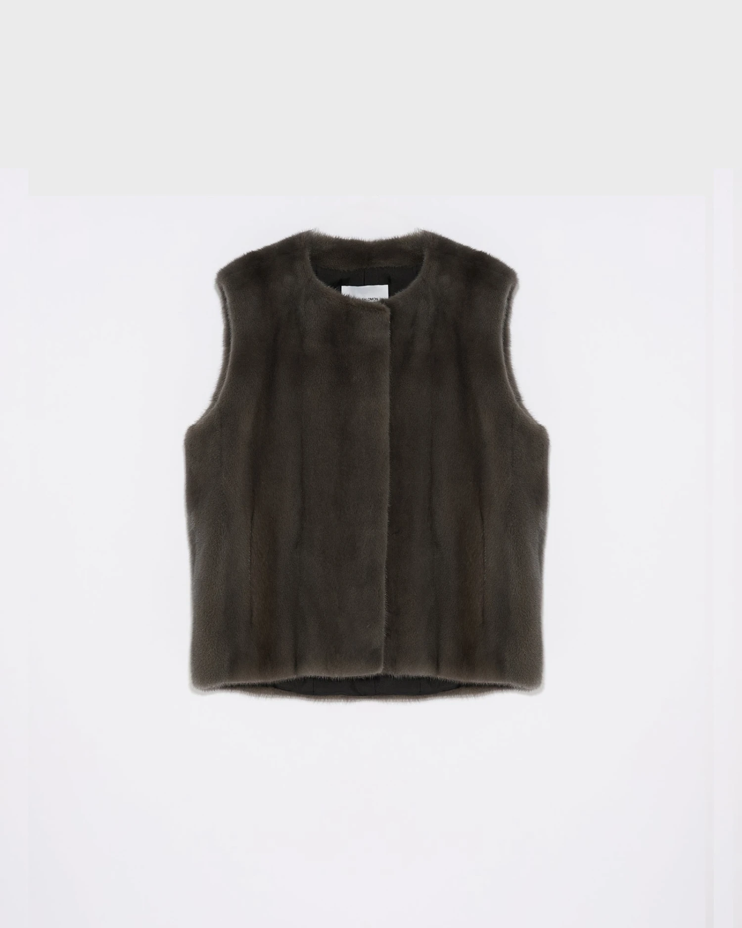 Avec sa forme légèrement « boxy » et sa coupe sans manches, ce petit gilet en vison apporte une touche finale chaleureuse et sophistiquée à toute tenue. Ses lignes contemporaines peuvent se porter en superposition d’une veste ou d’un manteau, ou venir se glisser en dessous. Deux poches accueillent les mains.