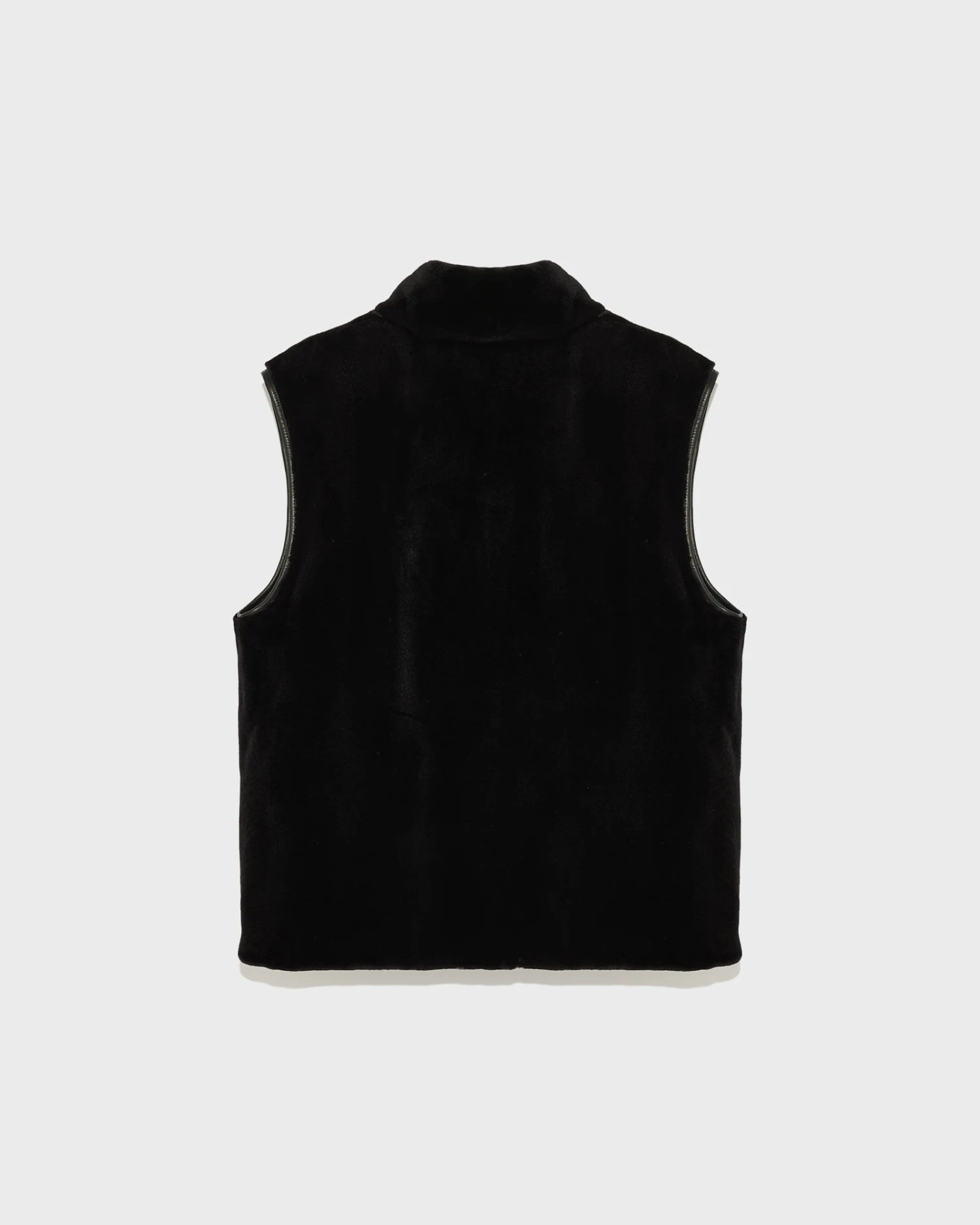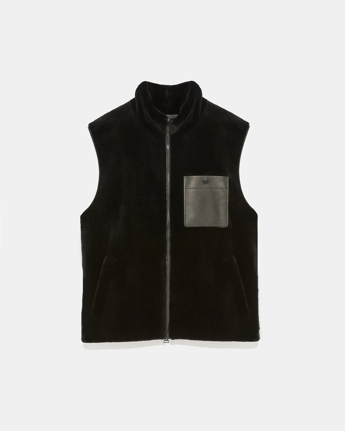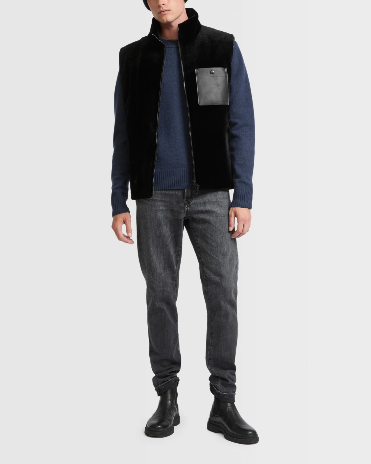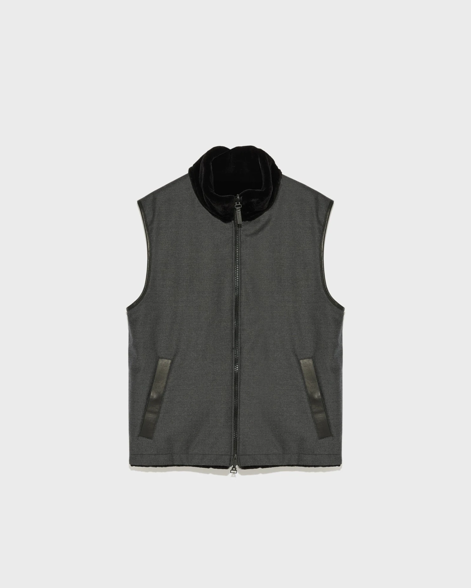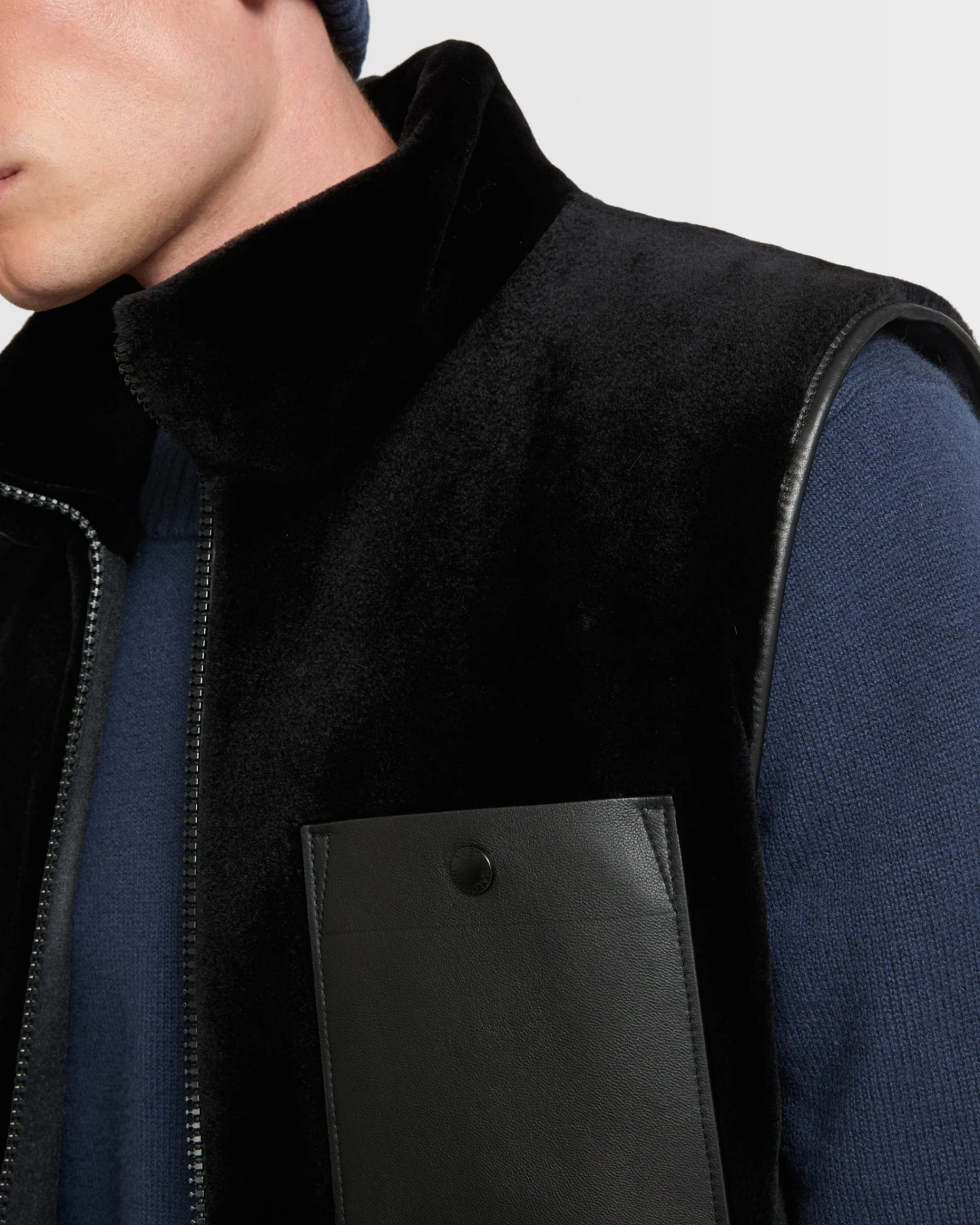 Un gilet versatile qui vient compléter n’importe quelle tenue, proposant deux faces élégantes, qu’il s’agisse du côté en tissu technique Loro Piana ou de celui en vison rasé. Deux poches basses accueillent les mains, et des détails en cuir au niveau des emmanchures et du zip apportent une touche de style en plus.