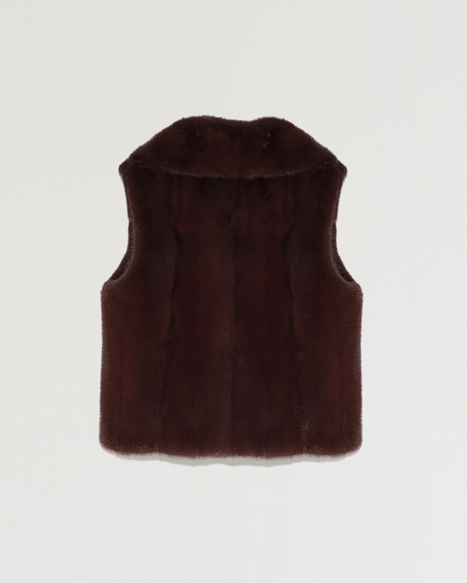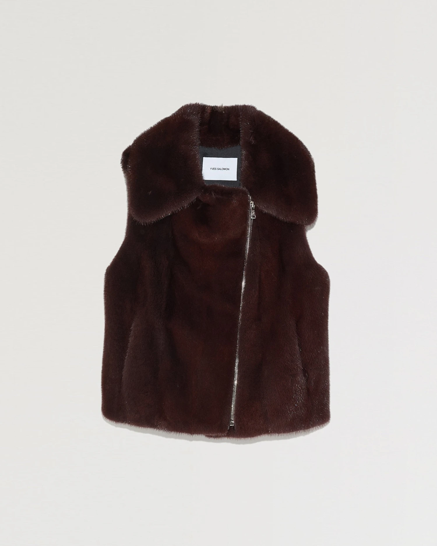 Une forme d’inspiration perfecto pour ce petit gilet sans manches en vison. Large col, coupe près du corps, deux poches côté. Des finitions en cuir sur le col et la glissière du zip avant apportent une touche rock. Fermeture en diagonale à l’avant.