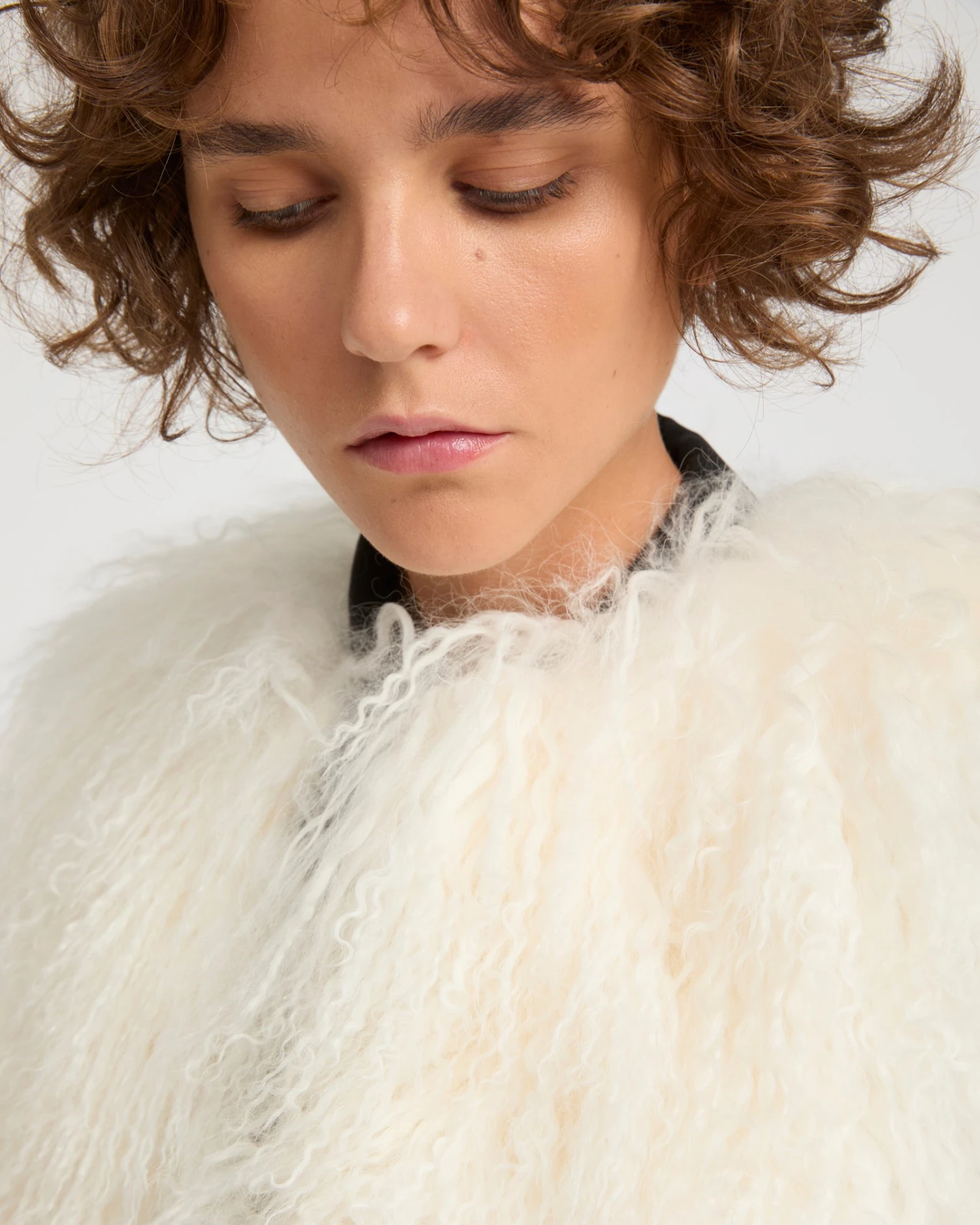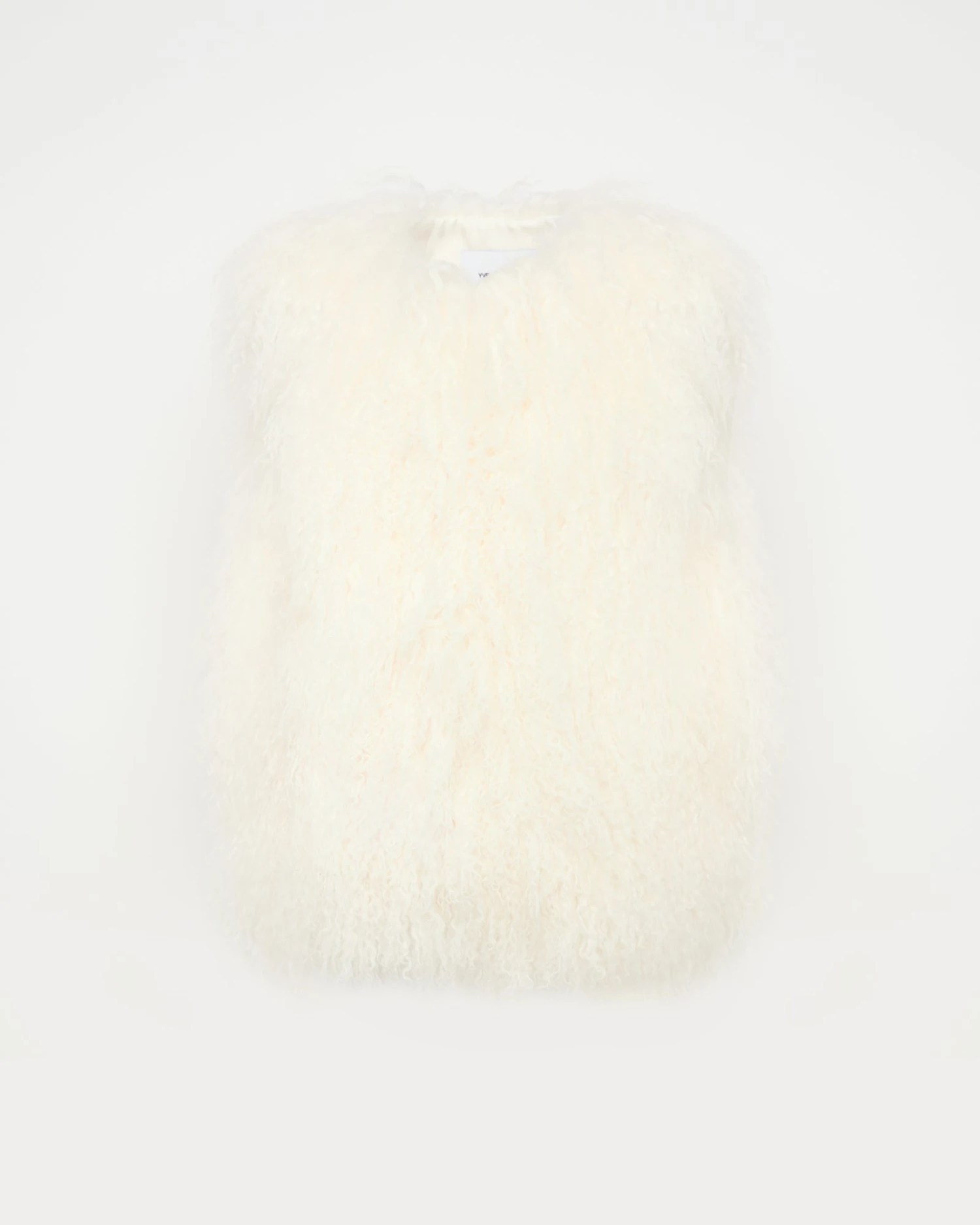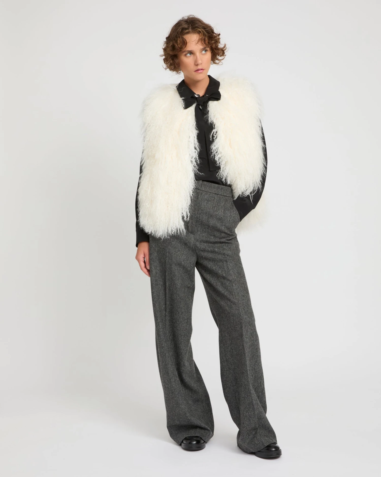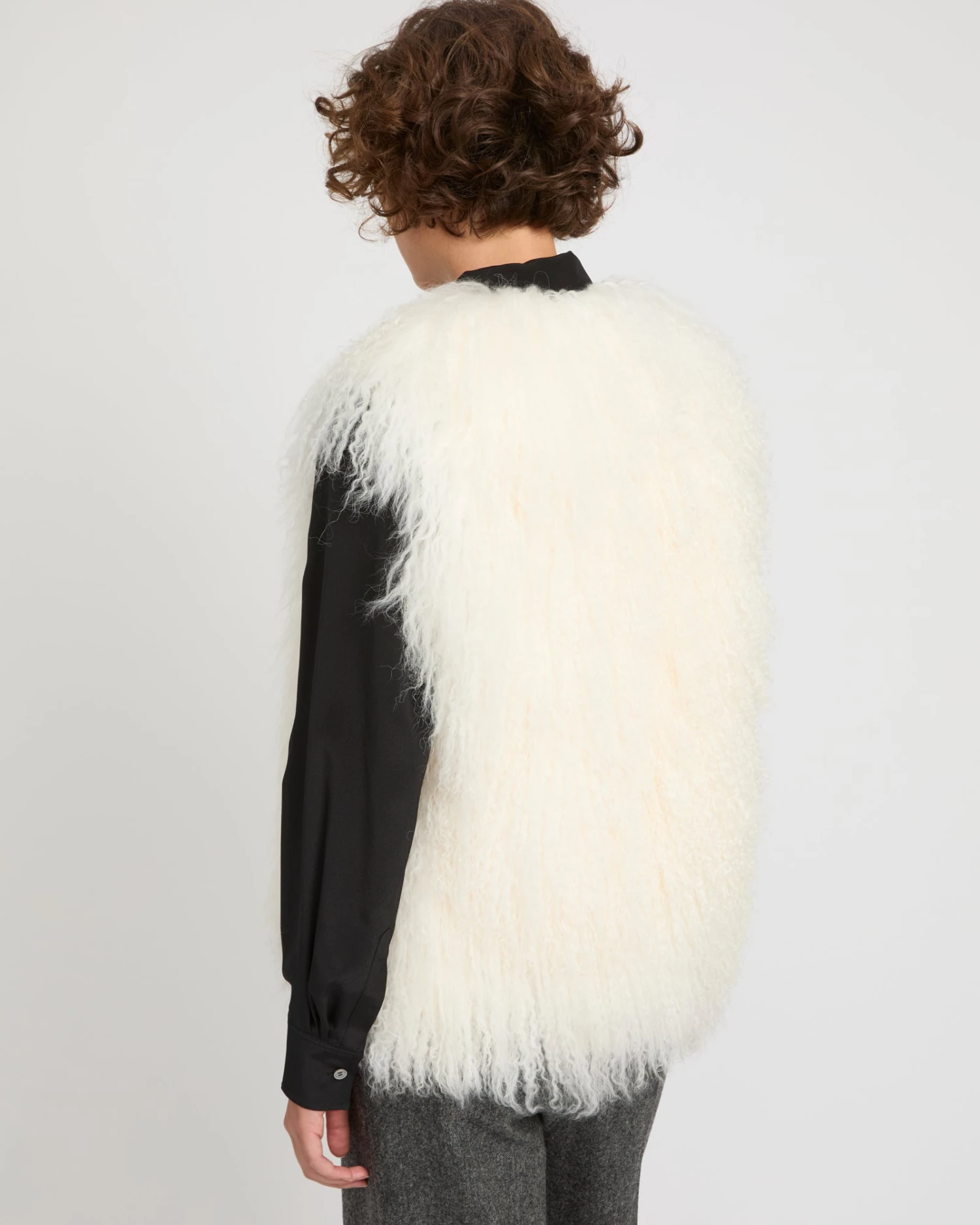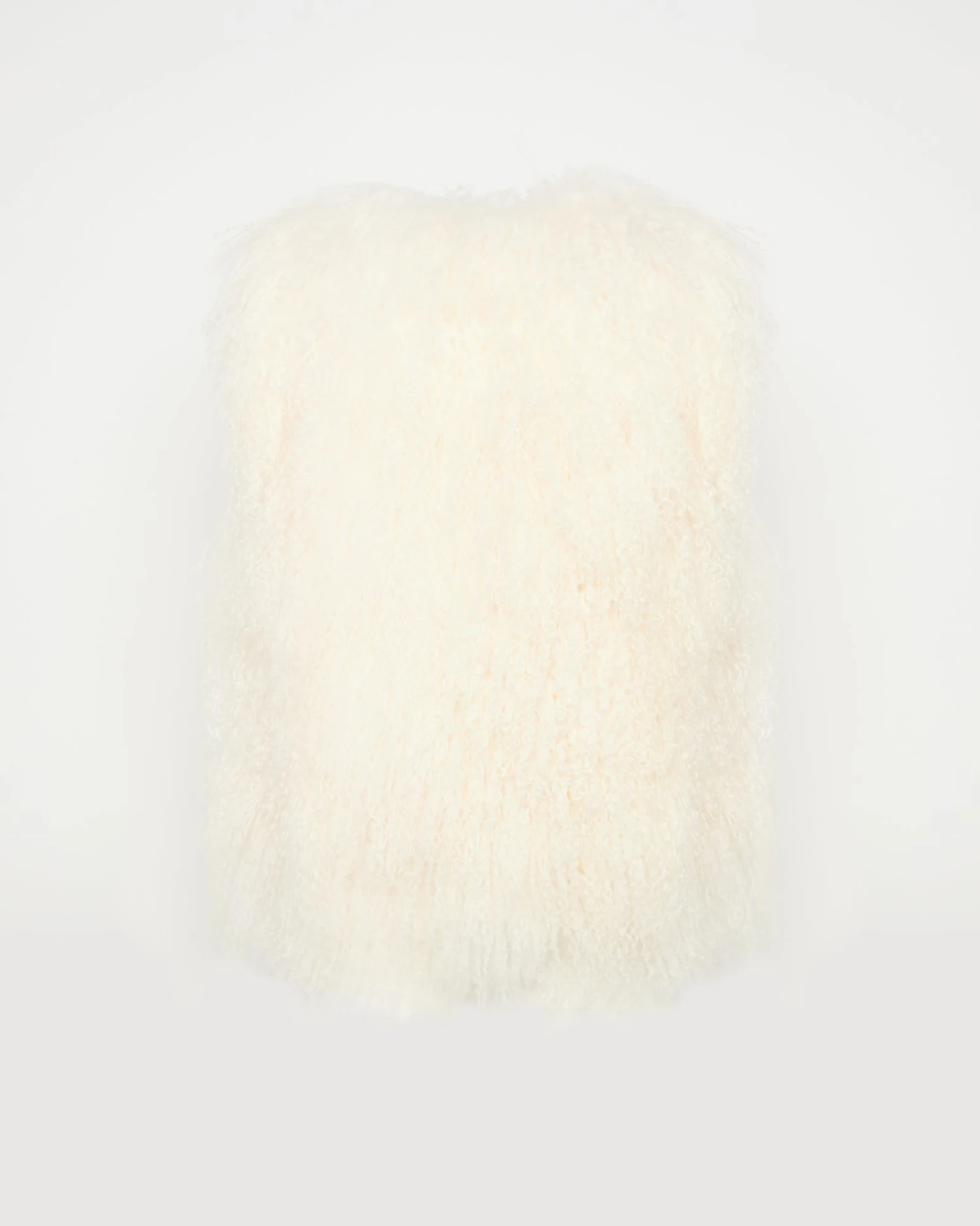 Le poil long et soyeux de l’agneau de Mongolie apporte sa texture ludique et aérienne à un gilet sans manches, dont les lignes épurées mettent en valeur le gonflant de la matière et le savoir-faire Yves Salomon.