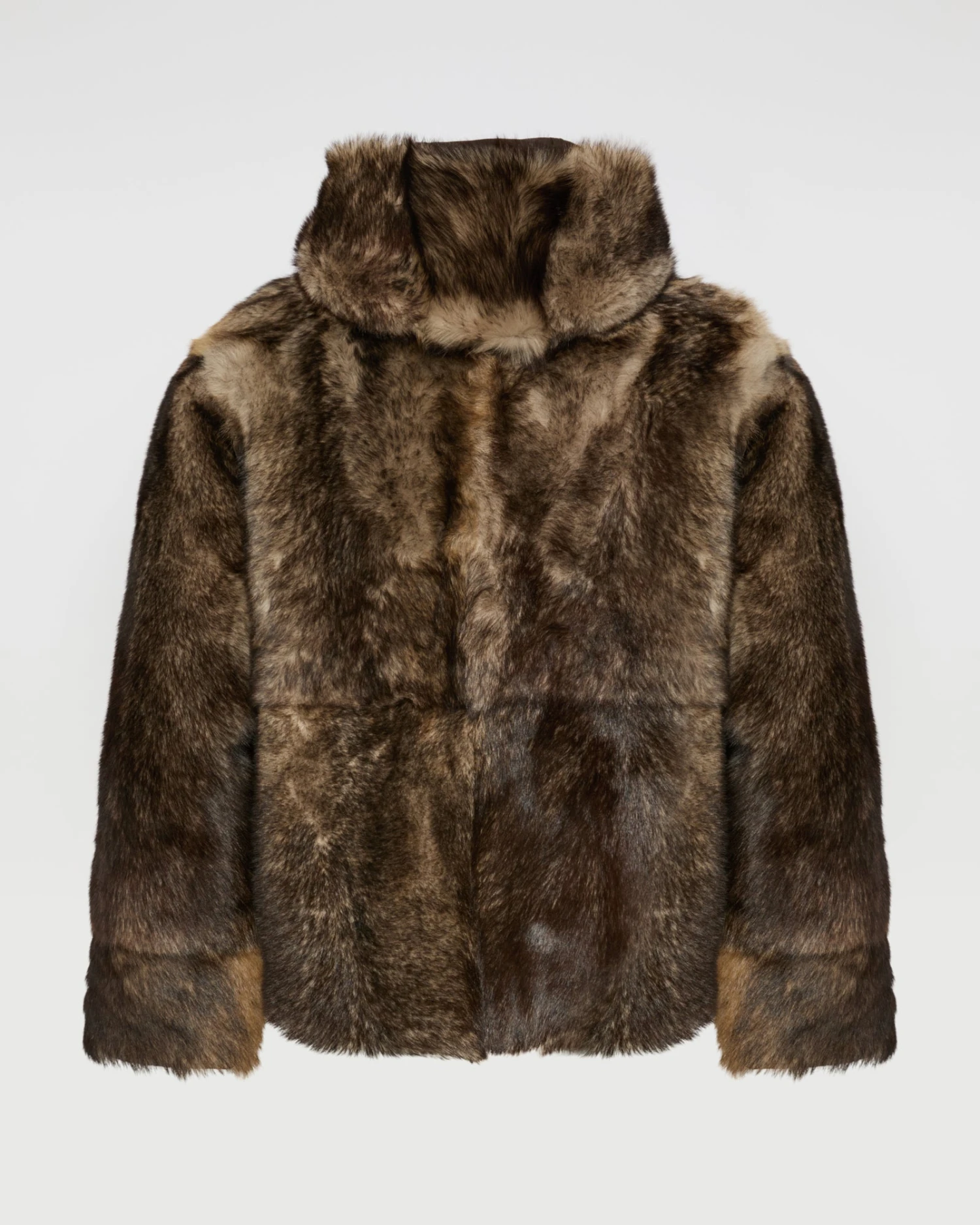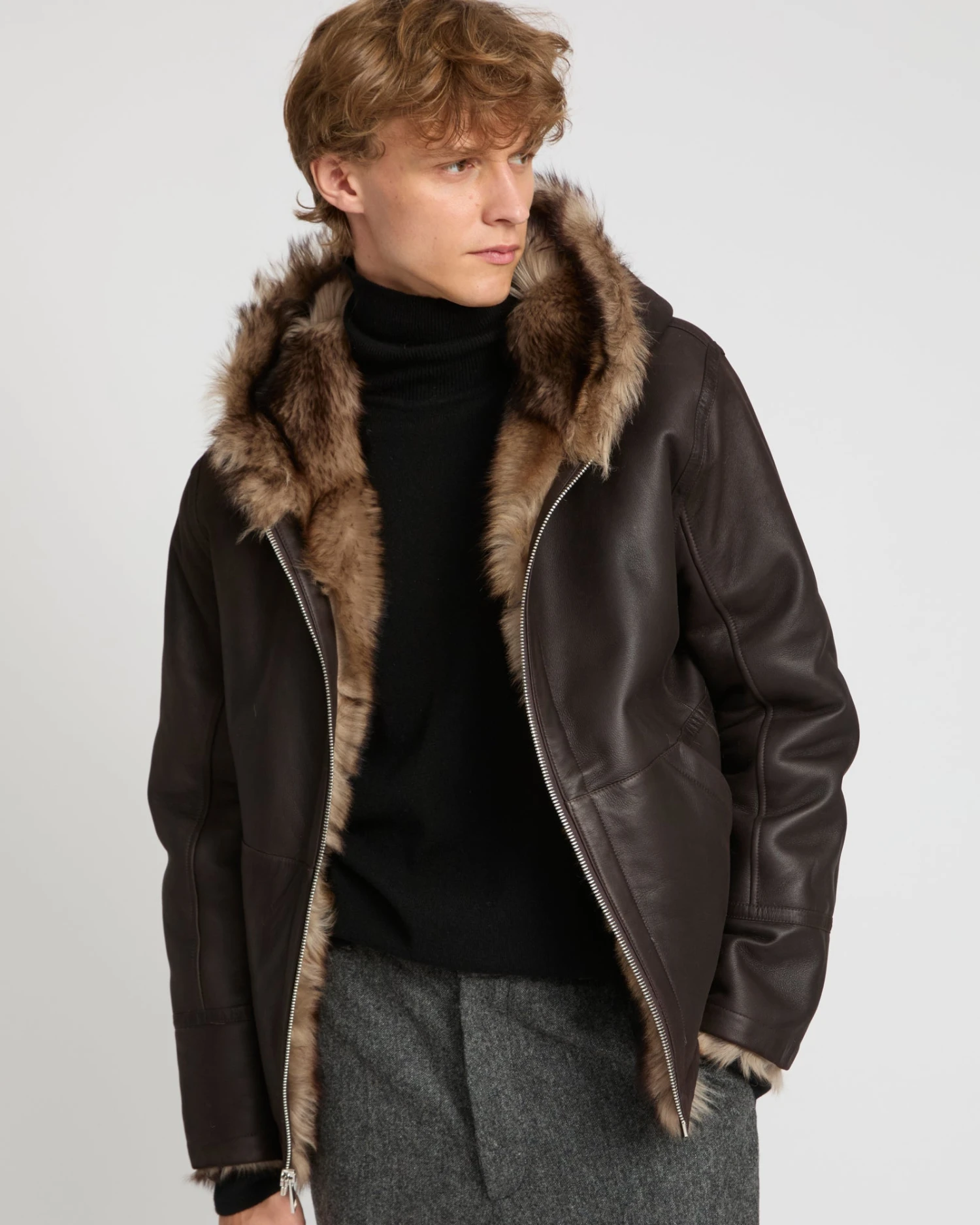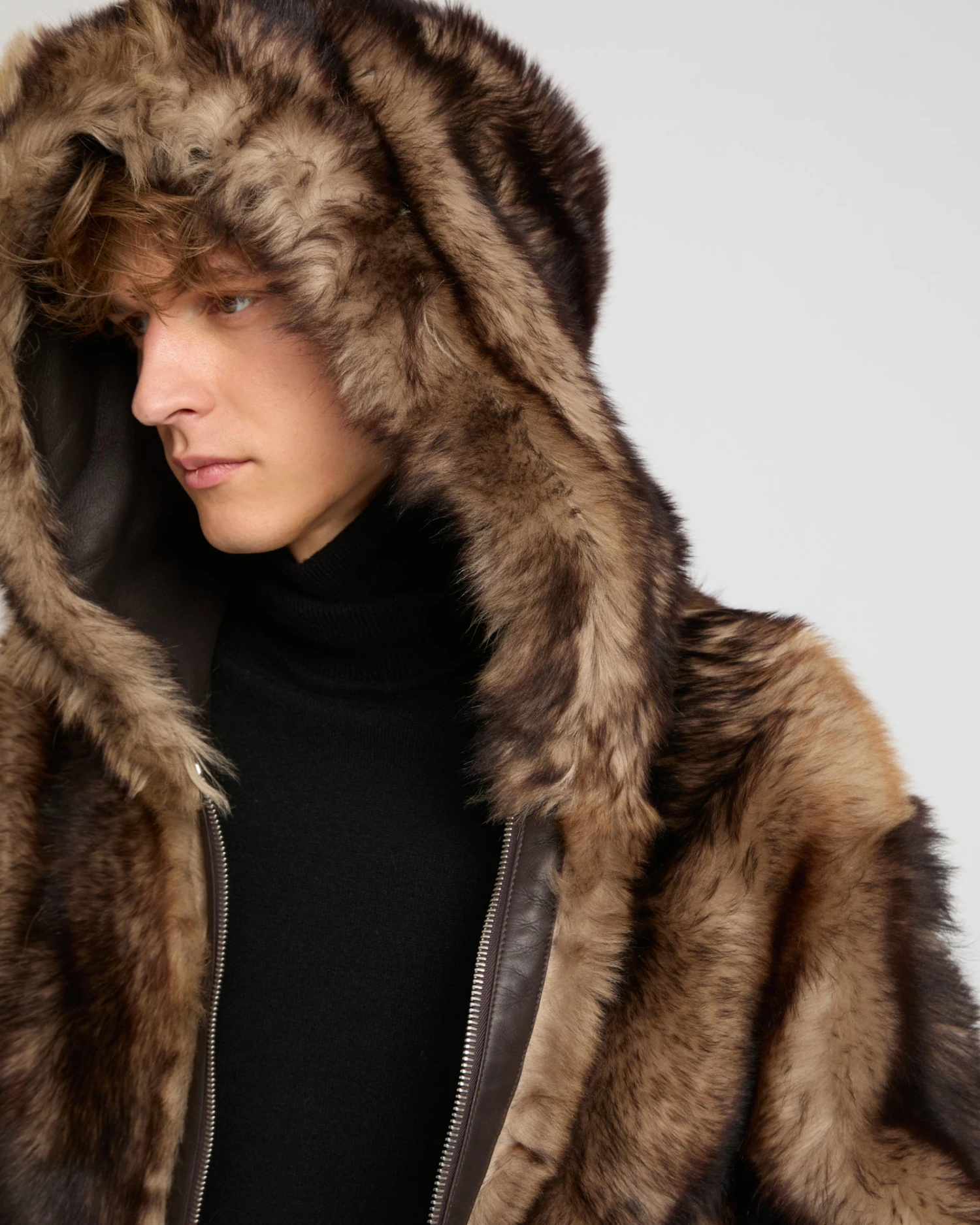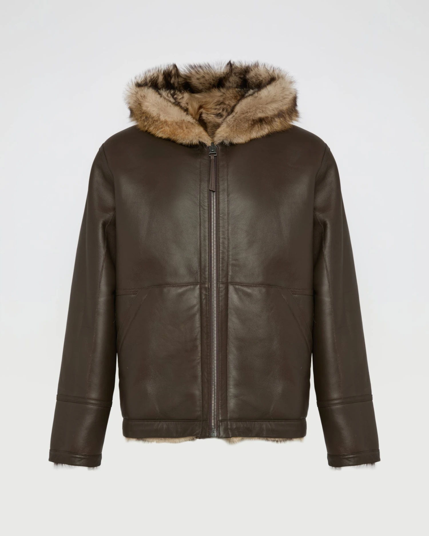 La forme sportive de la veste à capuche zippée s’offre le luxe d’une peau lainée d’agneau de Toscane, dont le poil long apporte douceur, chaleur et style. La veste peut se porter également côté peau finition nappa pour plus de versatilité, grâce à un zip à la tirette réversible.