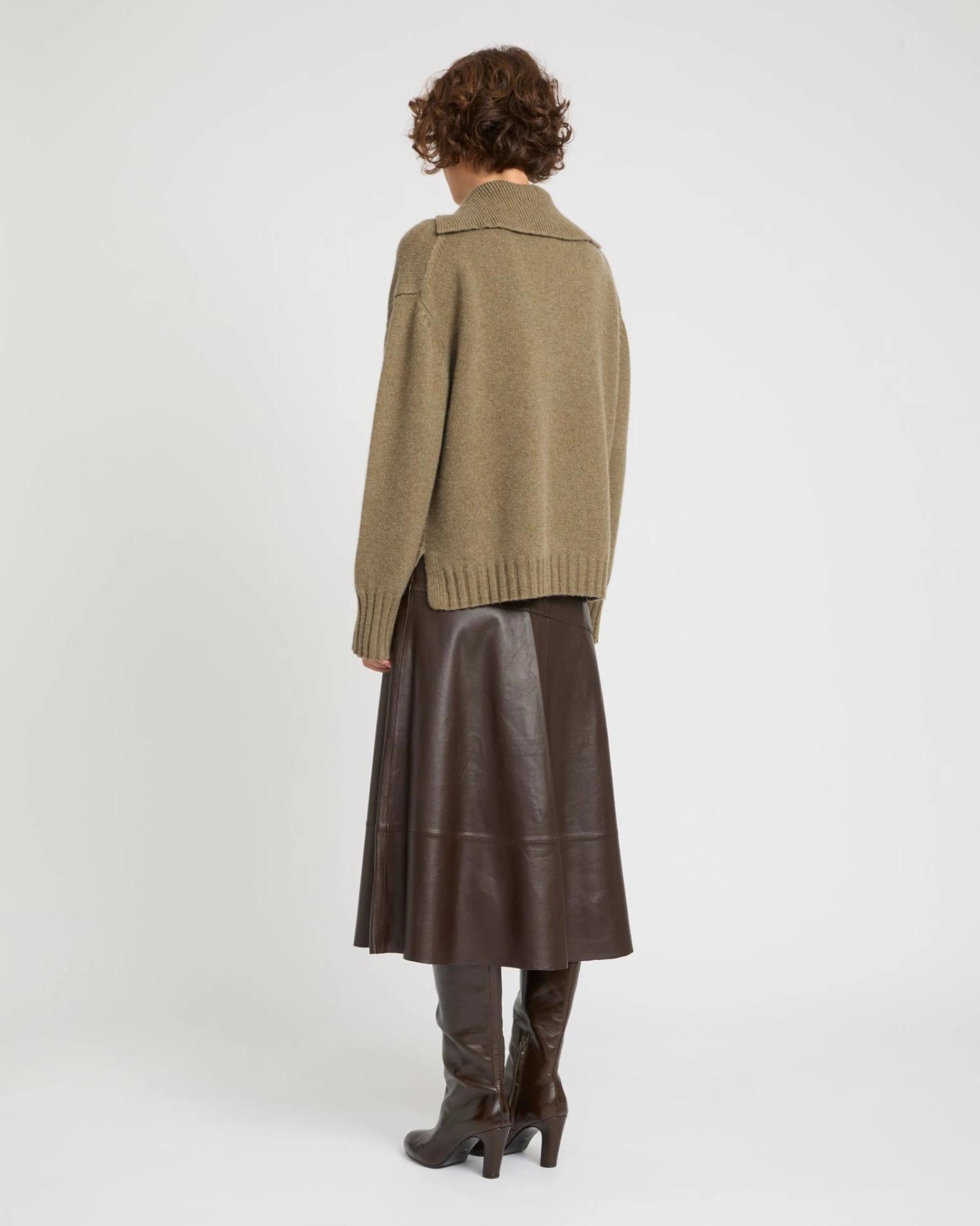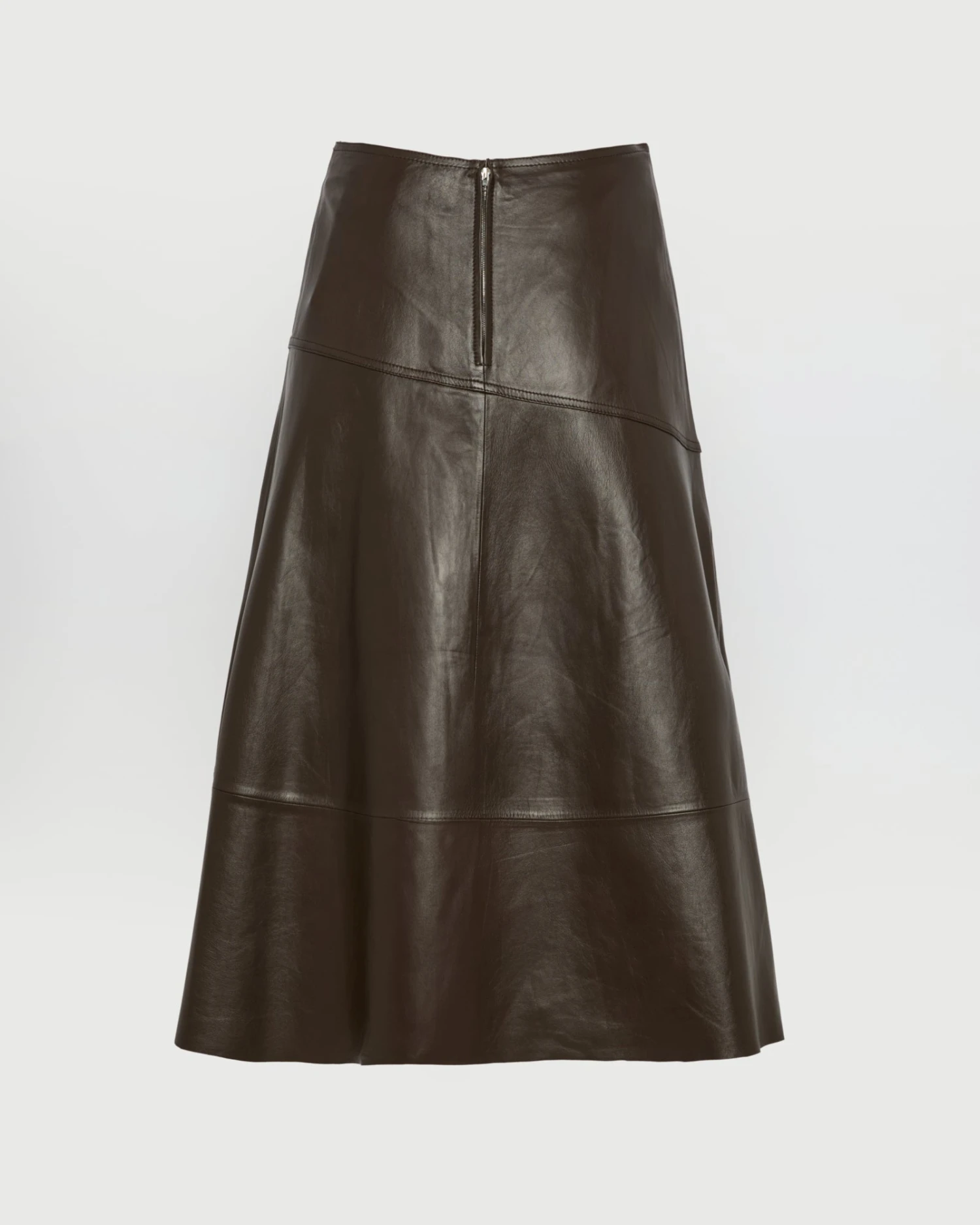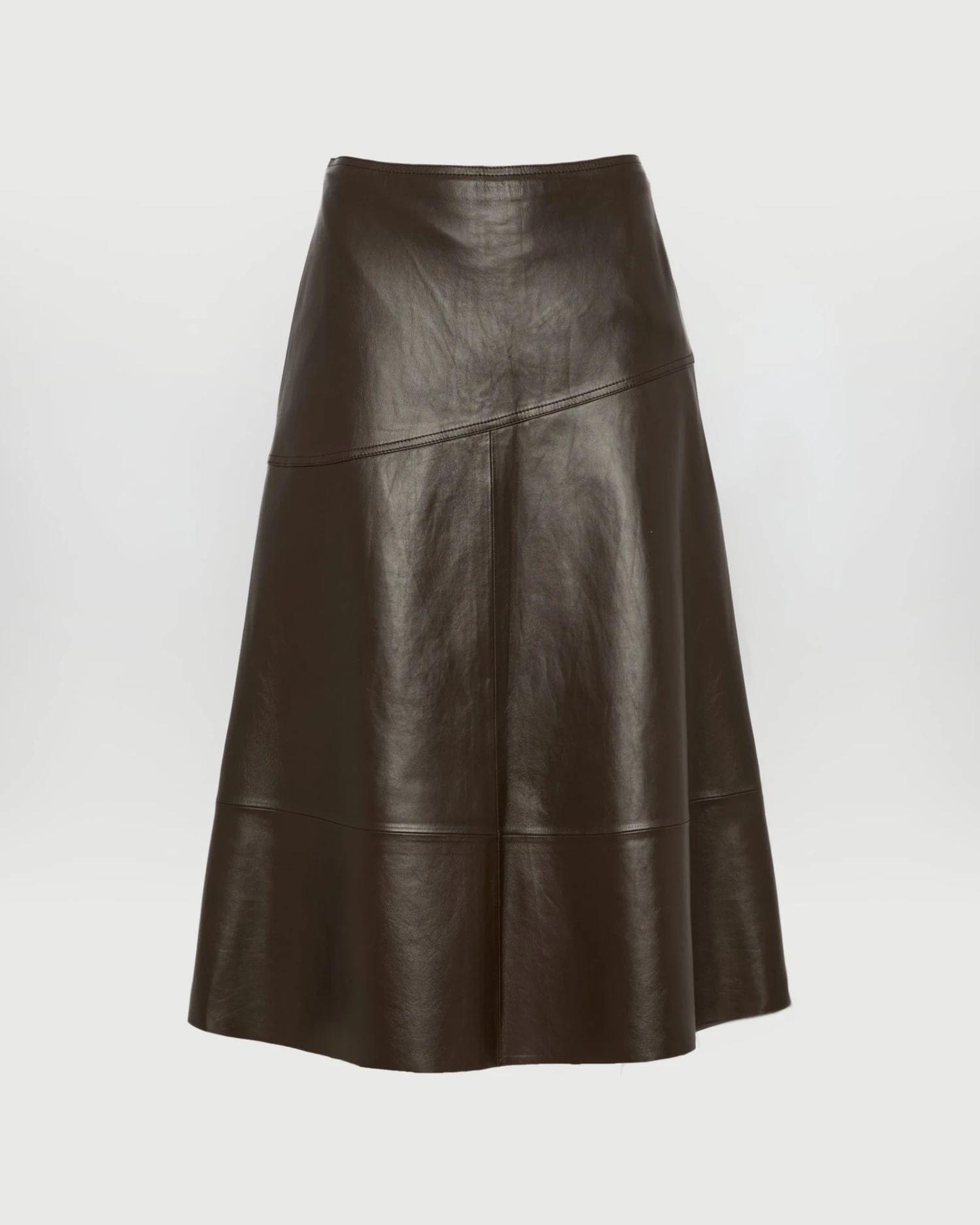 Travaillée dans un cuir d’agneau fin et souple au tombé impeccable, cette jupe évasée propose une construction par panneaux avec une découpe asymétrique sur la partie taille. Sa longueur midi versatile apporte une élégance à la silhouette.