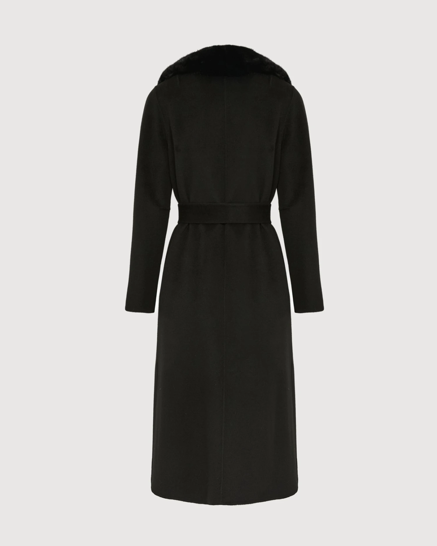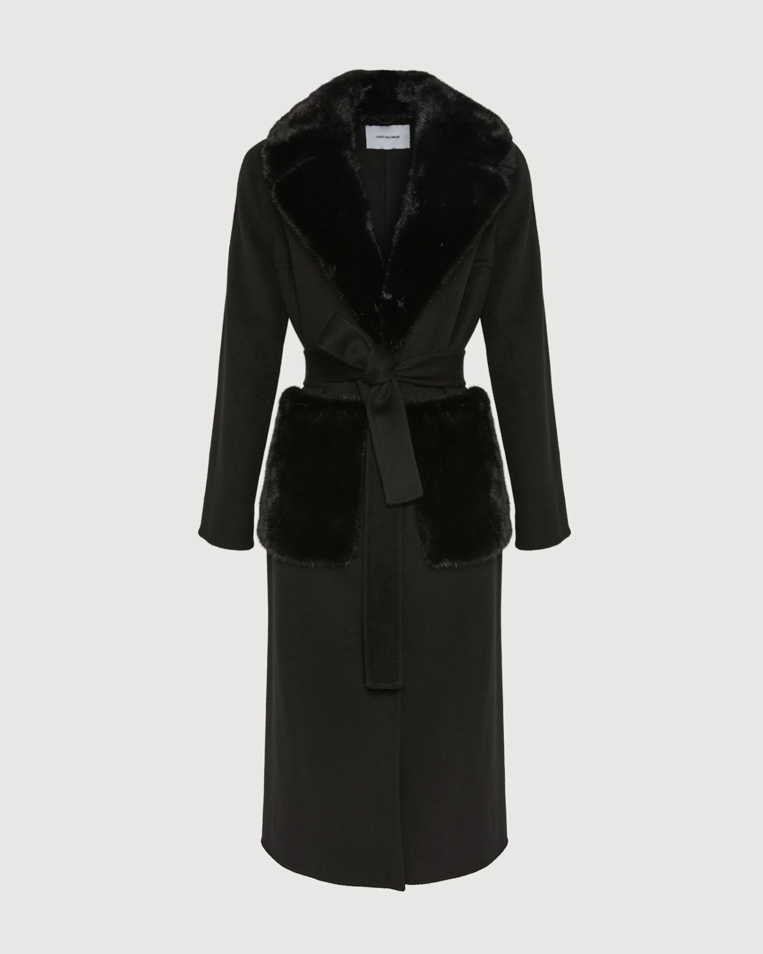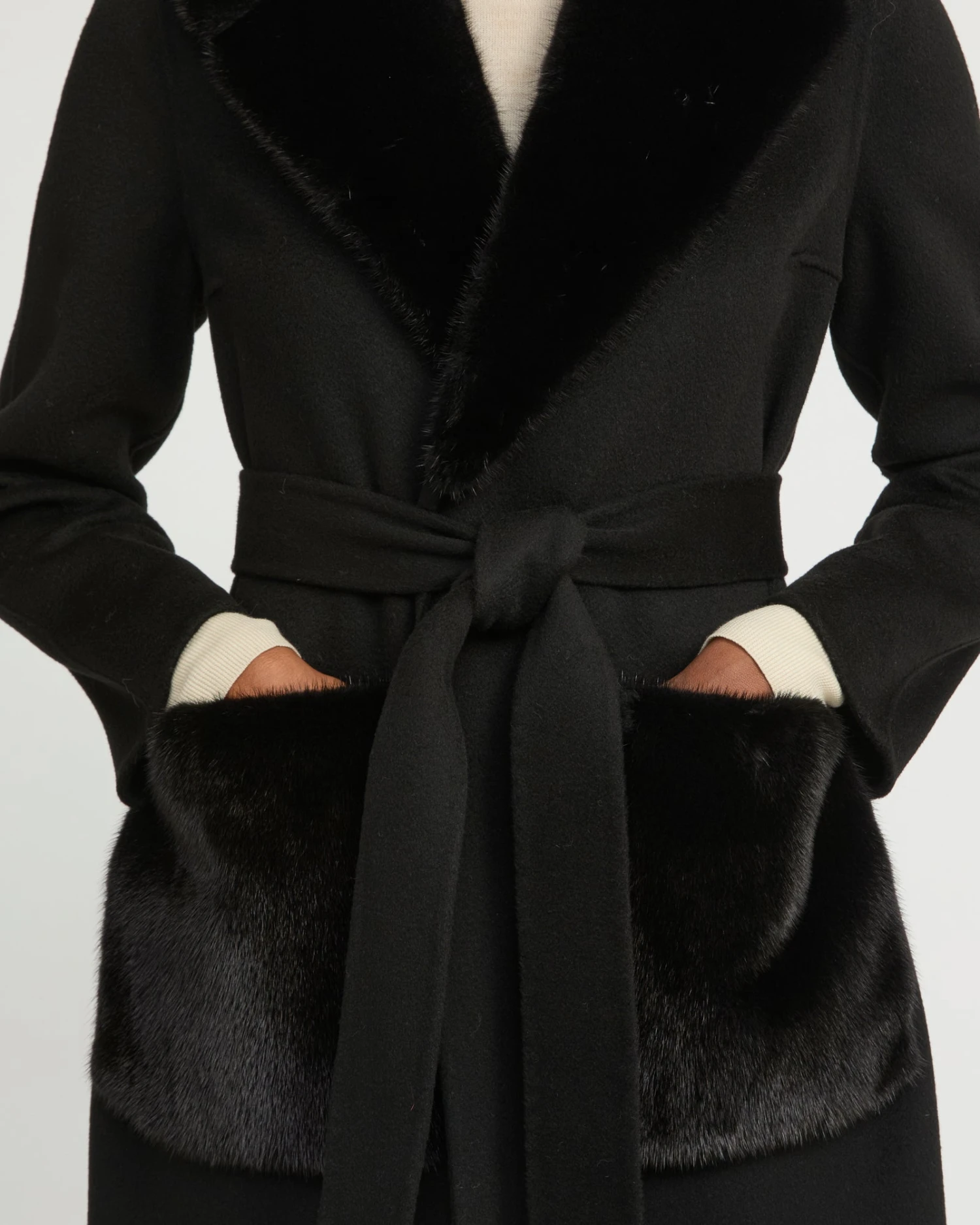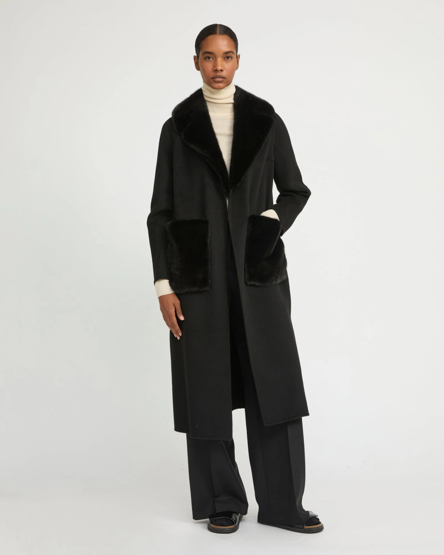 Manteau long et fendu sur les côtés confectionné en lainage cachemire double-face. Doté d’un col tailleur, de deux poches plaquées et d’une ceinture pour ajuster la silhouette, ce modèle joue avec les codes du masculin féminin. Un style qui peut se transformer au cours de la journée en ajoutant un col ainsi que des sur-poches en fourrure de vison amovibles. Des détails élégants qui s’attachent parfaitement à ce manteau versatile grâce à un système de boutons.
