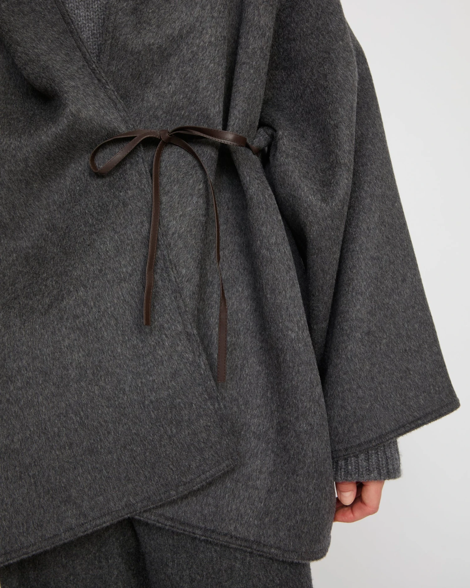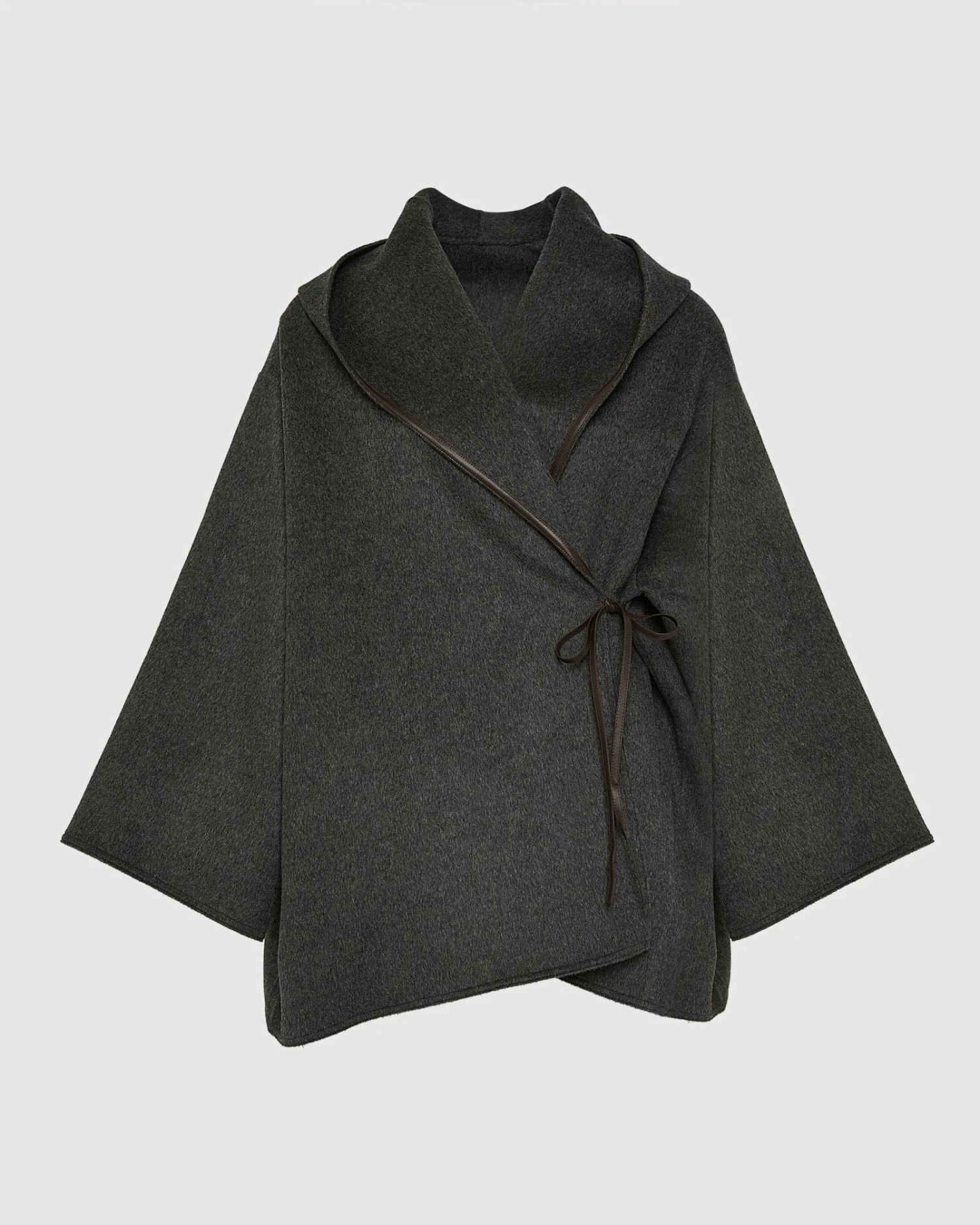Un esprit kimono et des formes amples pour ce manteau court, qui se porte ouvert ou fermé par un lien en cuir. Son large col châle vient former une capuche à l’arrière. Matière luxueuse double-face en cachemire, finitions cuir d’agneau.