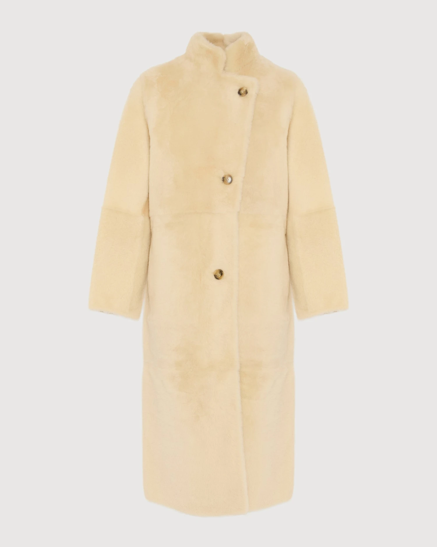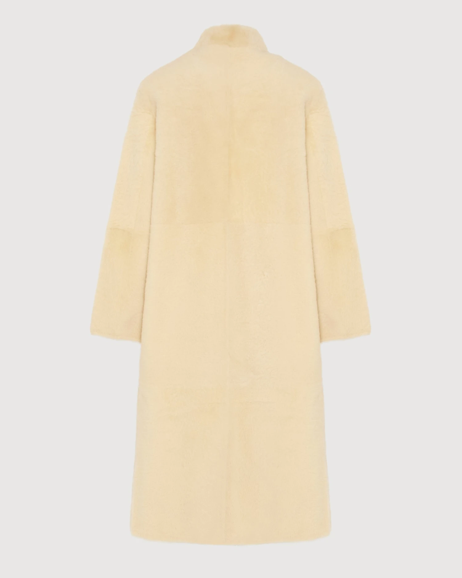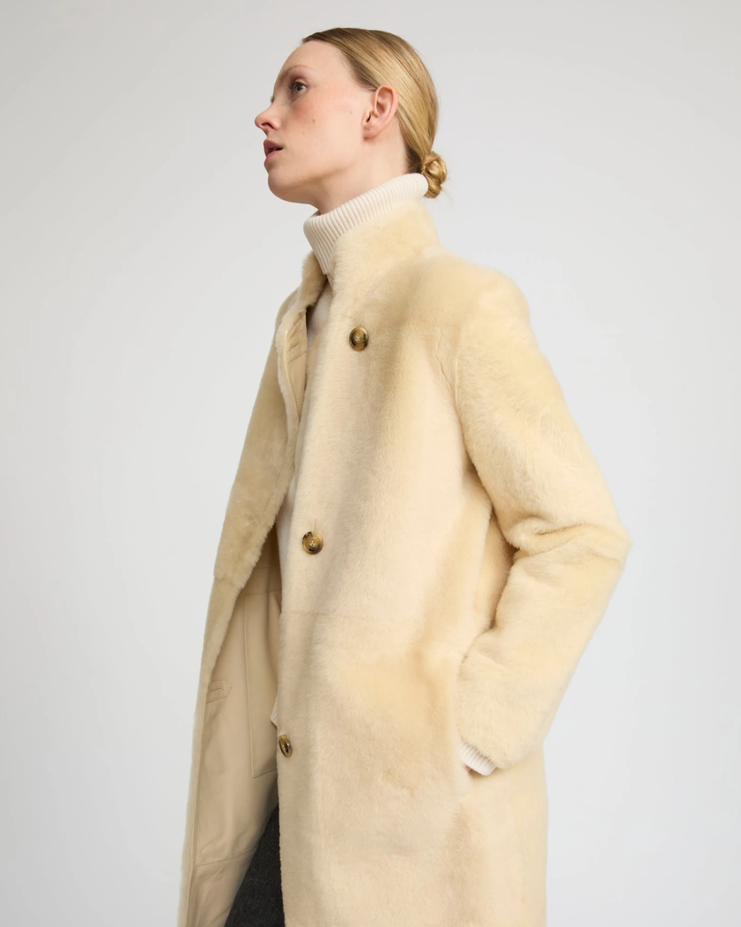 Les lignes droites de ce manteau long sont mises en valeur par une ceinture en cuir qui vient resserrer la taille. Une fermeture boutonnée en biais et un col montant ajoutent à l’élégance de cette pièce pleine de prestance, qui joue sur le contraste en peau lainée douce et cuir maroquinerie.