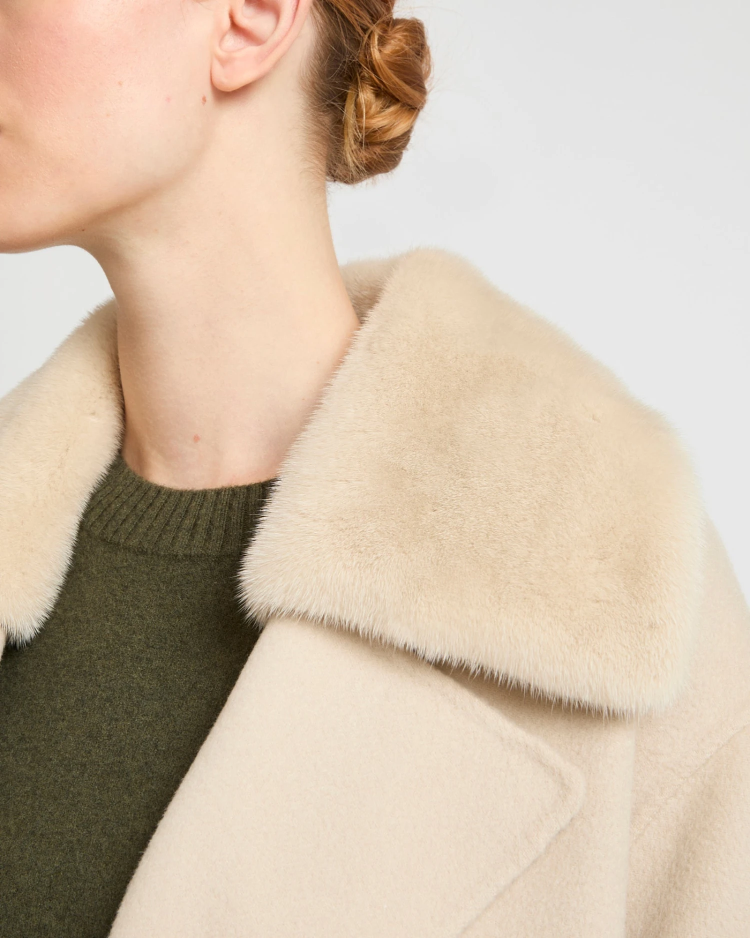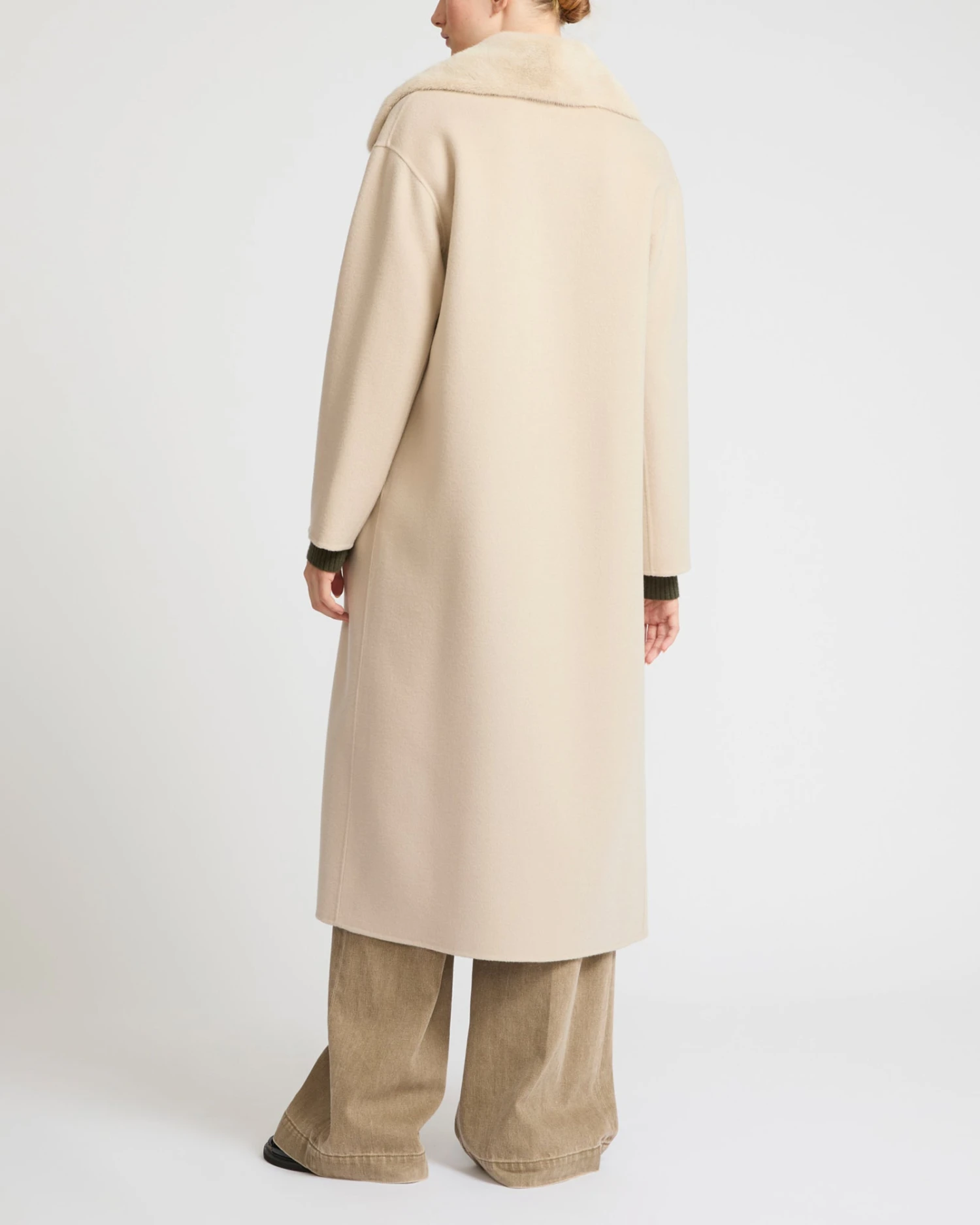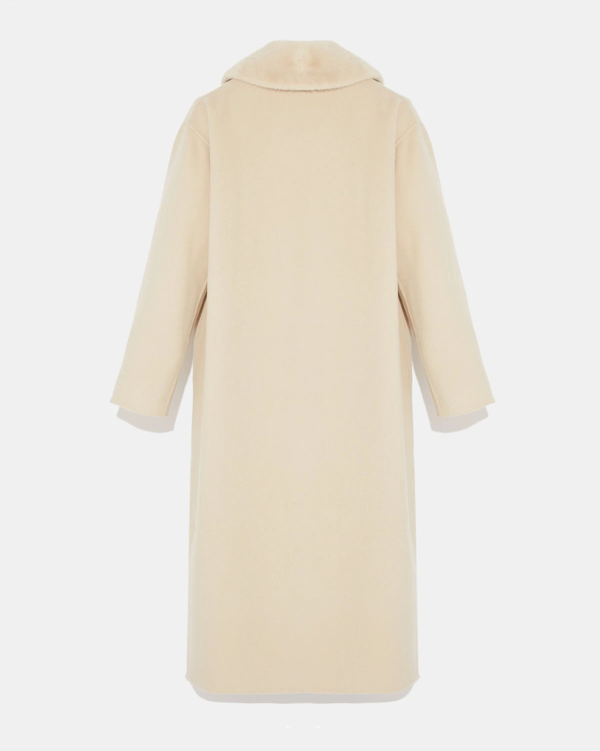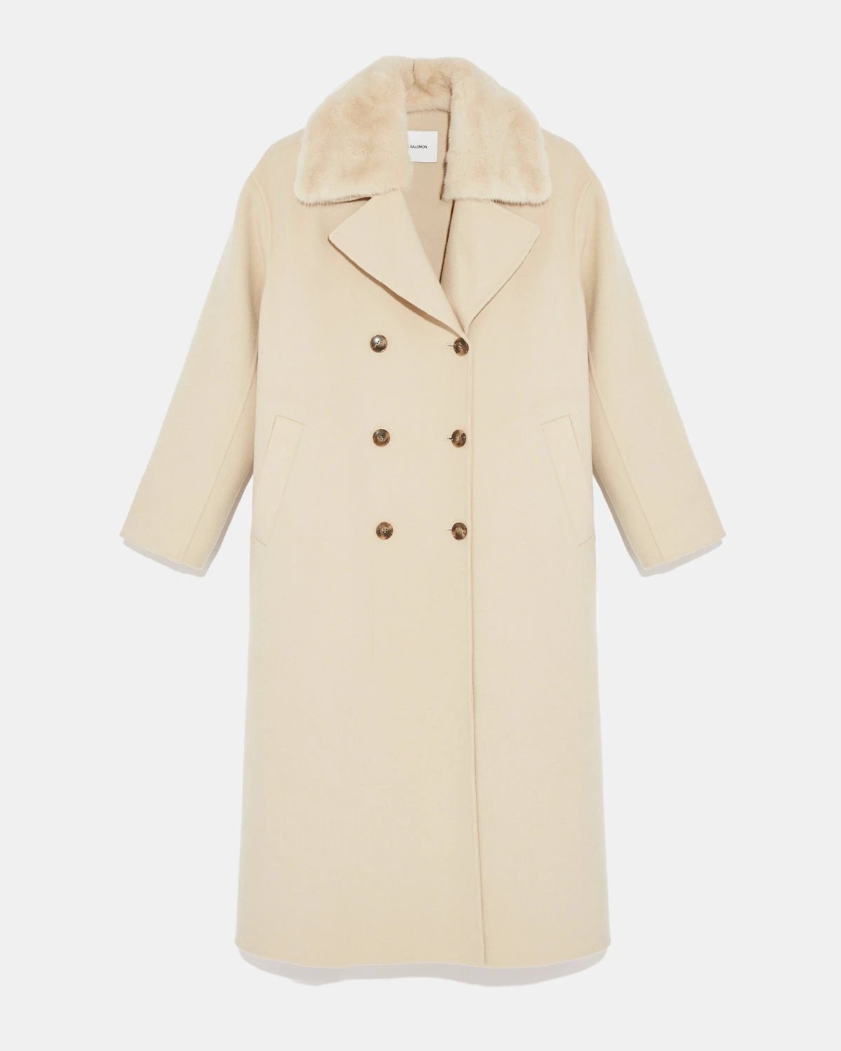 Un manteau long et droit au style masculin féminin. Confectionné en lainage cachemire double-face, il est chaud et enveloppant tout en restant agréable à porter. Doté d’un col tailleur, d’une fermeture croisée à double boutonnage et de poches fentes, sa ligne est élégante et intemporelle. Le col amovible en fourrure de vison apporte du contraste et une touche de féminité. Un détail qui fait toute la différence et s’attache parfaitement au manteau grâce à un système de boutons invisible.