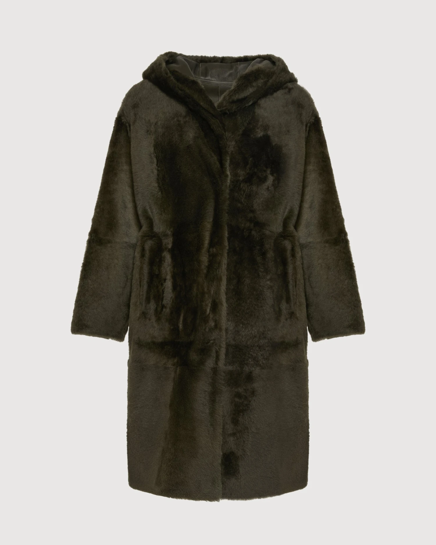 À la fois chaud et enveloppant, ce manteau d’hiver est confectionné en peau lainée non doublée. Doté d’un col châle et de deux poches fentes, sa ligne est épurée et son style est élégant. La capuche et la fermeture par des boutons pressions lui donnent un aspect fonctionnel et une touche de modernité. À l’intérieur du manteau, un cordon de resserrage permet d’ajuster la coupe pour une silhouette plus urbaine et décontractée.