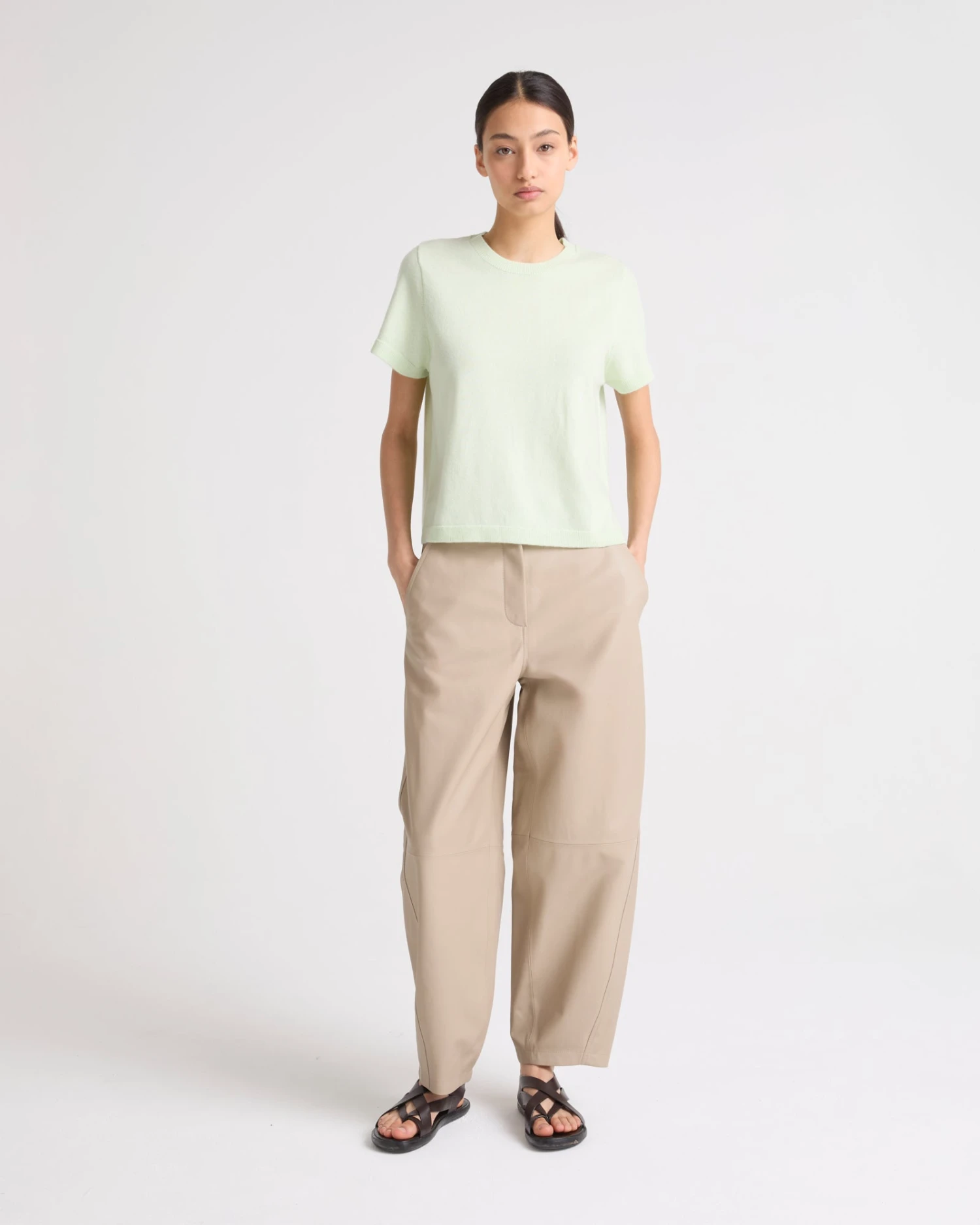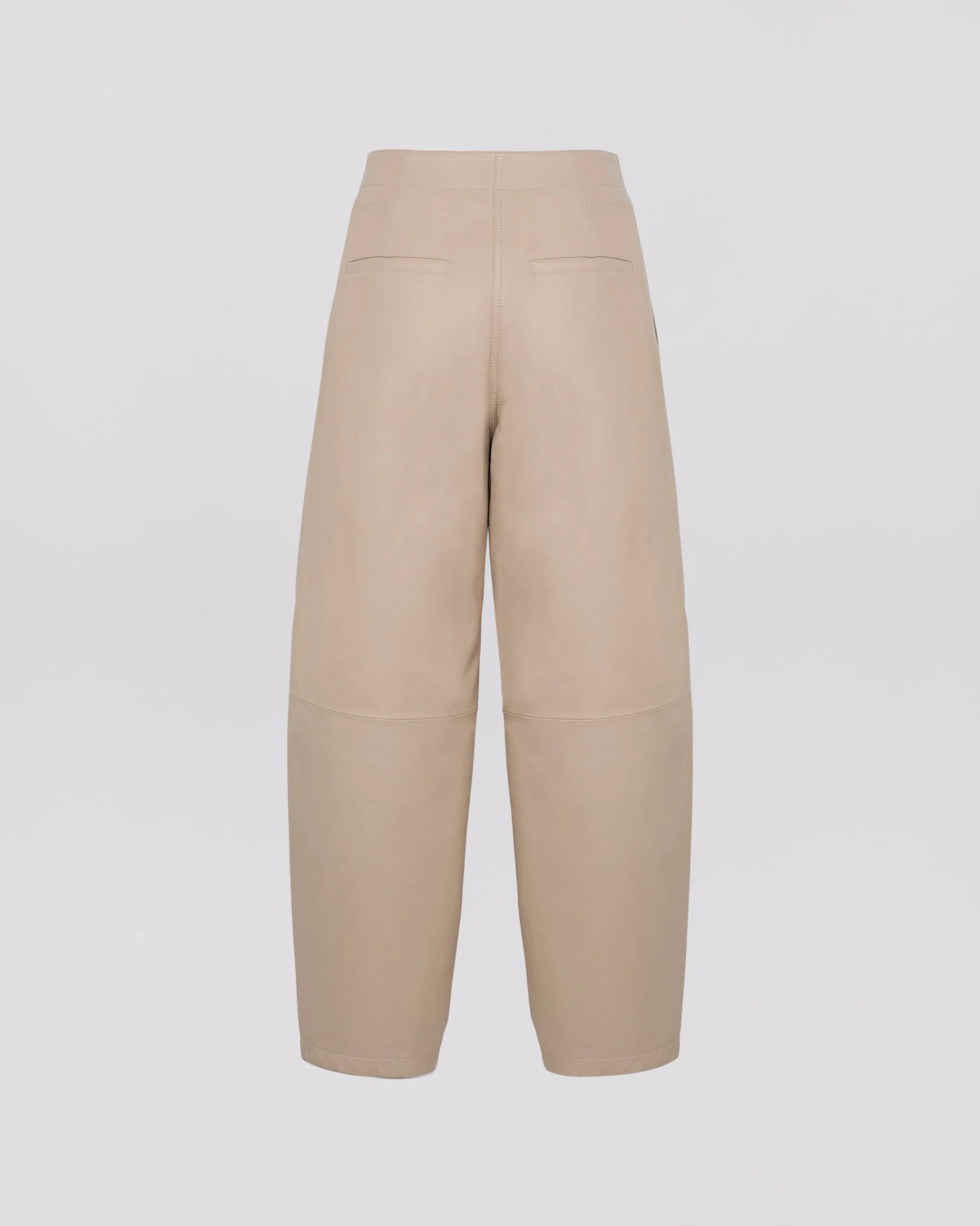 L’aisance élégante de sa forme façon « carrot pant » apporte une allure décontractée à ce pantalon taille haute en cuir souple. Une couture twistée sur la jambe donne un effet graphique.