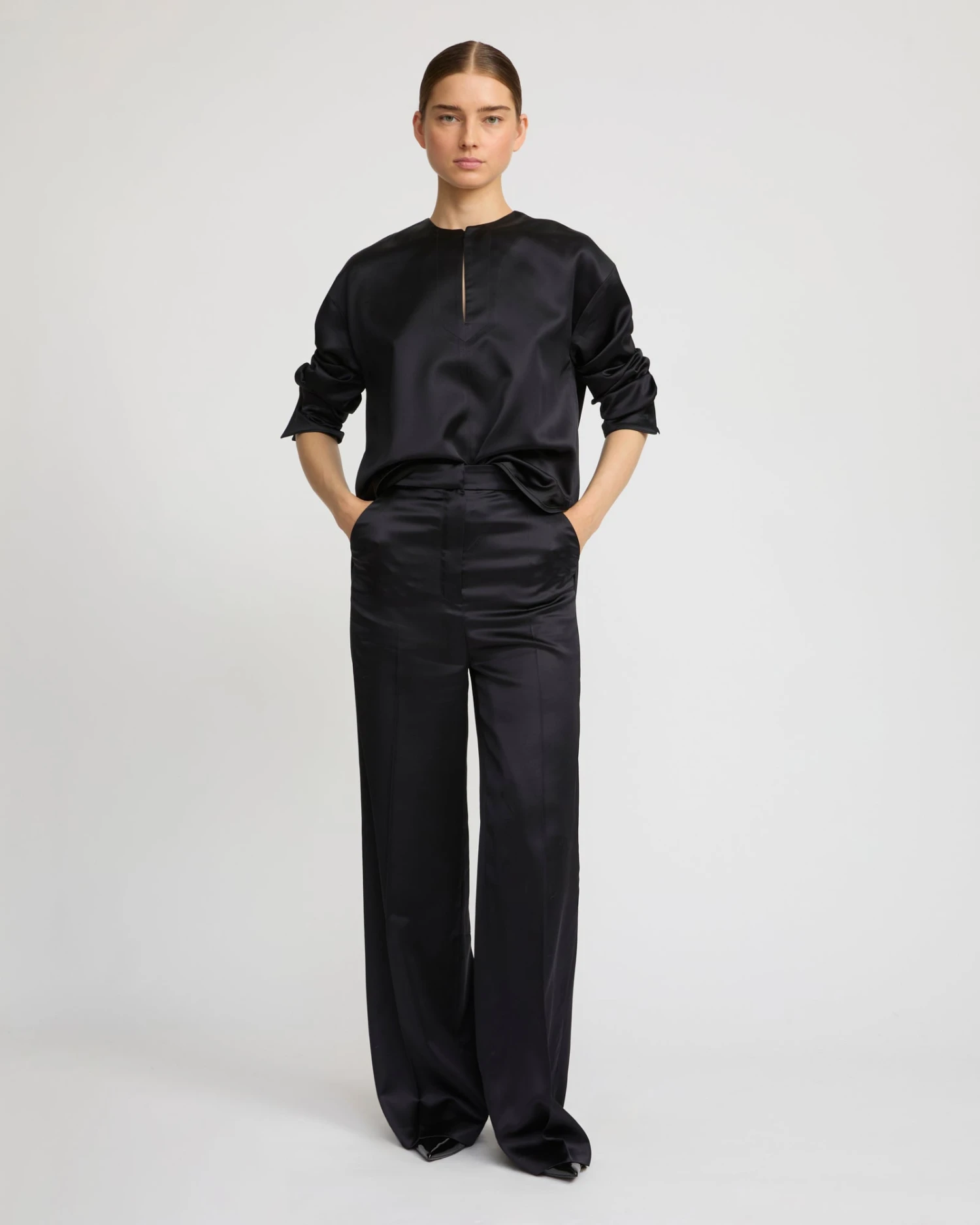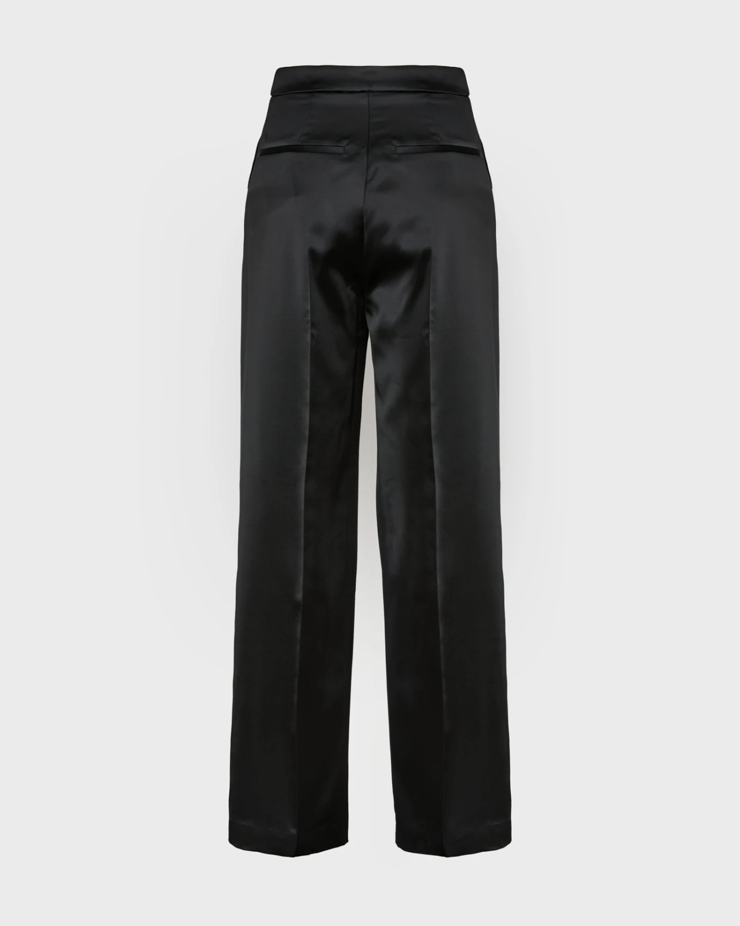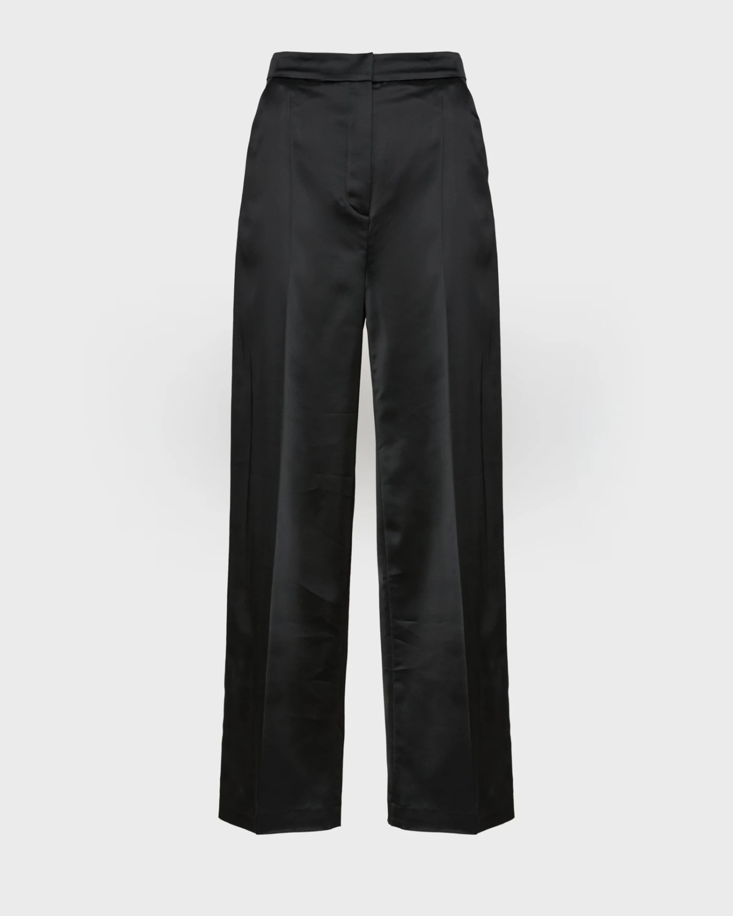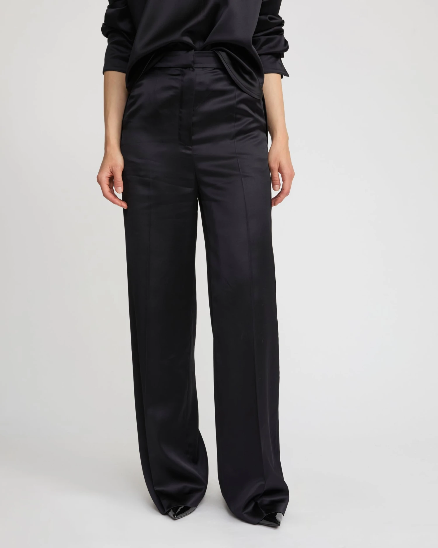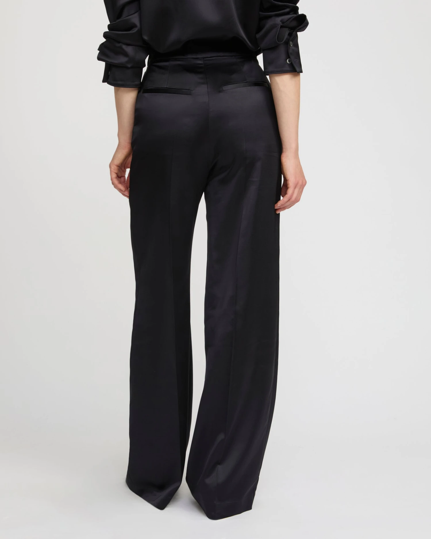 Le tombé impeccable du satin de laine lourd souligne les lignes évasées de ce pantalon à pinces élégant.