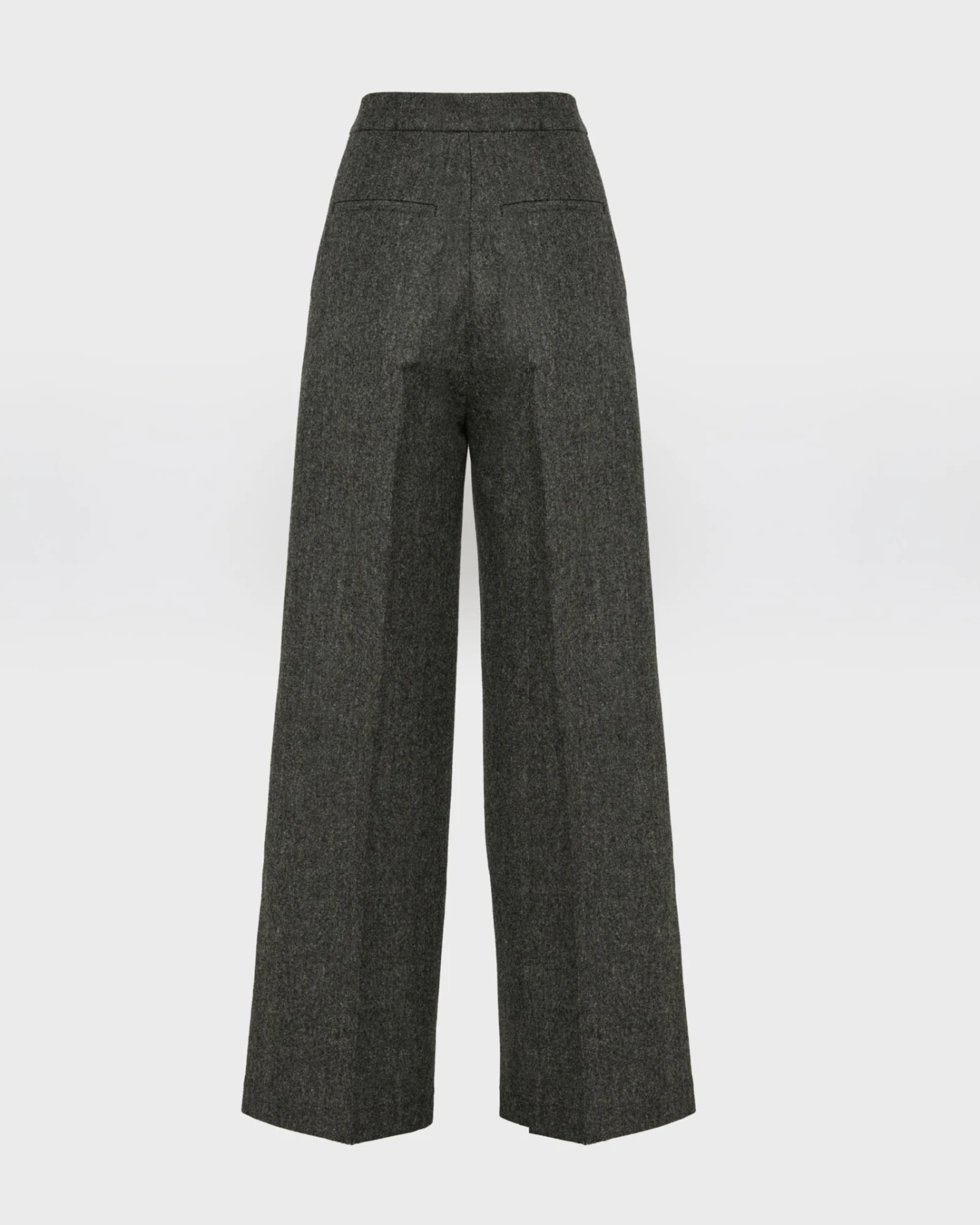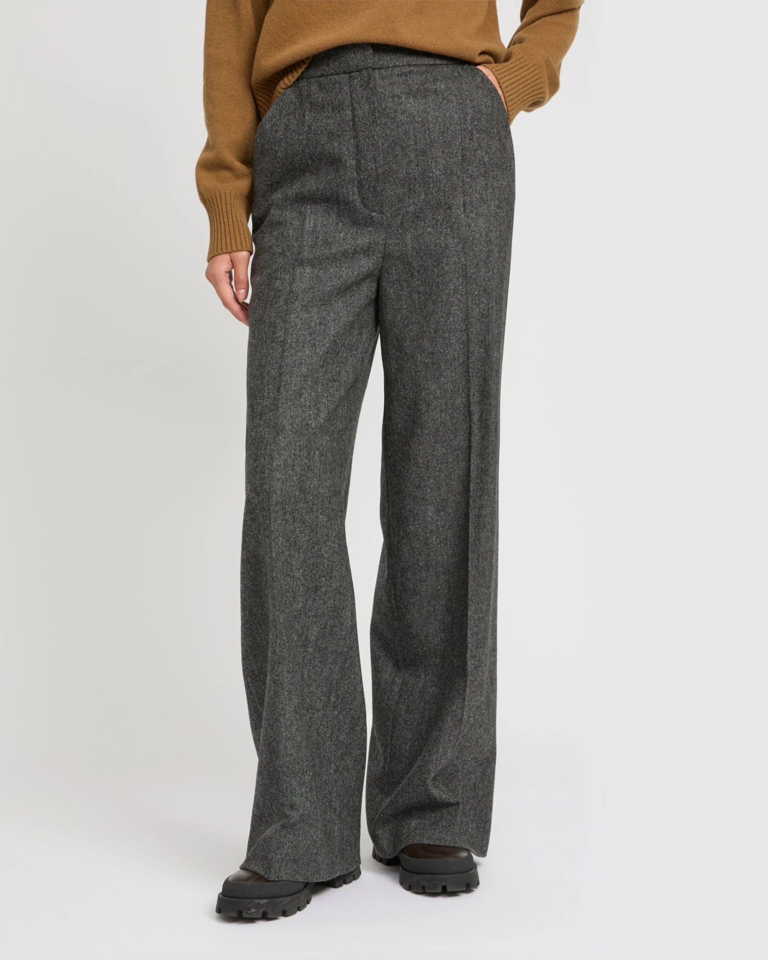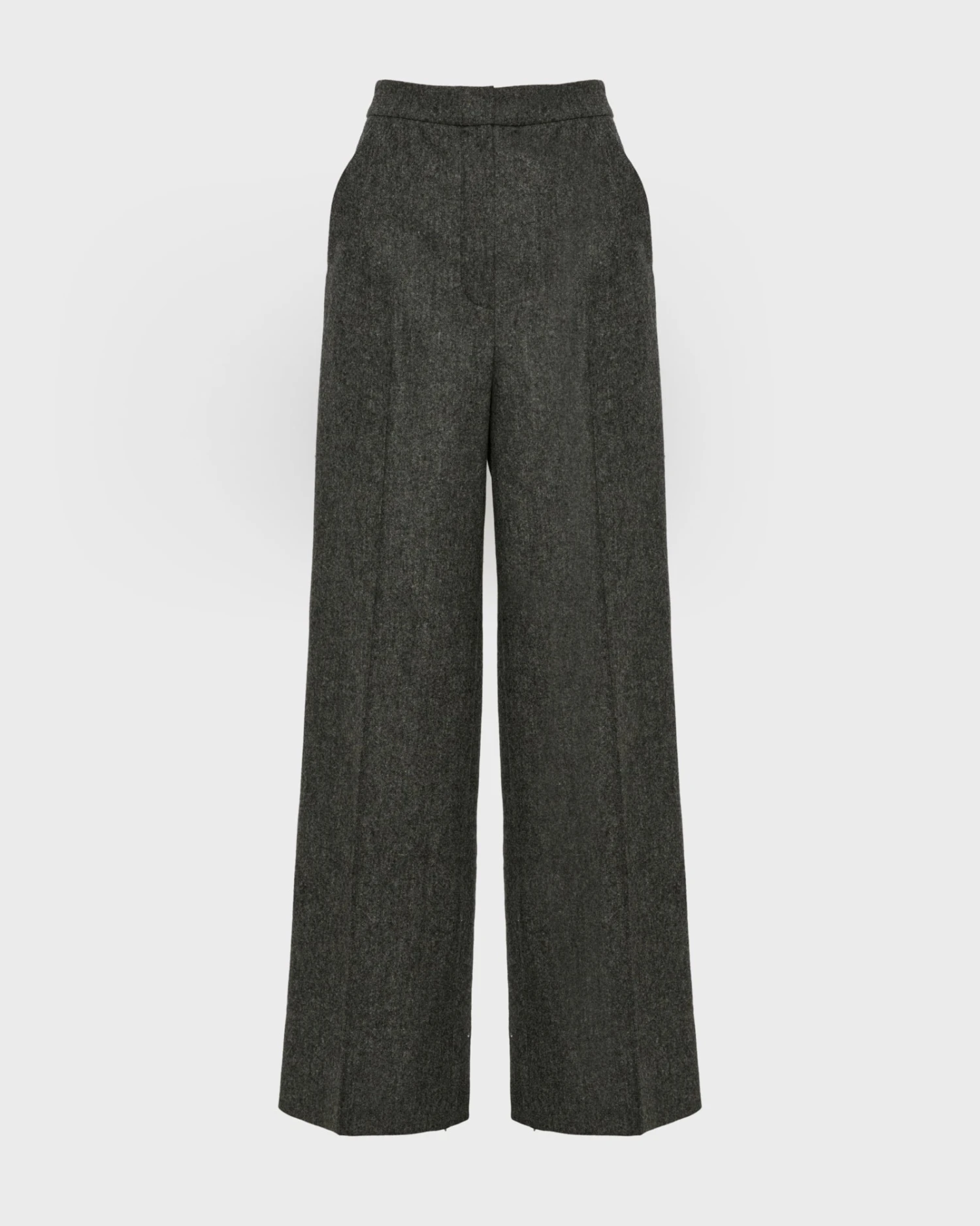 Le tombé impeccable d’une flanelle laine et cachemire souligne les lignes évasées de ce pantalon tailleur à plis.