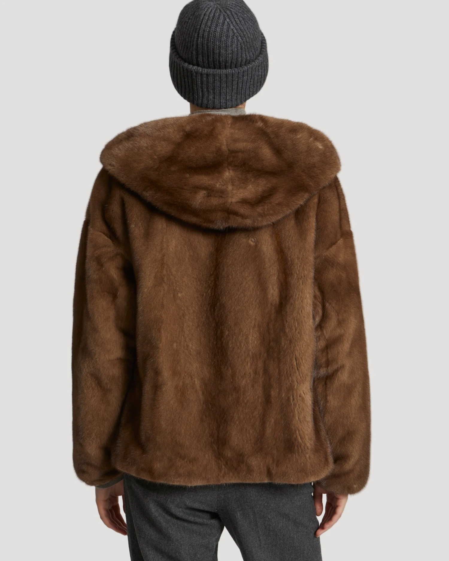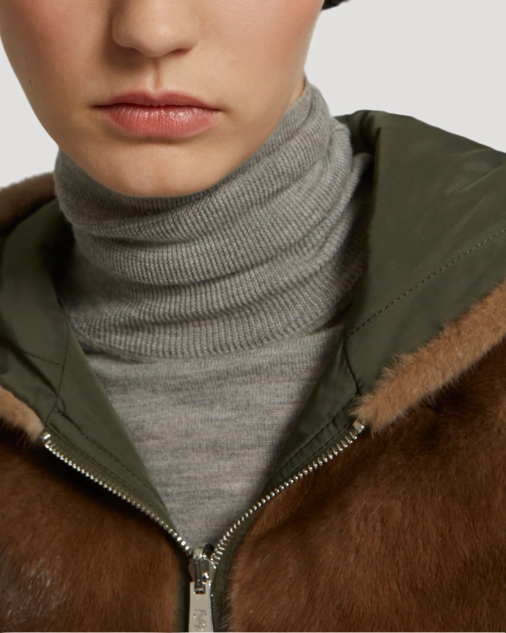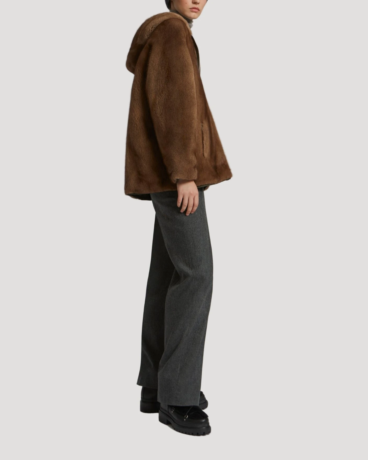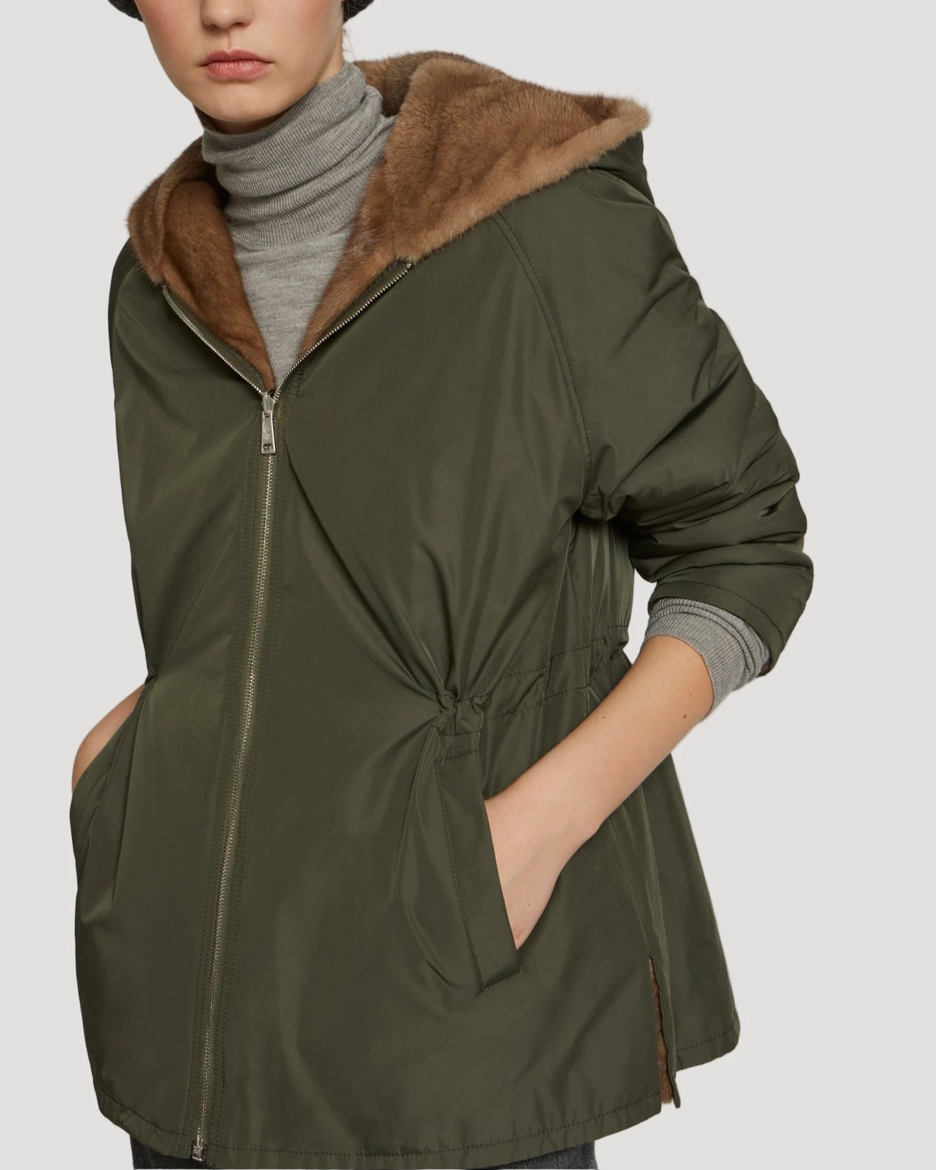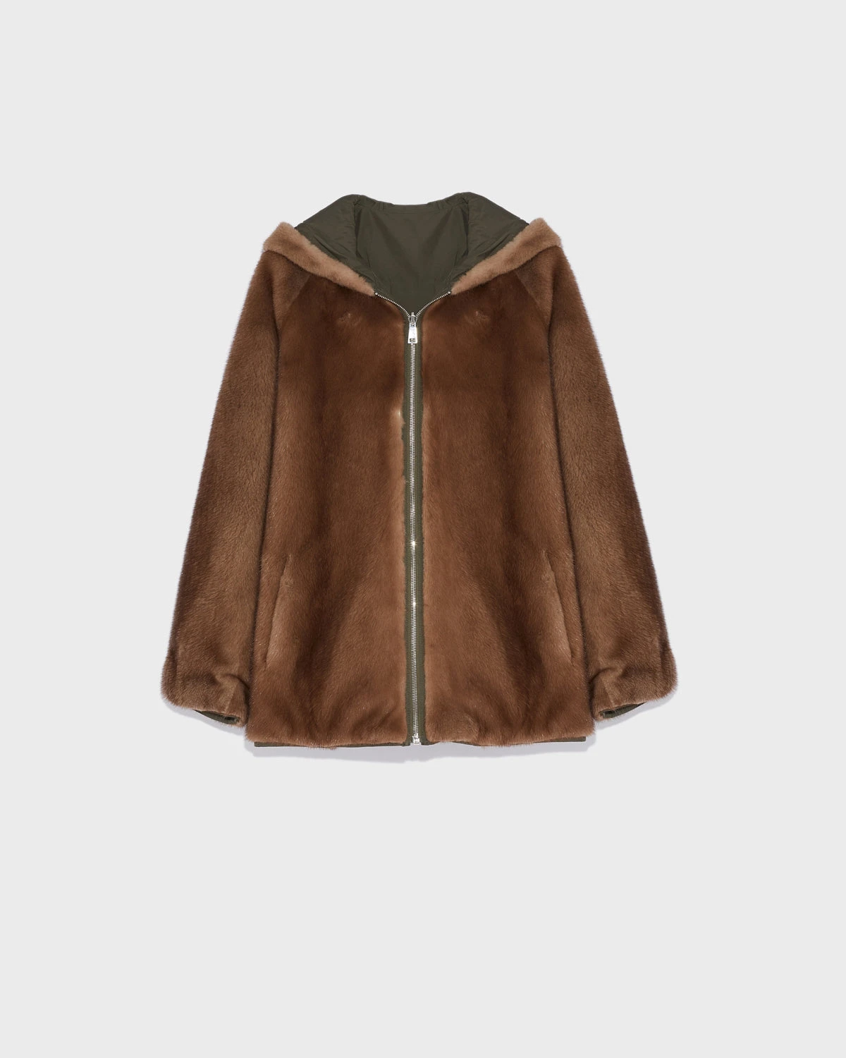– Modèle réversible, un côté tissu technique et l’autre côté en fourrure de vison long poil