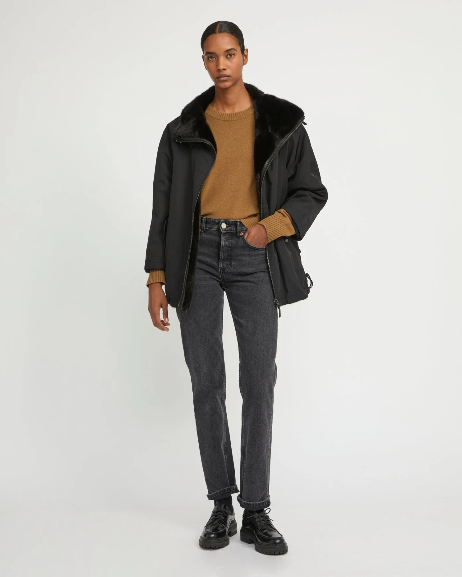 Lignes épurées et esprit sportswear pour cette parka au col montant, testée jusqu’à une température extérieure de -10°C. Réversible, elle associe une face en tissu technique et une face en fourrure de vison long poil douce et résistante. La face tissu propose des poches à pression tandis que la face fourrure comporte deux poches fentes.