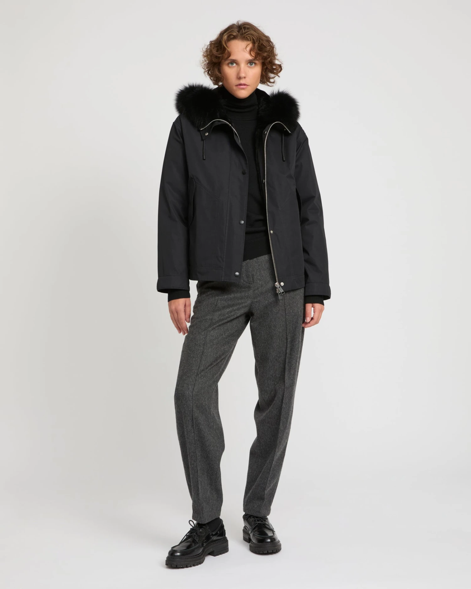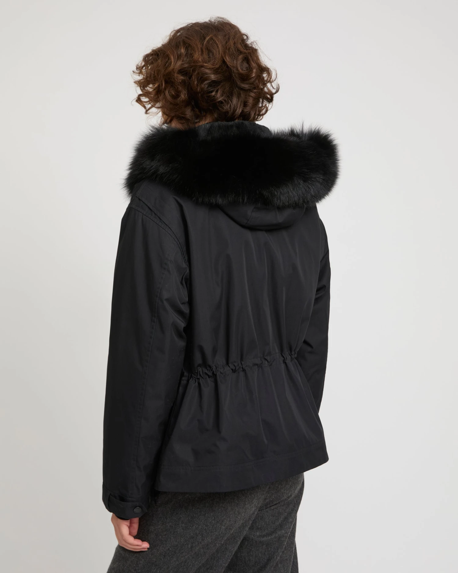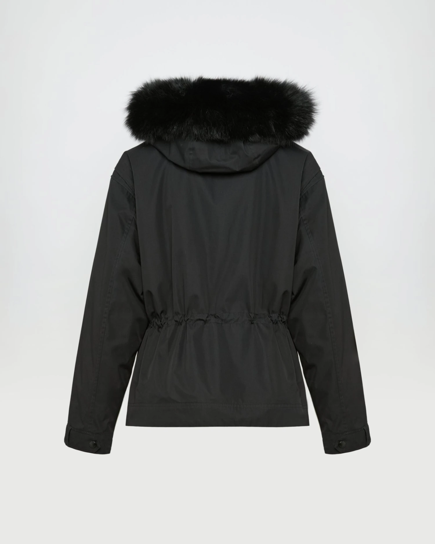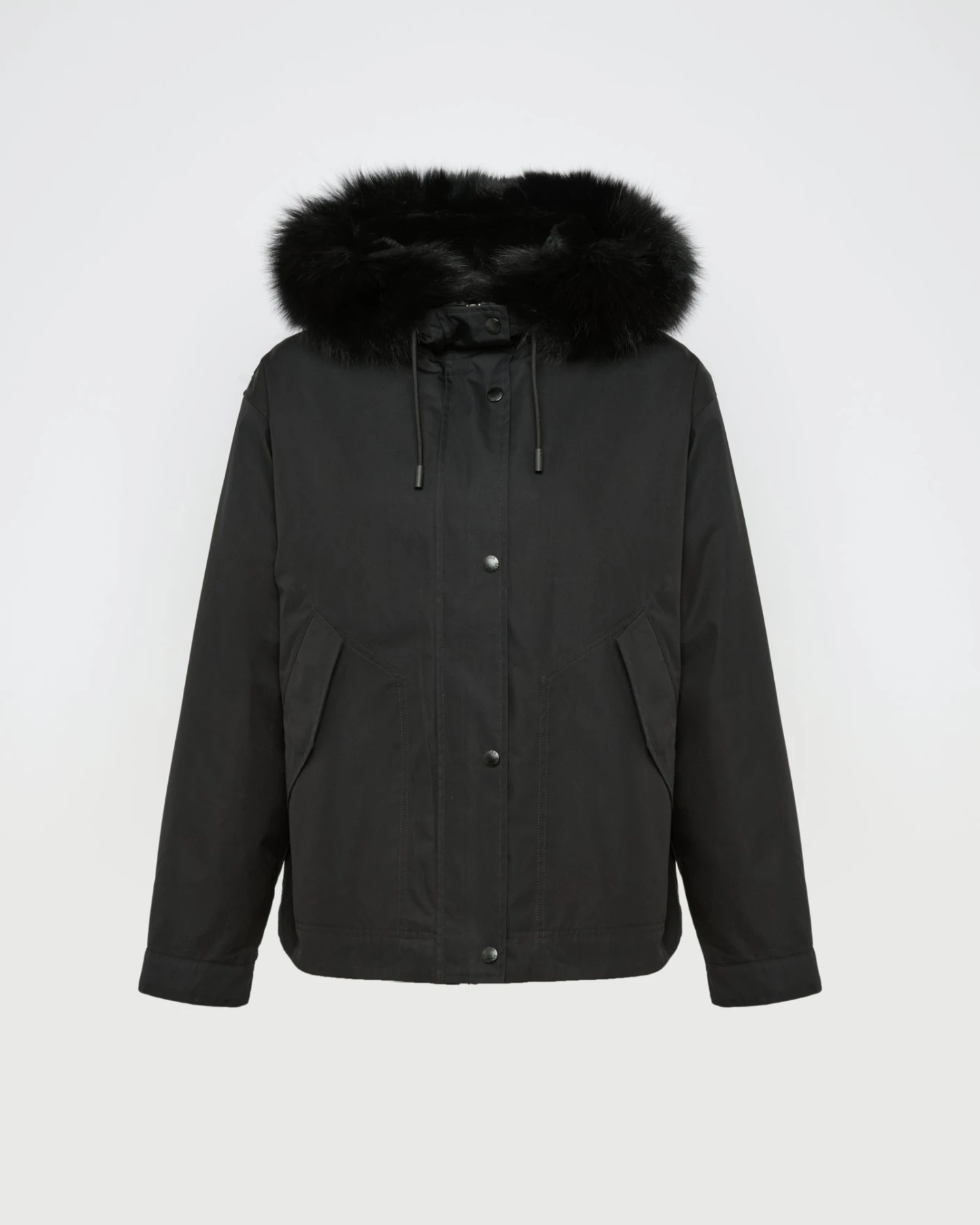Une forme courte et « boxy » pour cette parka, qui peut aussi se porter resserrée à la taille. La veste a été testée jusqu’à -10°C pour garantir une protection parfaite contre le froid, et sa matière en coton imperméable résiste aux intempéries. Un tour de capuche amovible en fourrure de renard aux poils longs, et une doublure corps en fourrure de lapin rasé, également amovible, proposent des options supplémentaires pour le style et la chaleur.