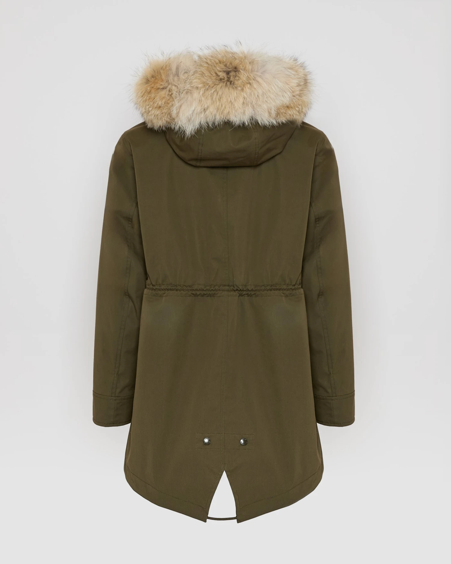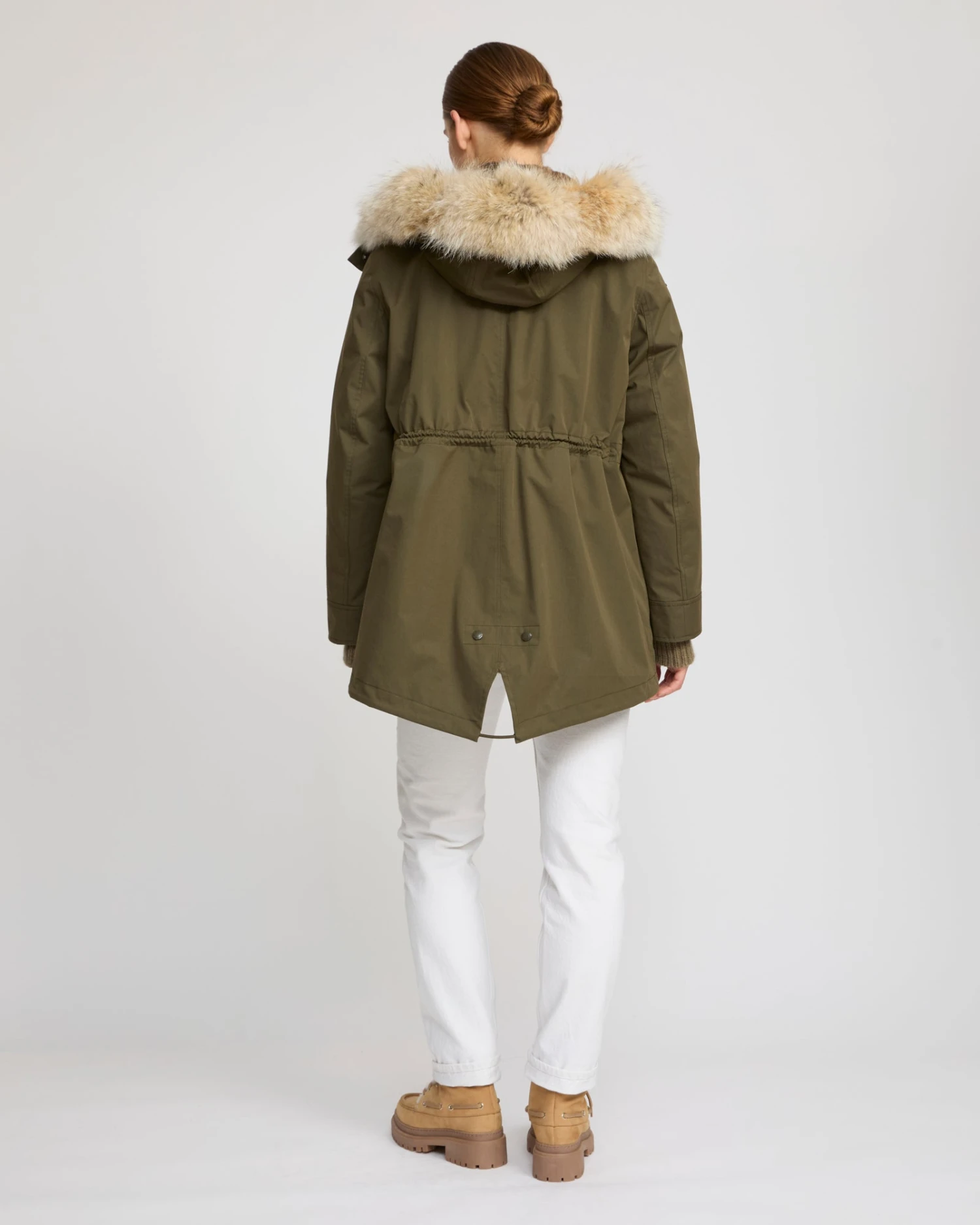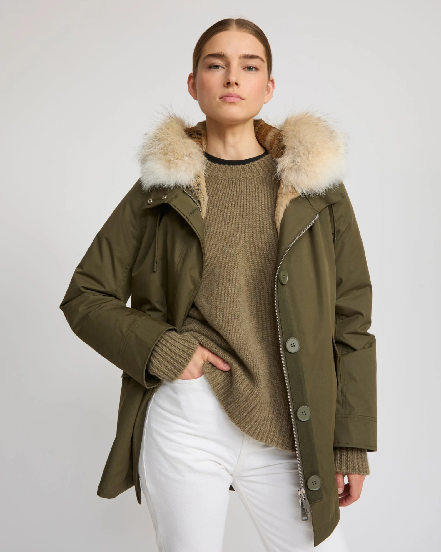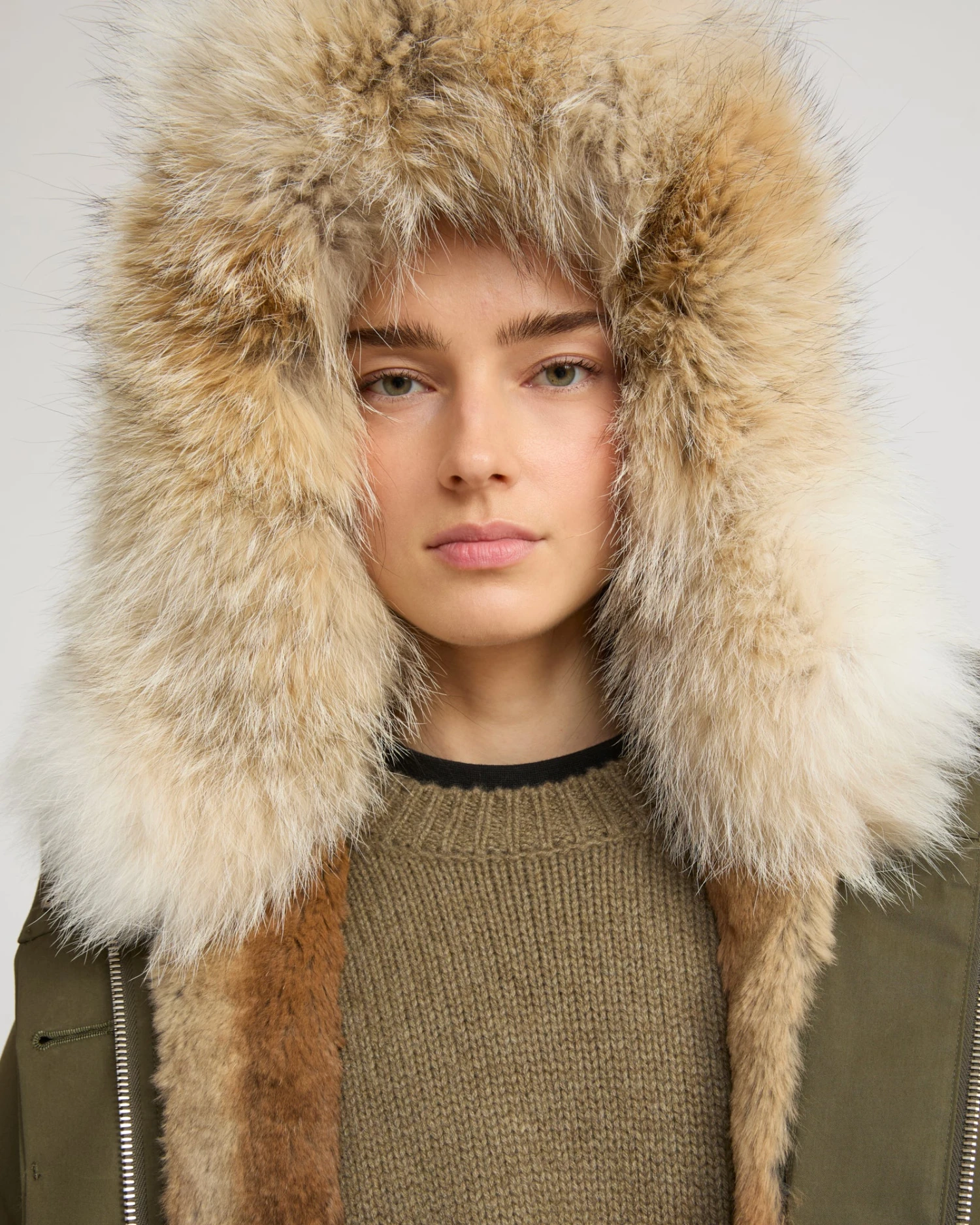 Une parka courte qui joue les jeux de texture, entre une matière technique et les fourrures de lapin et de coyote, qui apportent leur douceur et leur chaleur à ce modèle zippé à capuche, avec ses poches à rabats.