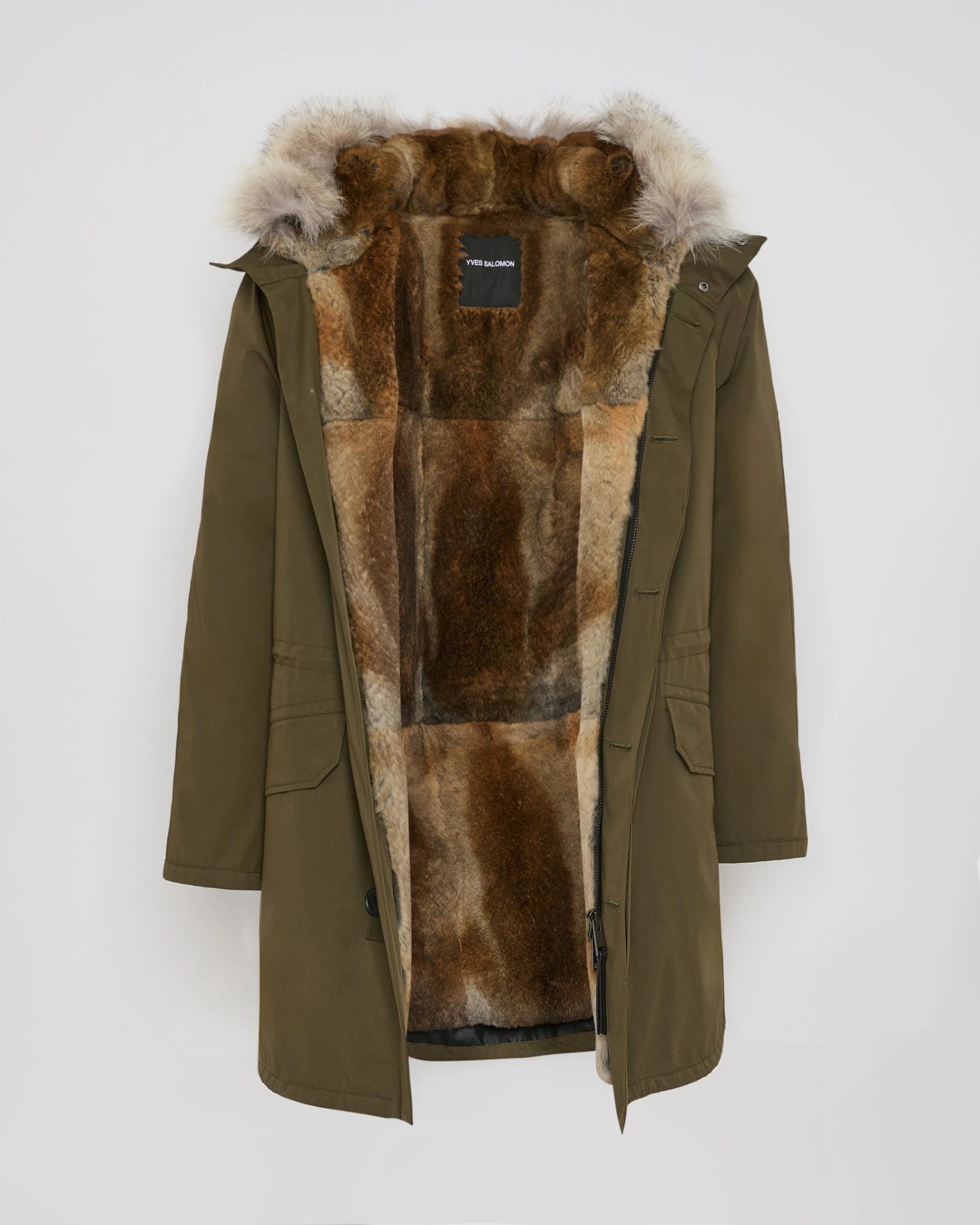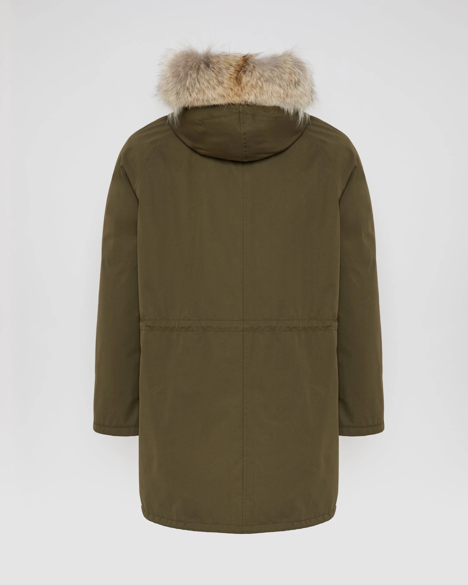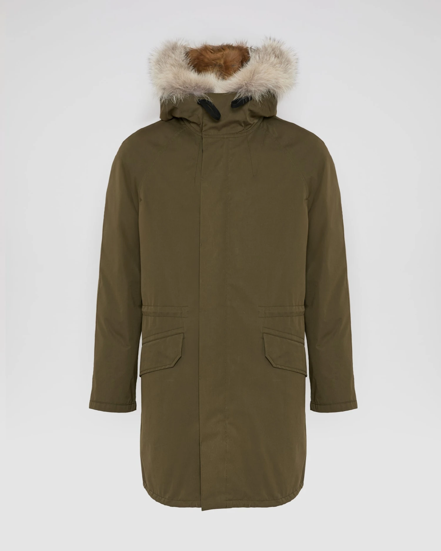 Cette parka iconique allie style et élégance. Son tissu technique résistant aux intempéries cache une doublure amovible en lapin, et la bordure en coyote de la capuche se retire également. Un cordon de serrage permet d’ajuster la taille, et la double fermeture zip et le boutonnage offre une protection supplémentaire aux courants d’air.