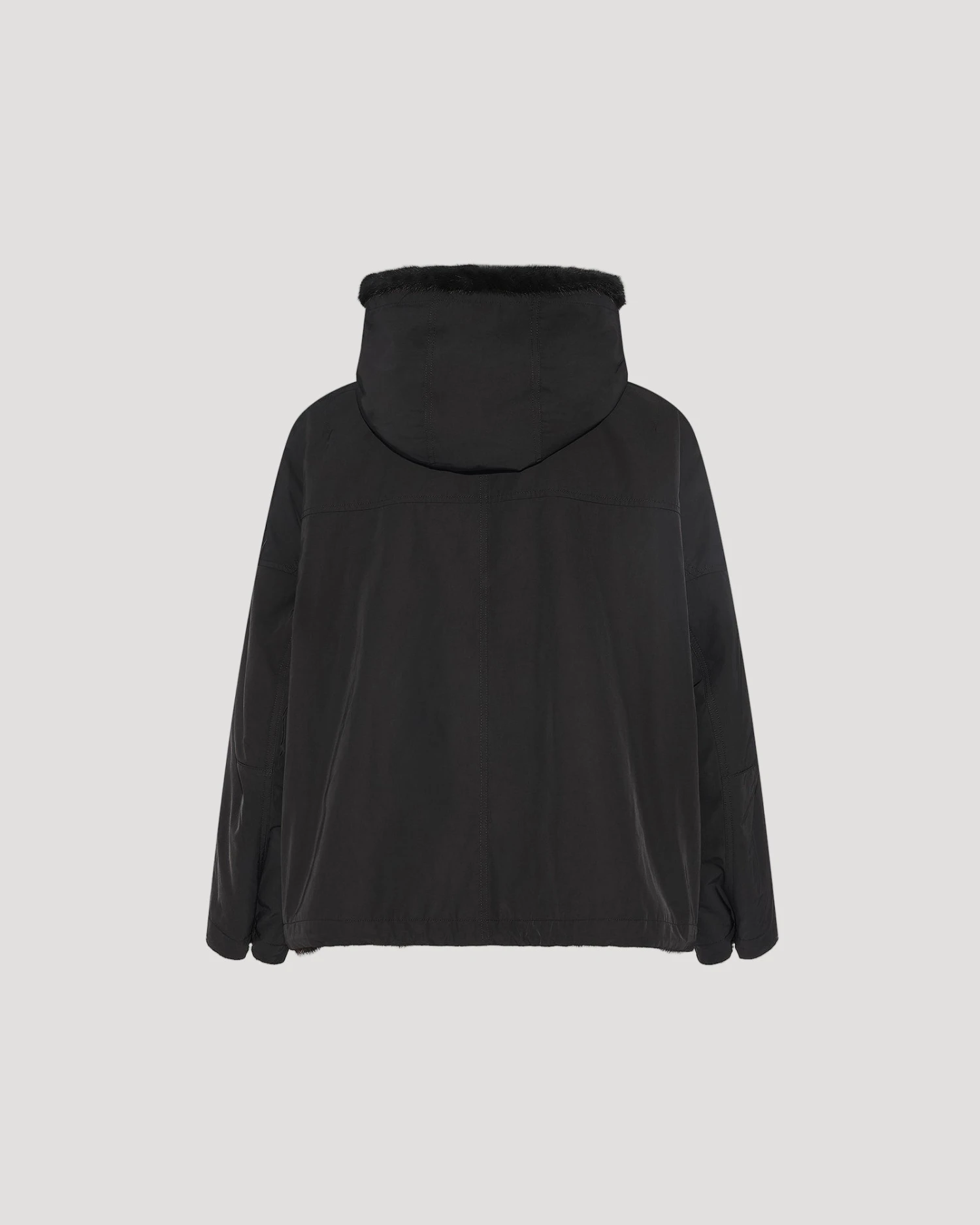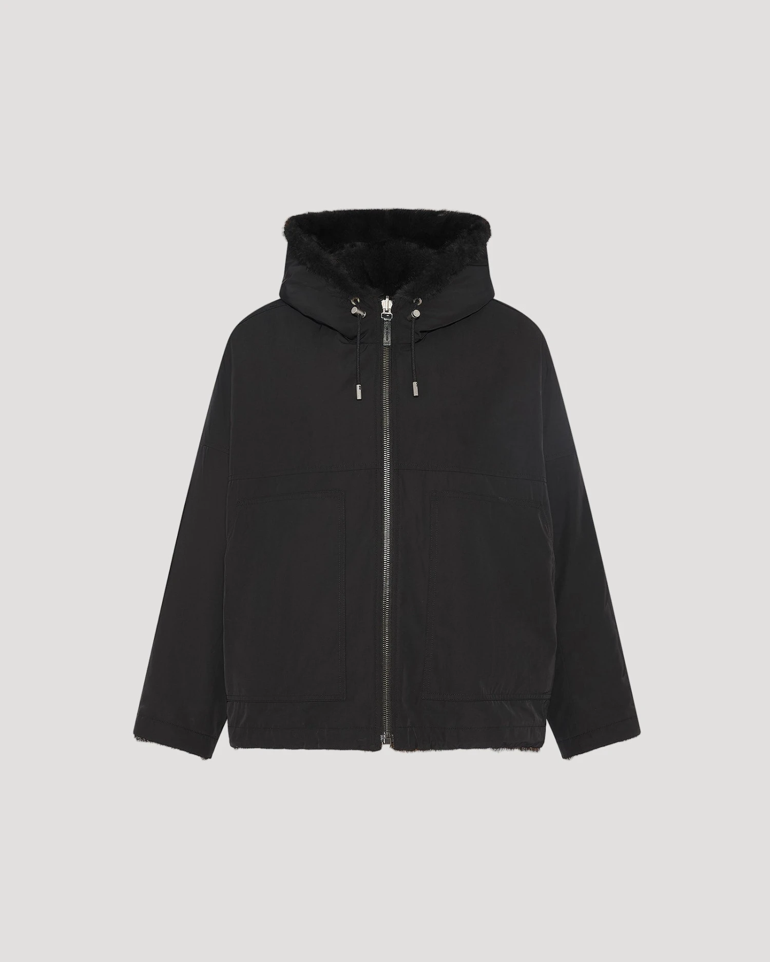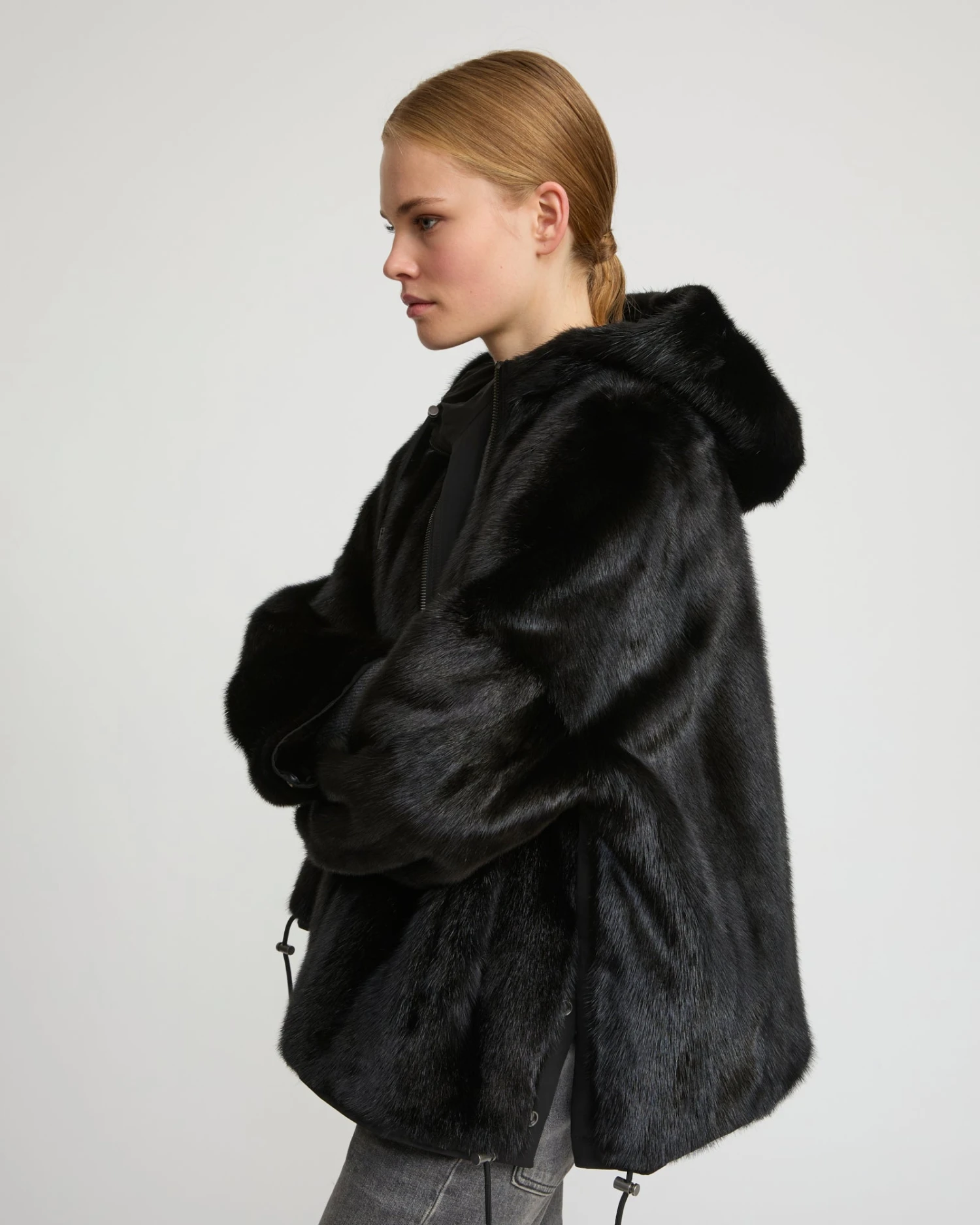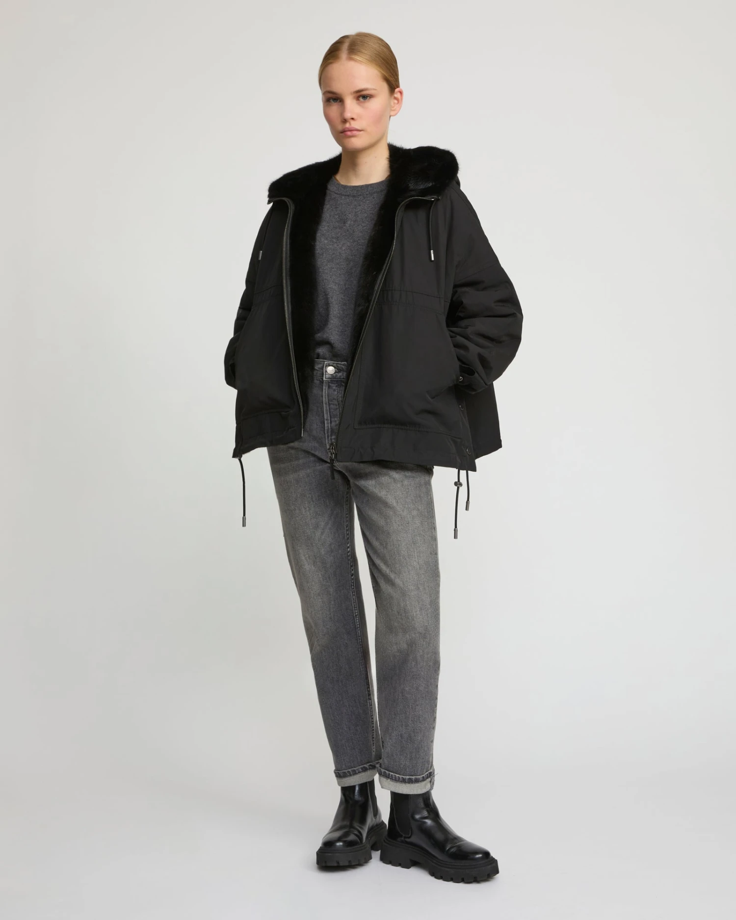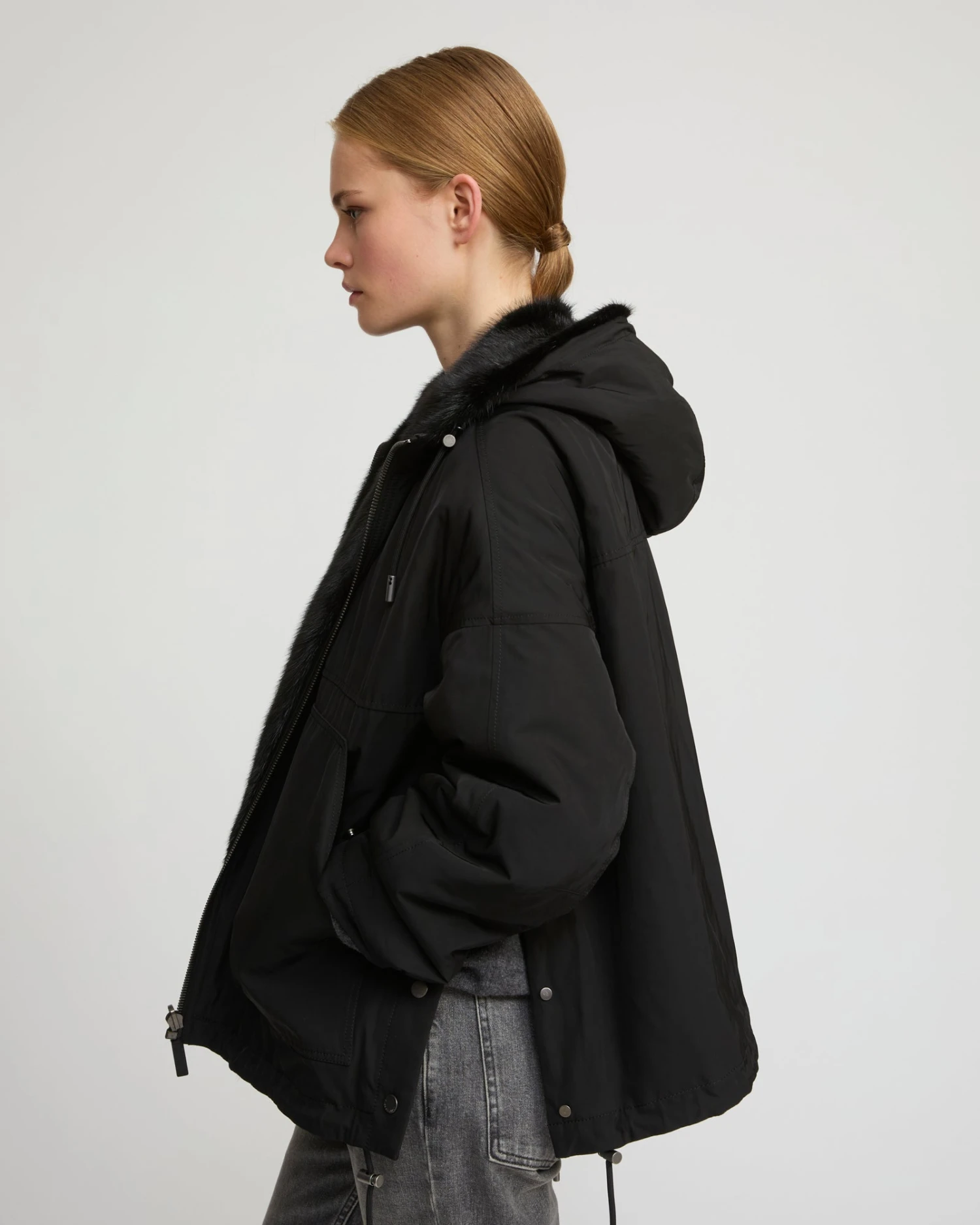 Une parka courte et réversible au style versatile grâce à ses deux faces complémentaires : l’une en tissu technique déperlant et l’autre en fourrure de vison à poils longs caractérisée par sa texture soyeuse et sa durabilité. Quel que soit le côté porté, l’autre matière reste visible à l’intérieur de la capuche pour une allure à la fois urbaine et élégante. Les détails de conception comprennent une fermeture zippée avec lèvres de protection et tirette en cuir, des fentes sur les côtés, ainsi que deux poches plaquées côté tissu et deux poches fentes côté fourrure. Une pièce chaude et enveloppante aux portés multiples pour traverser l’hiver avec aisance.