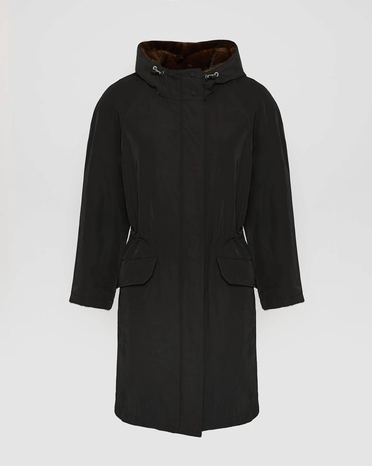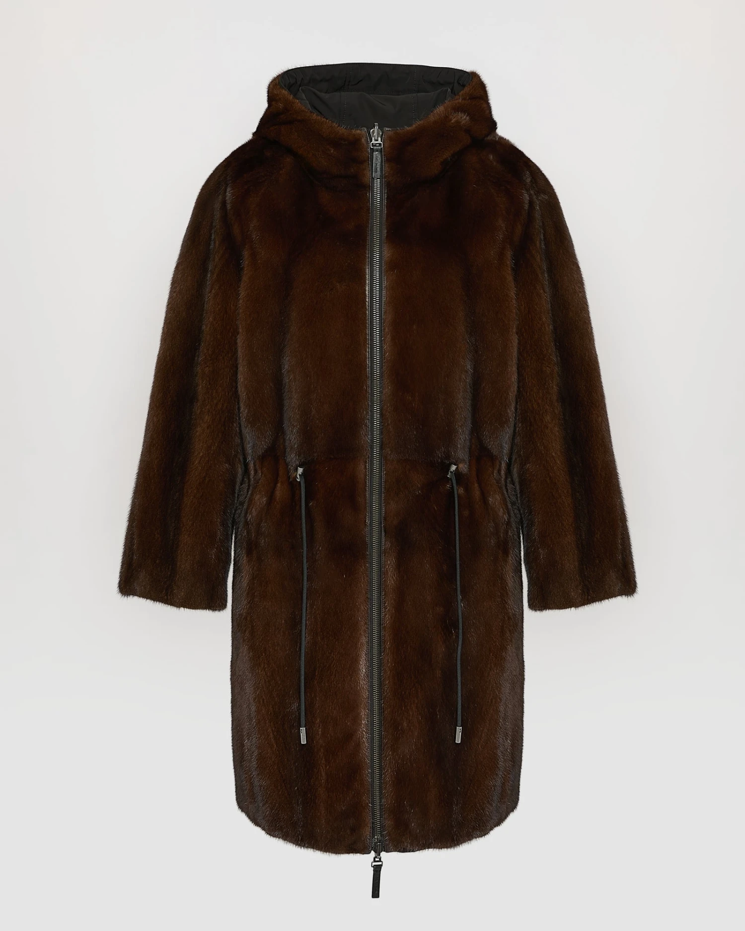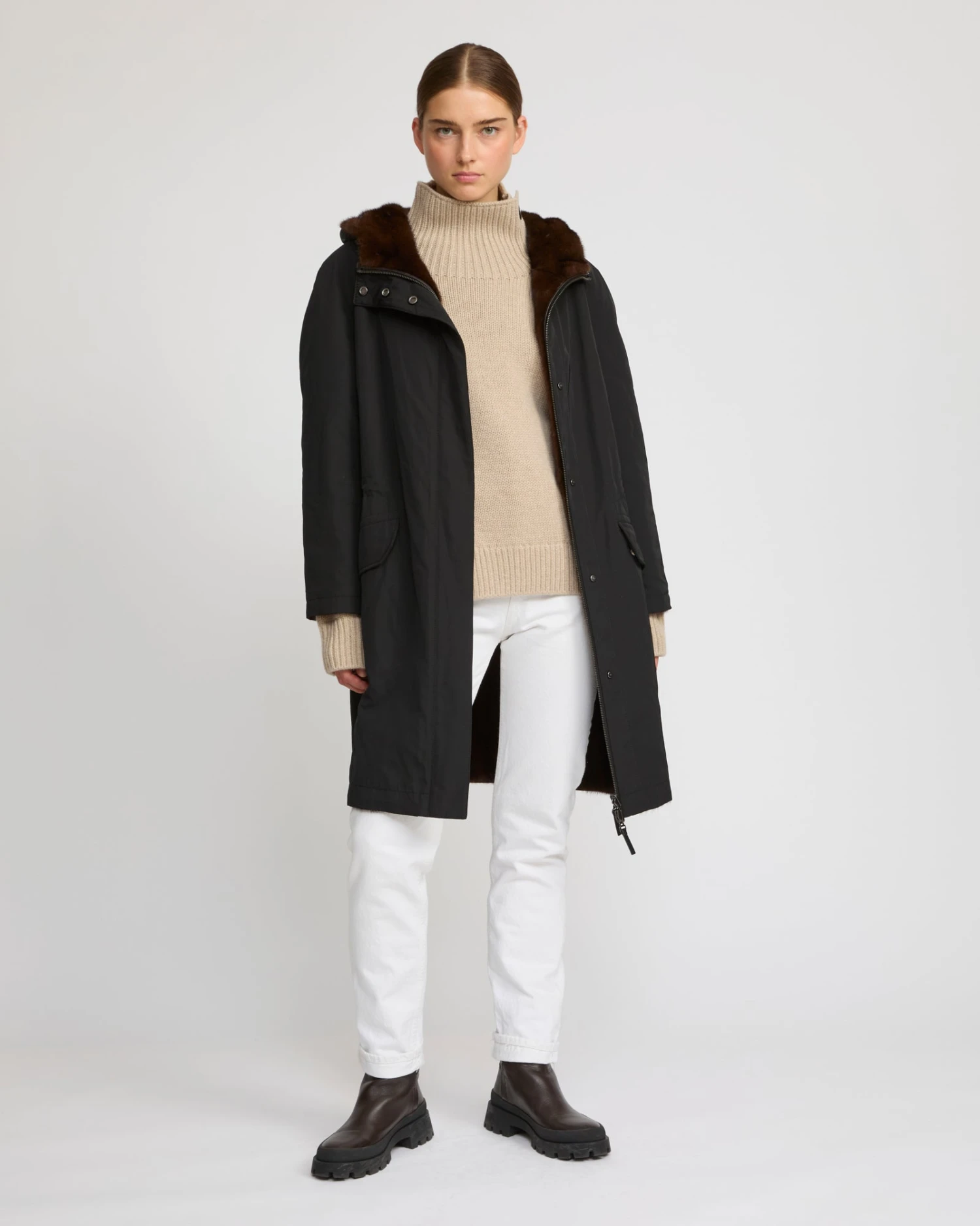 Les lignes classiques de la parka incontournable, travaillée dans une matière réversible, avec une face en tissu technique, et une face en fourrure de vison luxueuse et résistante.