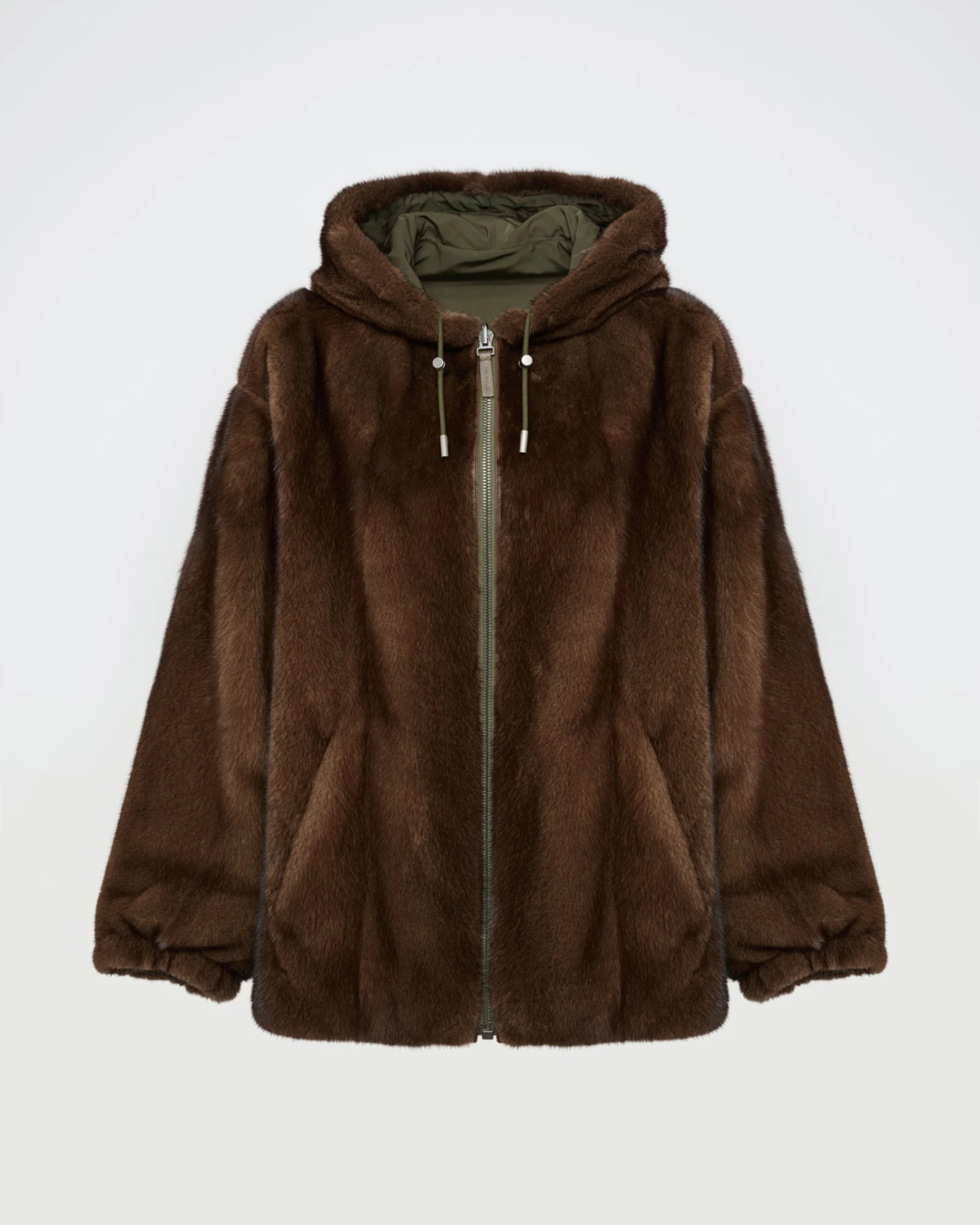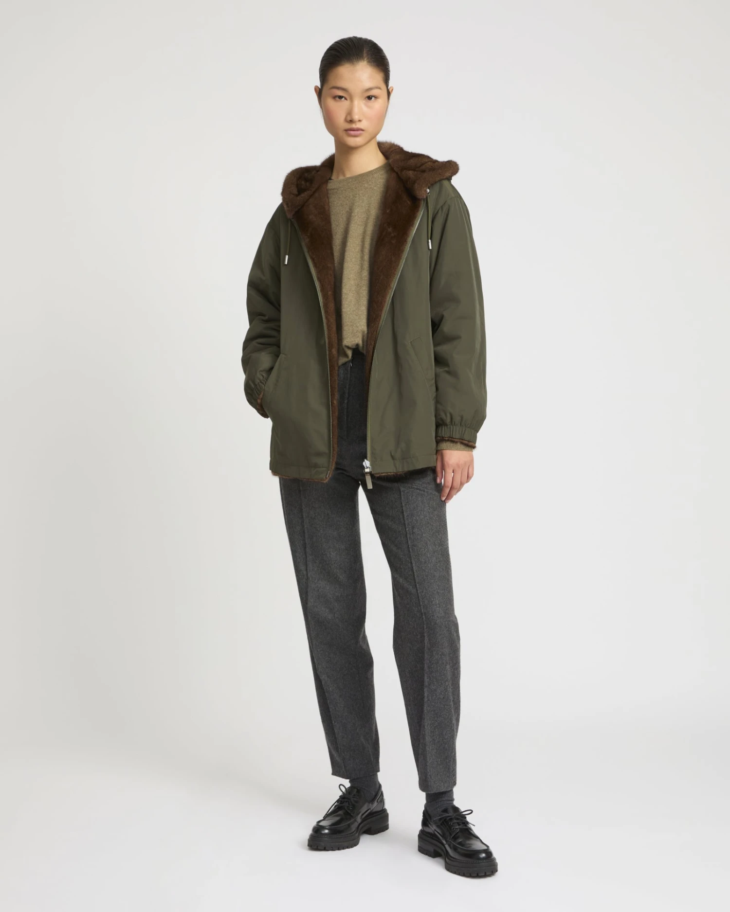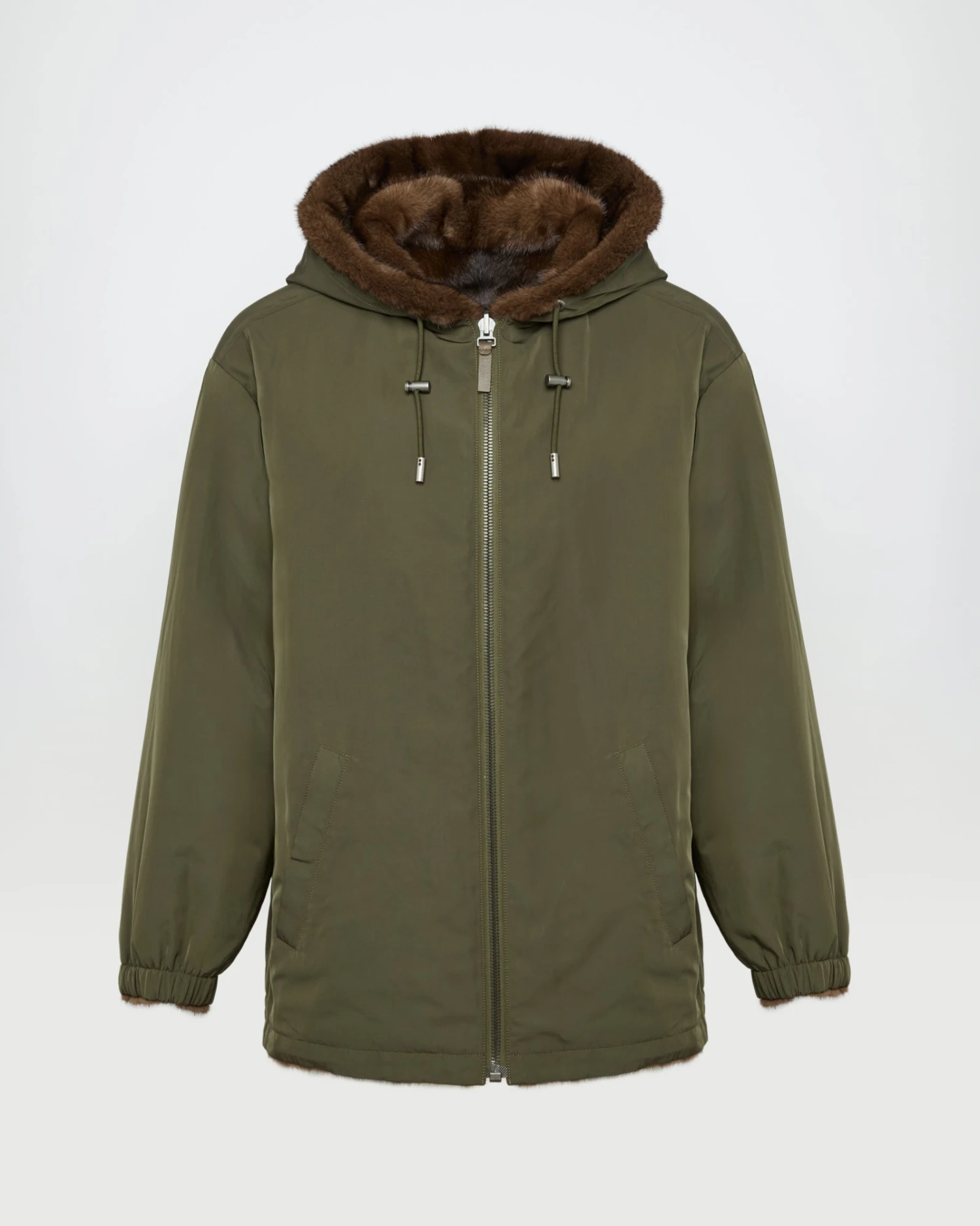 Allure sport chic pour cette parka courte qui propose une face en tissu technique et une autre en fourrure de vison, au poil doux et épais. La fermeture zip et les détails métalliques (embouts de cordon) apportent leur modernité à une pièce luxueuse et fonctionnelle .