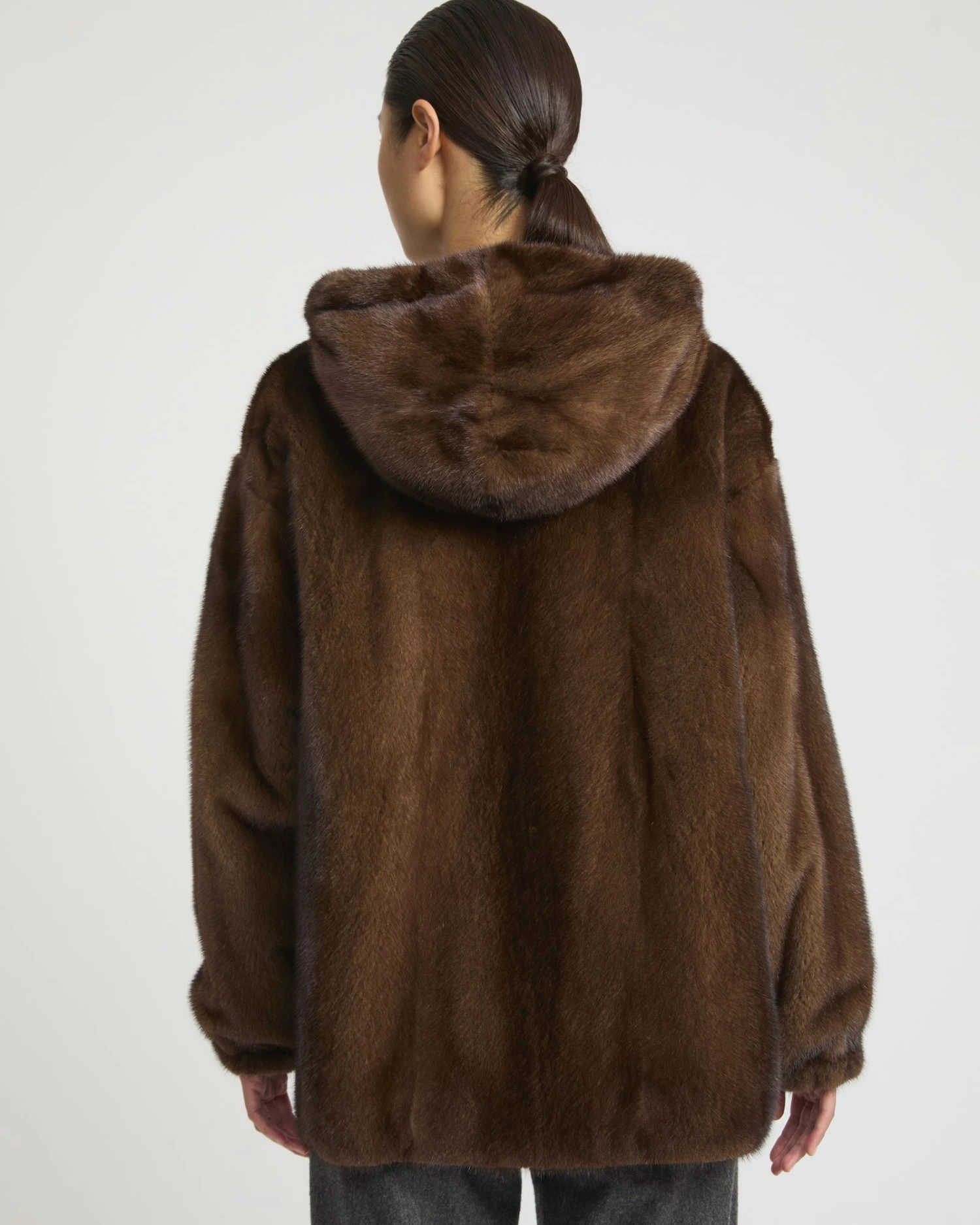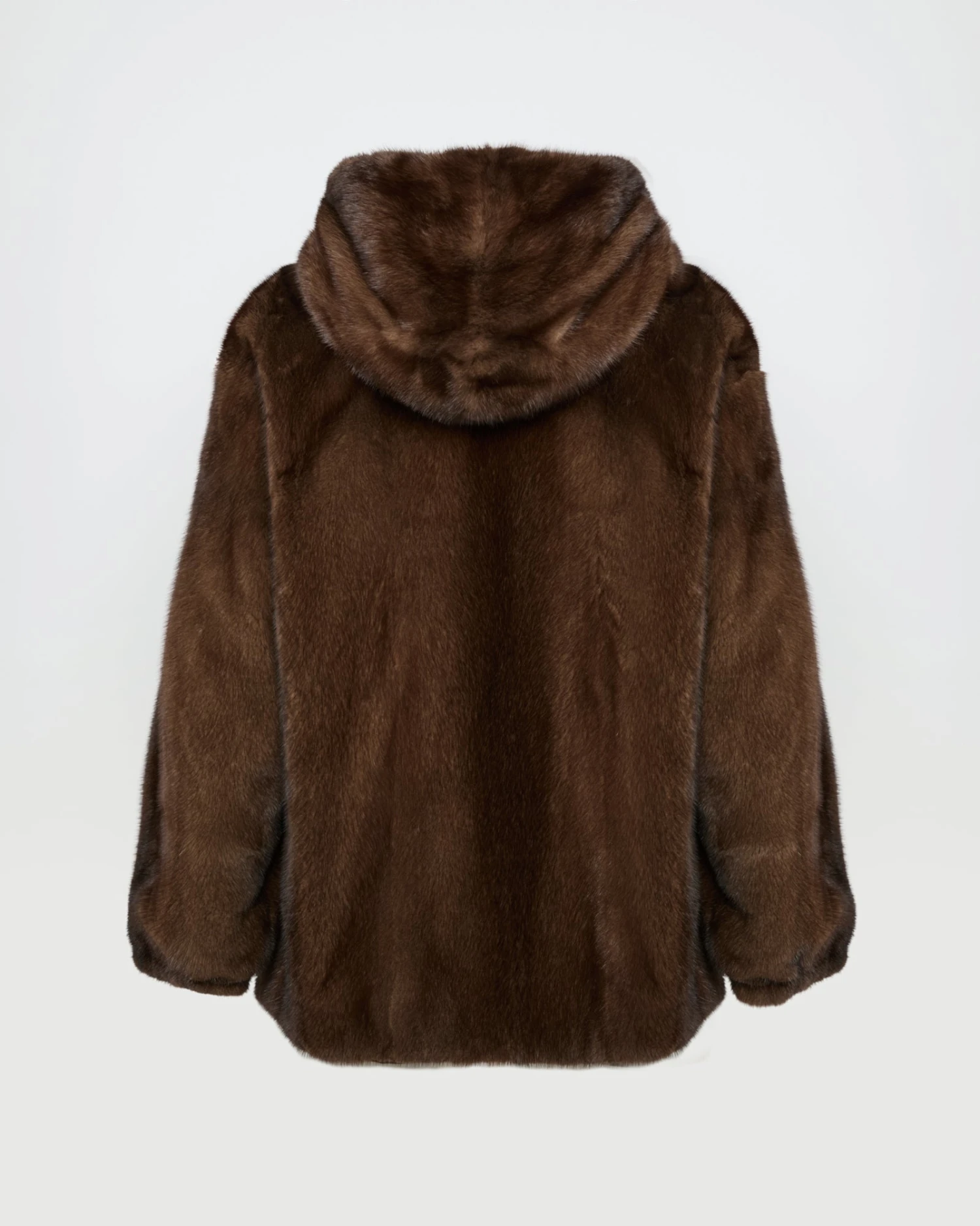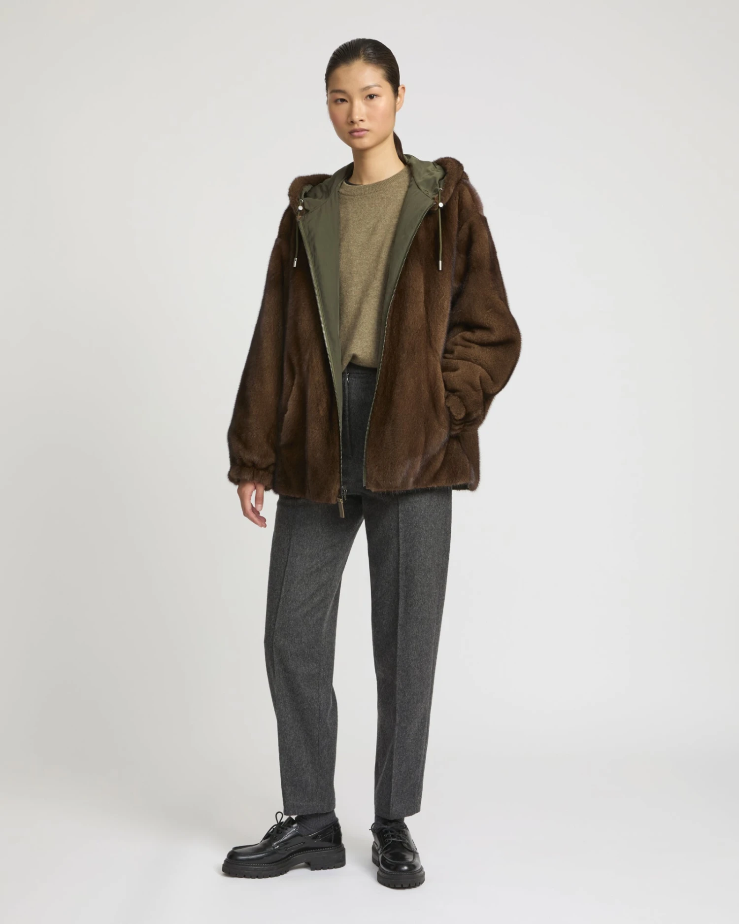 Allure sport chic pour cette parka courte qui propose une face en tissu technique et une autre en fourrure de vison, au poil doux et épais. La fermeture zip et les détails métalliques (embouts de cordon) apportent leur modernité à une pièce luxueuse et fonctionnelle .