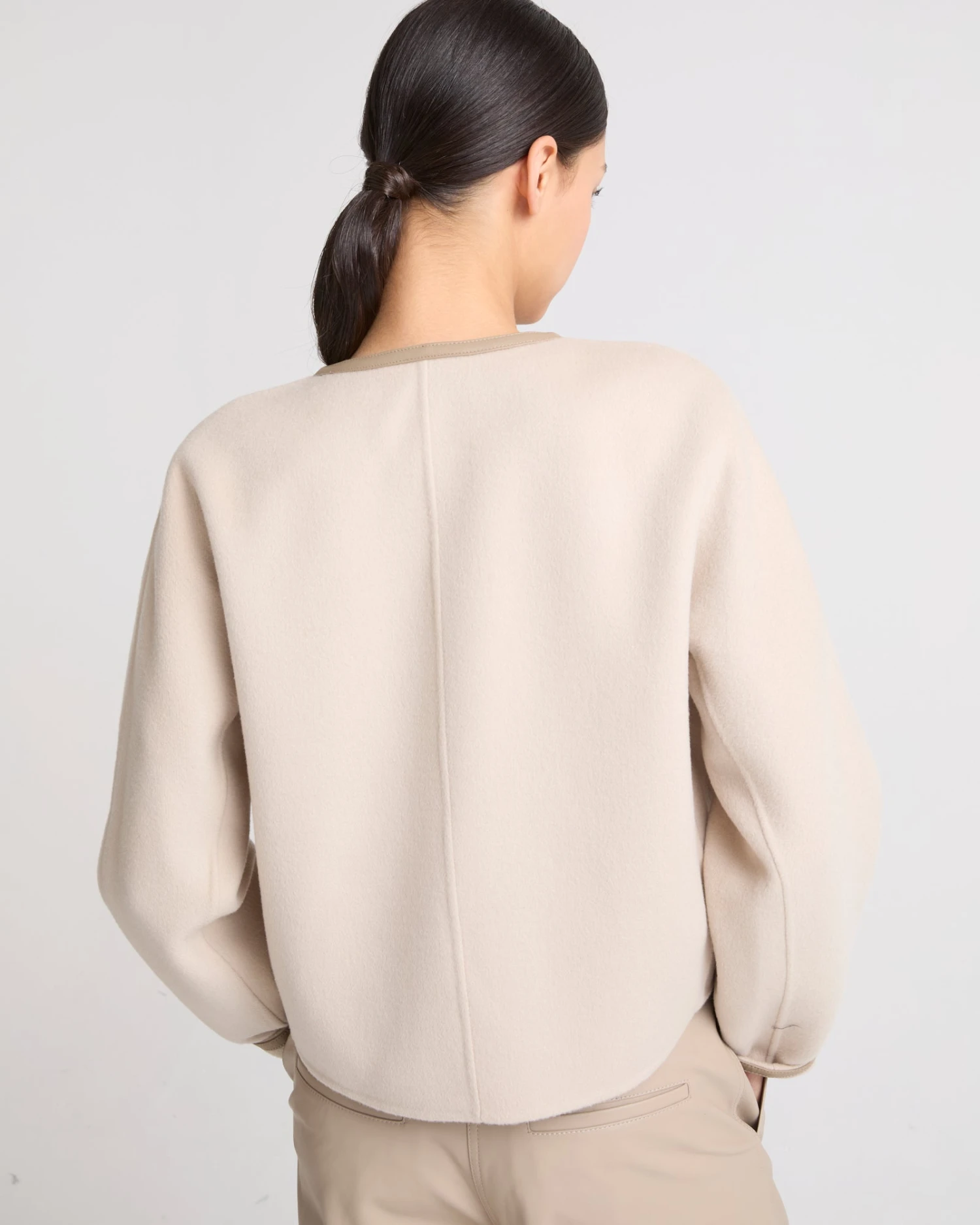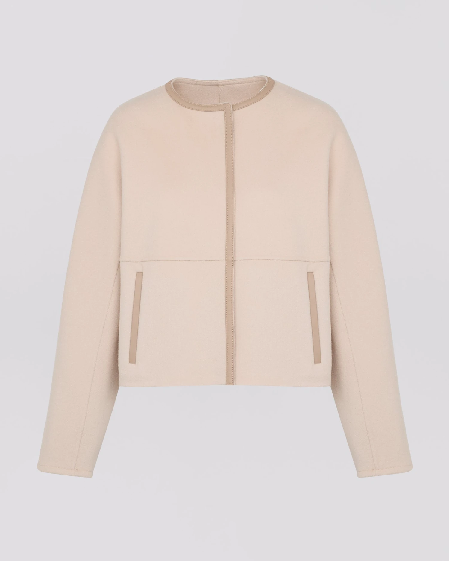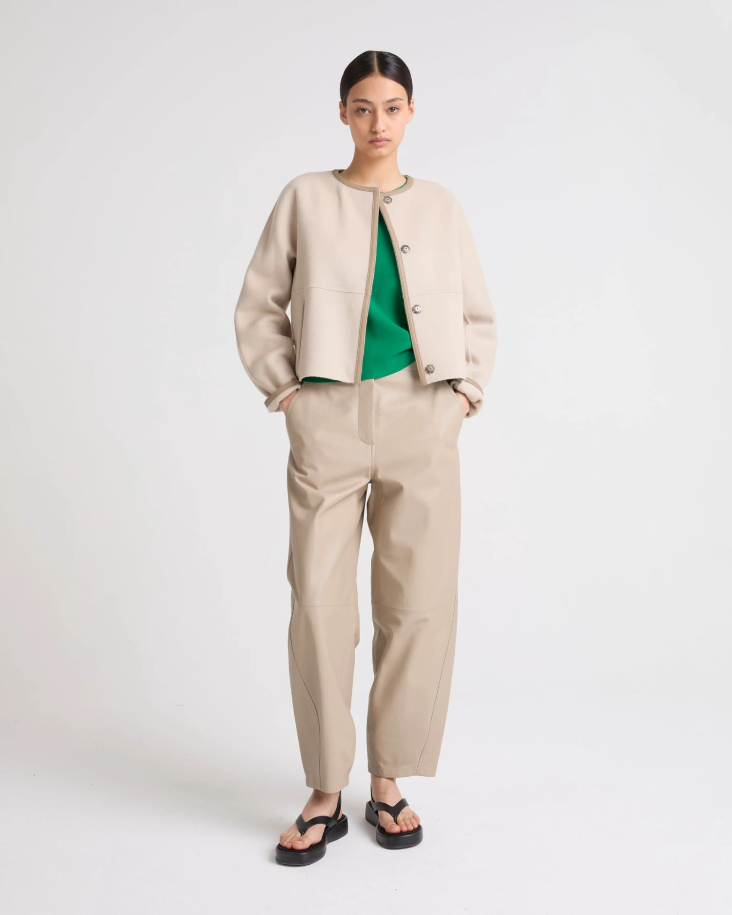Dans un lainage cachemire doux, cette petite veste élégante propose une forme épurée avec un col rond et une longueur taille. Un gansage en cuir d’agneau au col, poignets, ourlet en poches apporte un aspect visuel géométrique et un toucher luxueux.