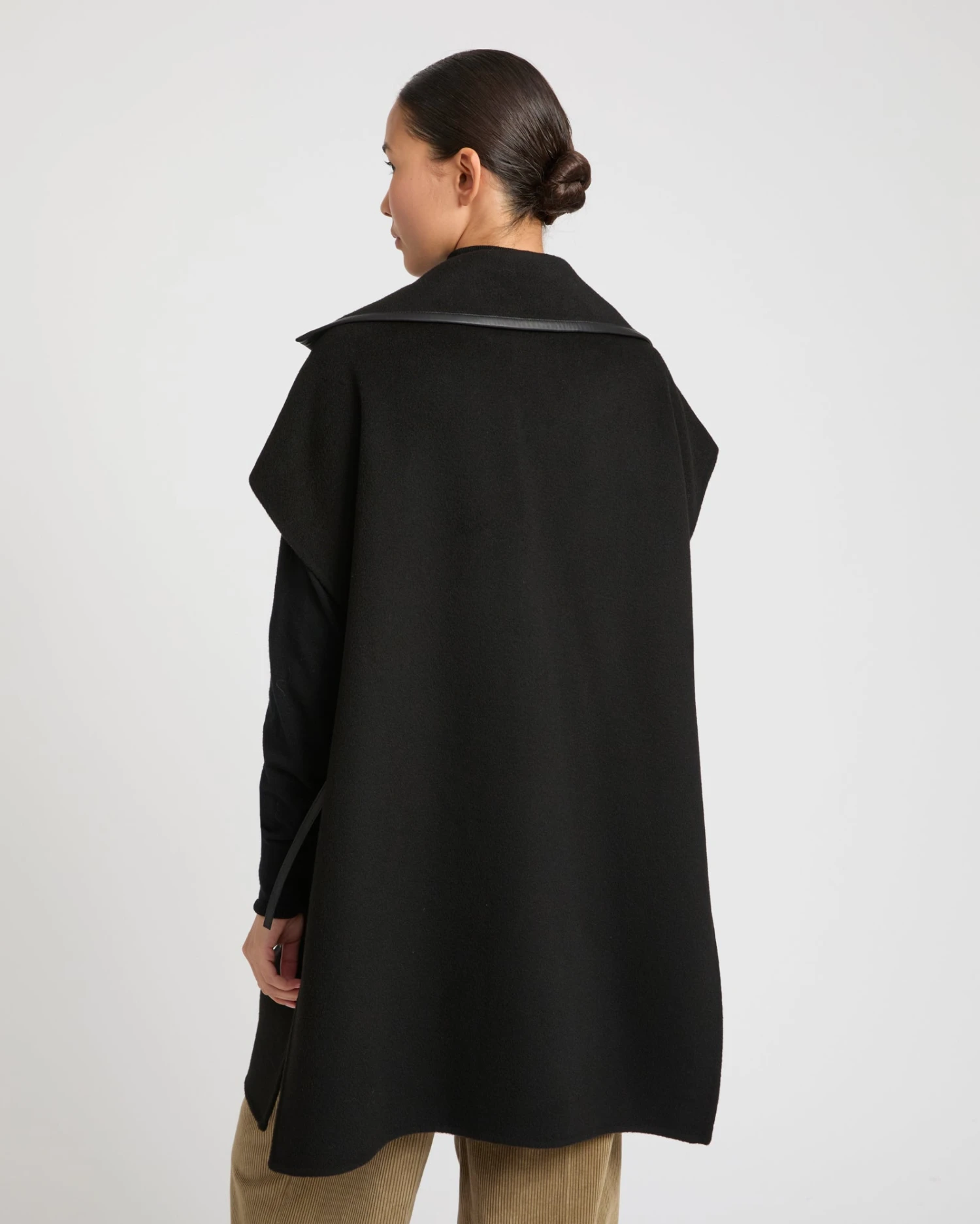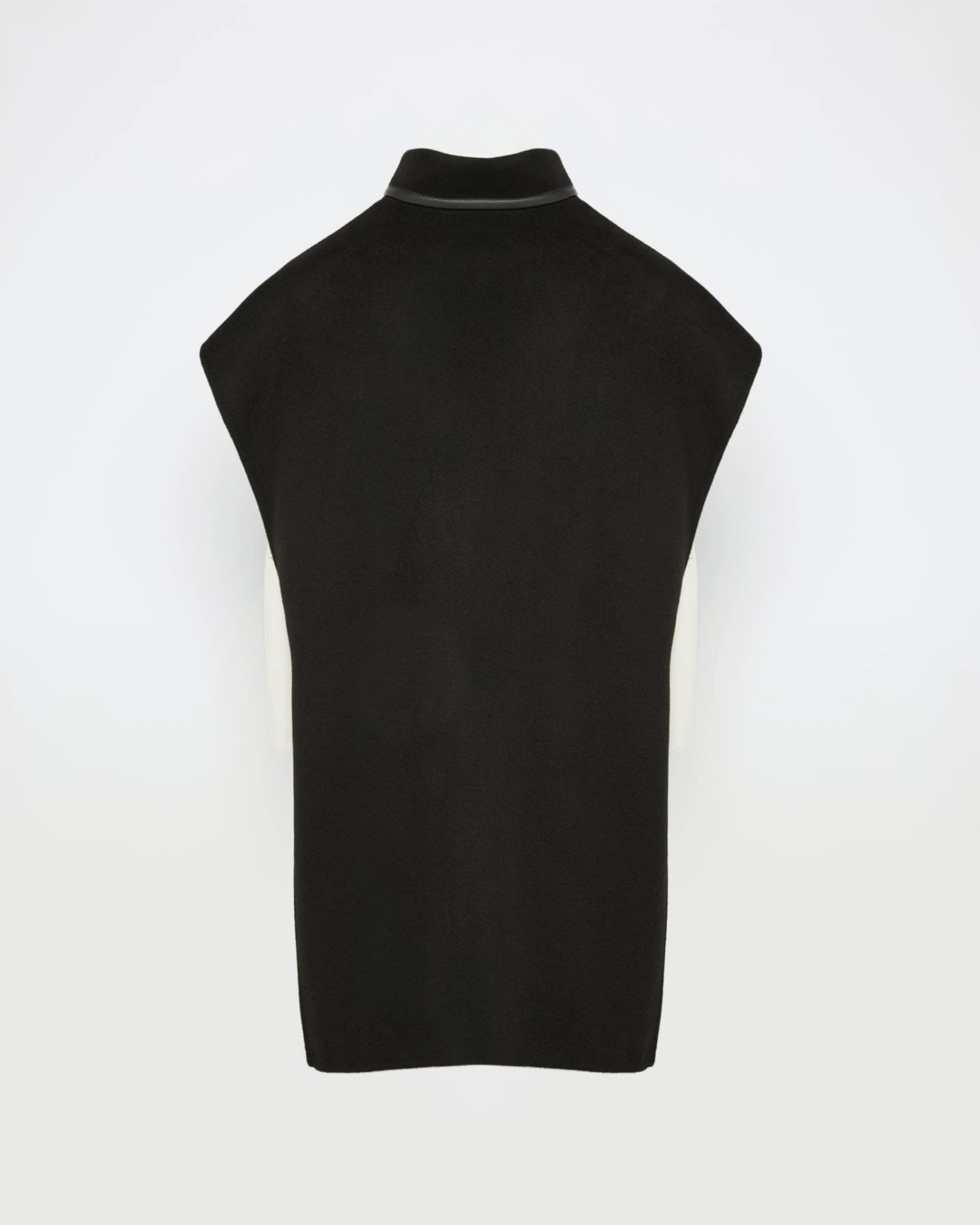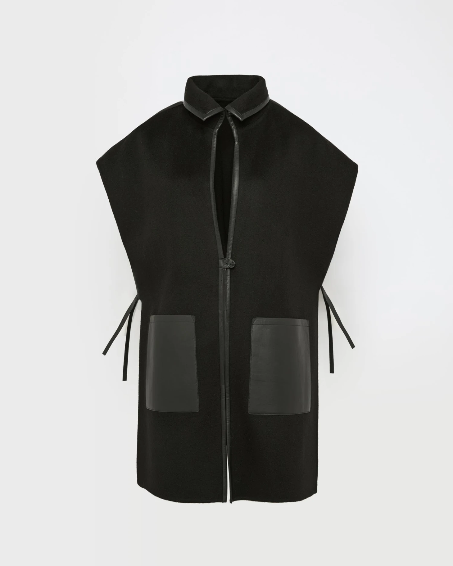 Pièce hybride à l’élégance contemporaine, ce plastron oversized se glisse sur une tenue ou un manteau pour apporter une allure supplémentaire. Sa matière noble en lainage cachemire double-face est gansée d’un tapet en cuir sur les ourlets et le col montant. Deux grandes poches plaquées en cuir apportent un visuel contrasté ainsi qu’un côté pratique.