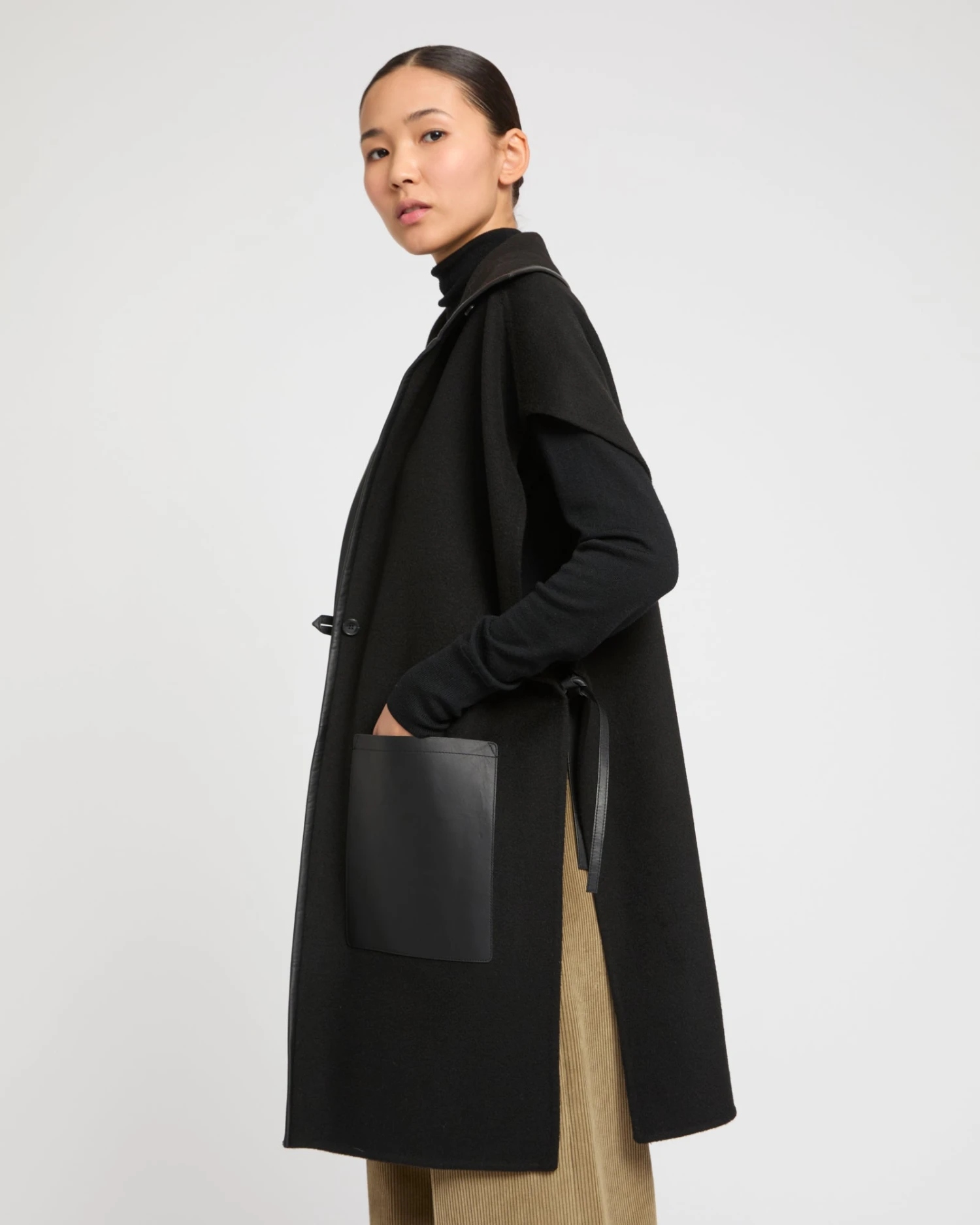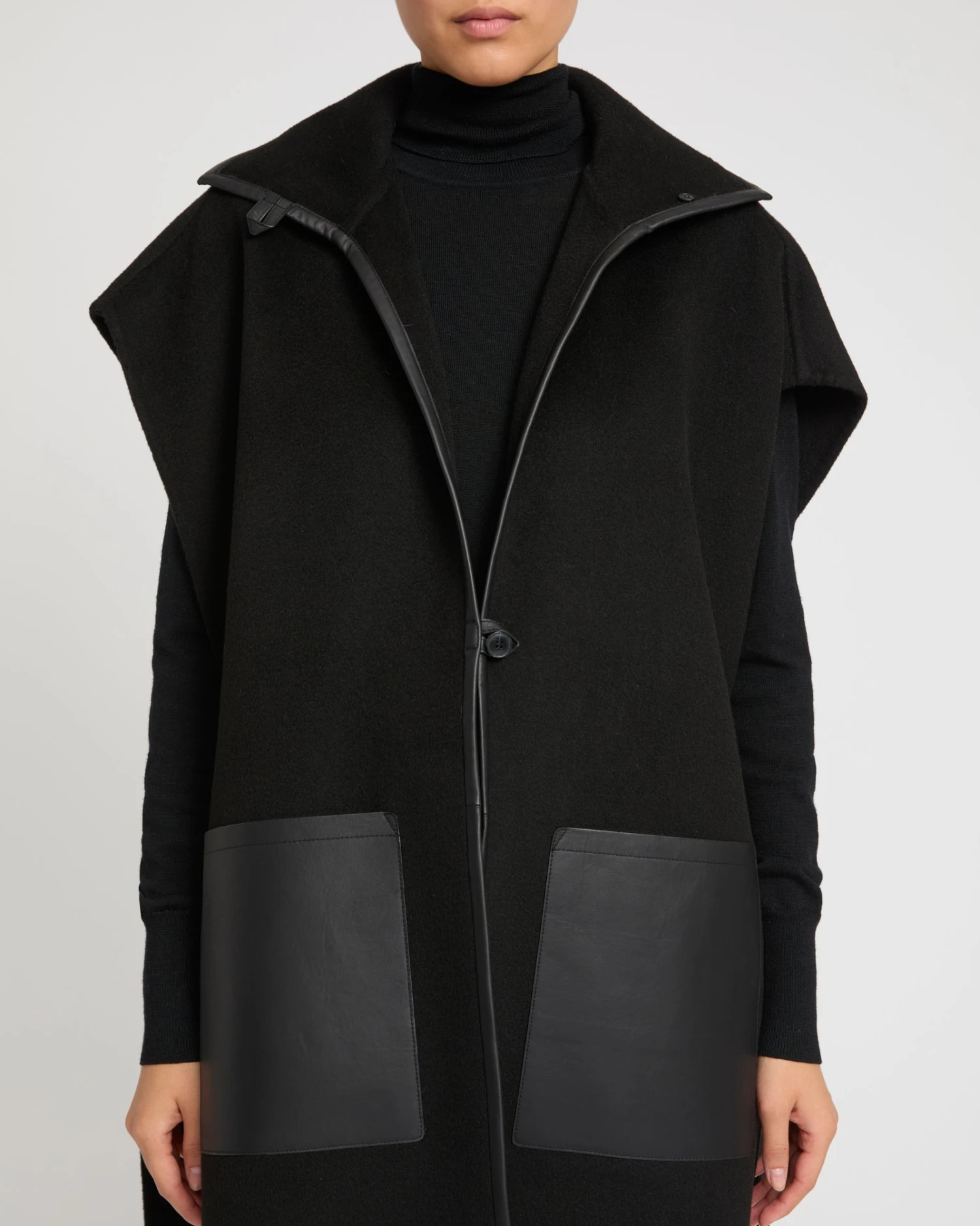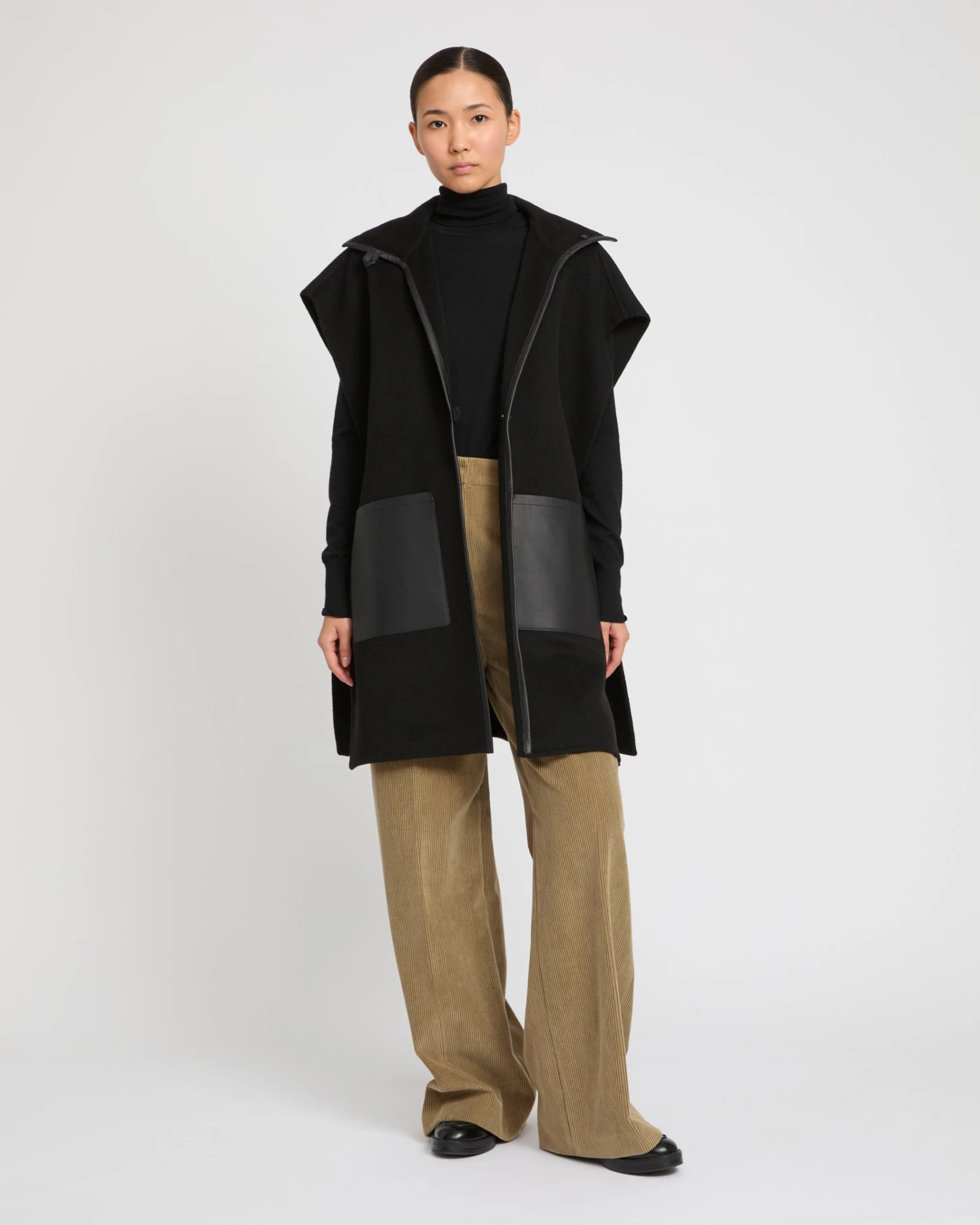 Pièce hybride à l’élégance contemporaine, ce plastron oversized se glisse sur une tenue ou un manteau pour apporter une allure supplémentaire. Sa matière noble en lainage cachemire double-face est gansée d’un tapet en cuir sur les ourlets et le col montant. Deux grandes poches plaquées en cuir apportent un visuel contrasté ainsi qu’un côté pratique.