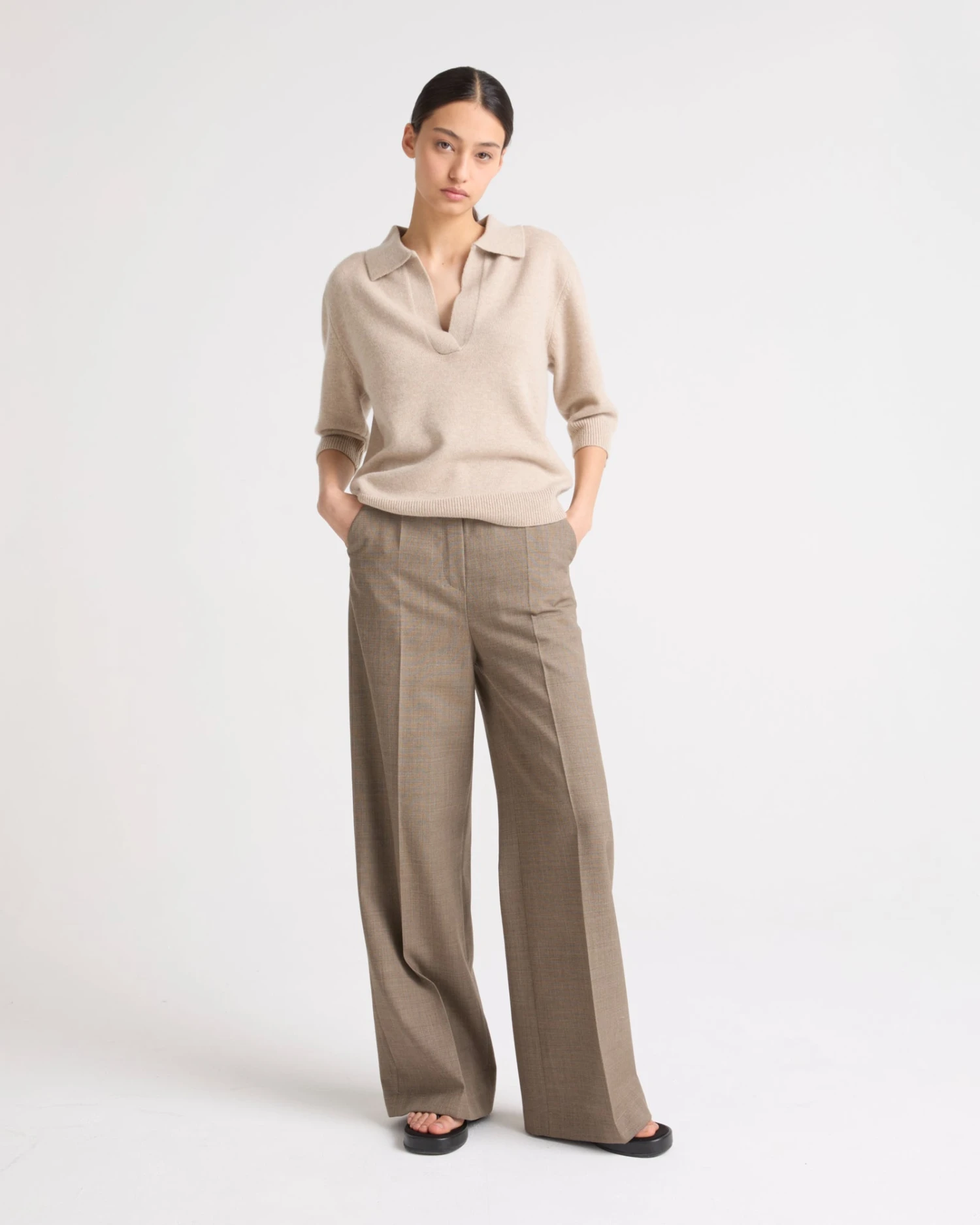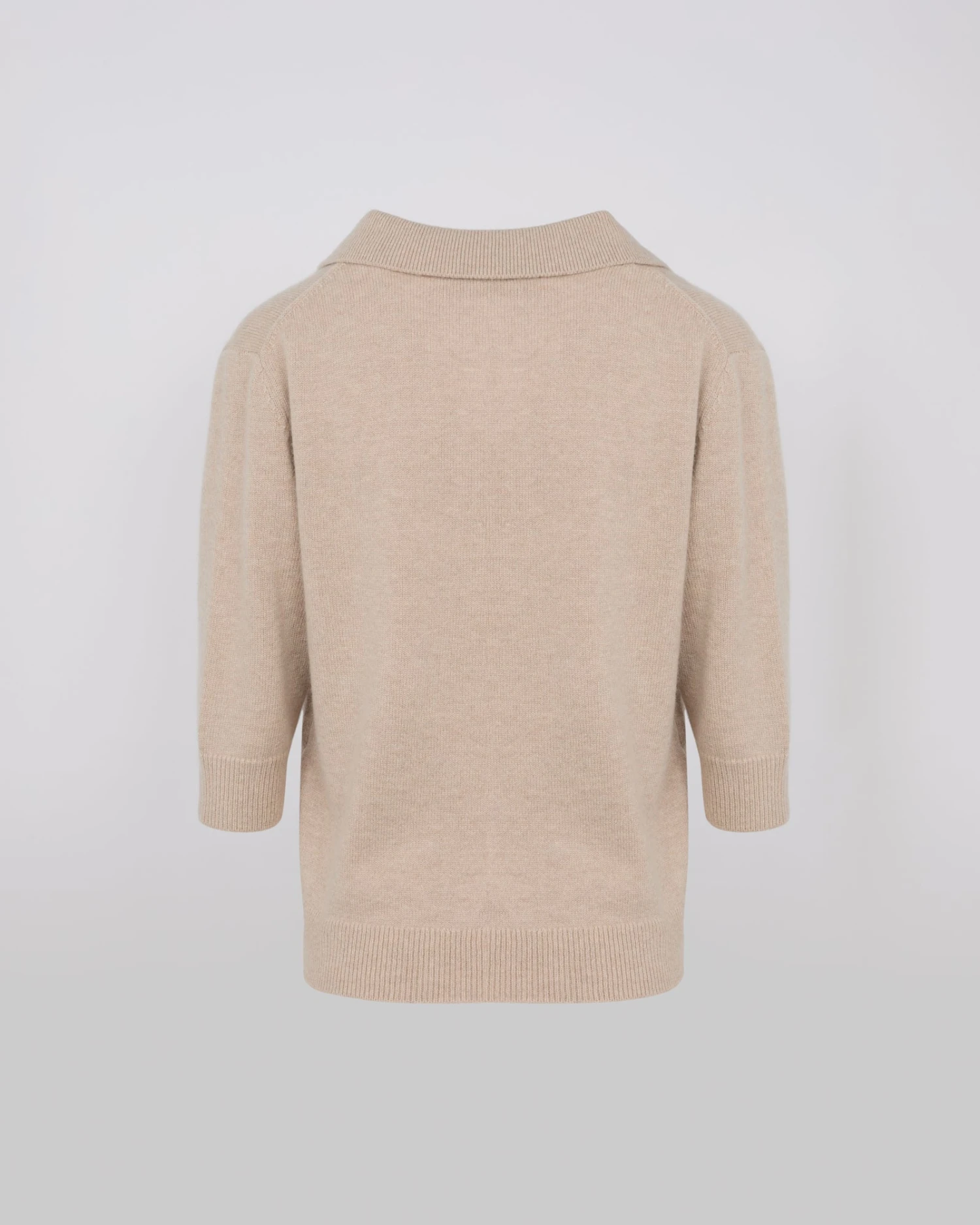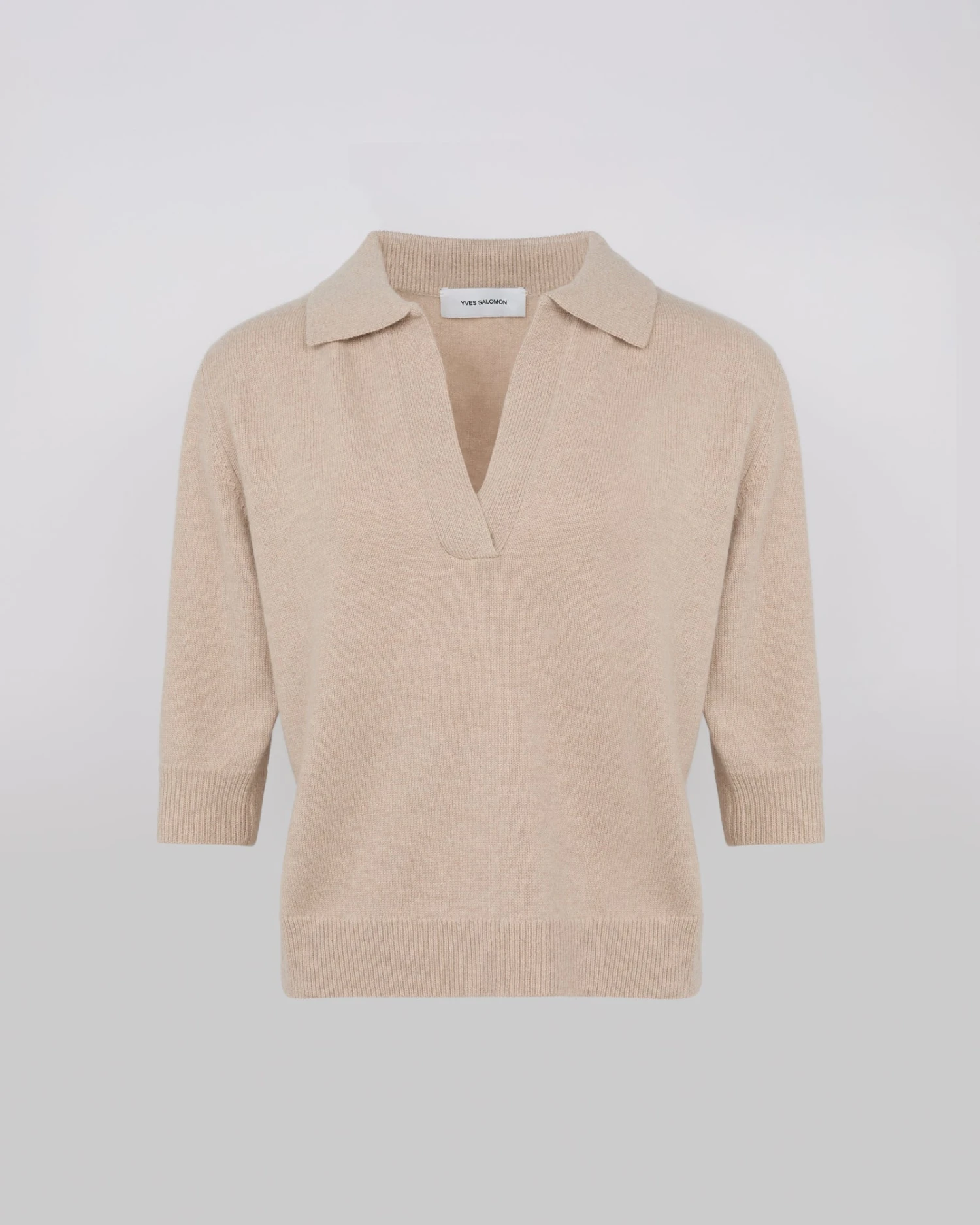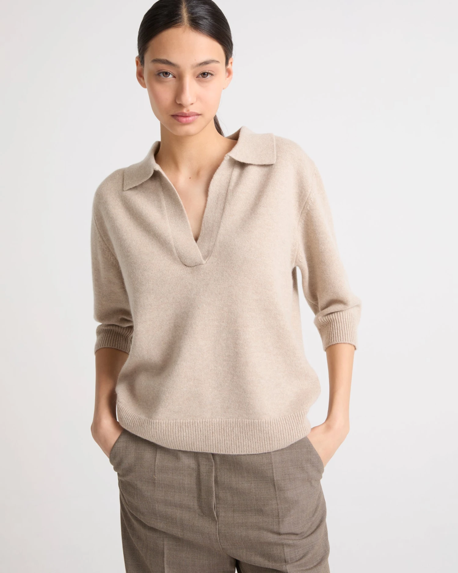 Façonné en maille souple laine et cachemire, ce polo aux manches trois-quart dévoile le cou avec son col V profond, associé à un large revers. Bords côtes au bas et aux manches.