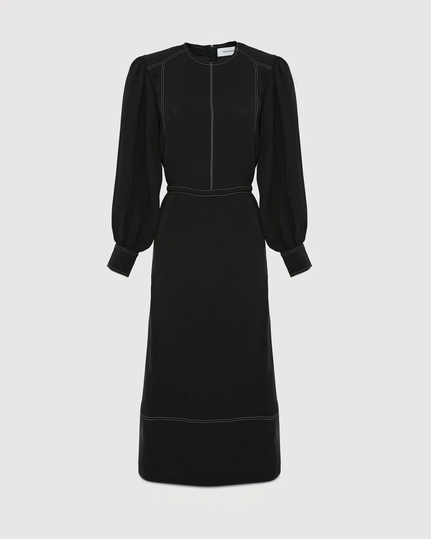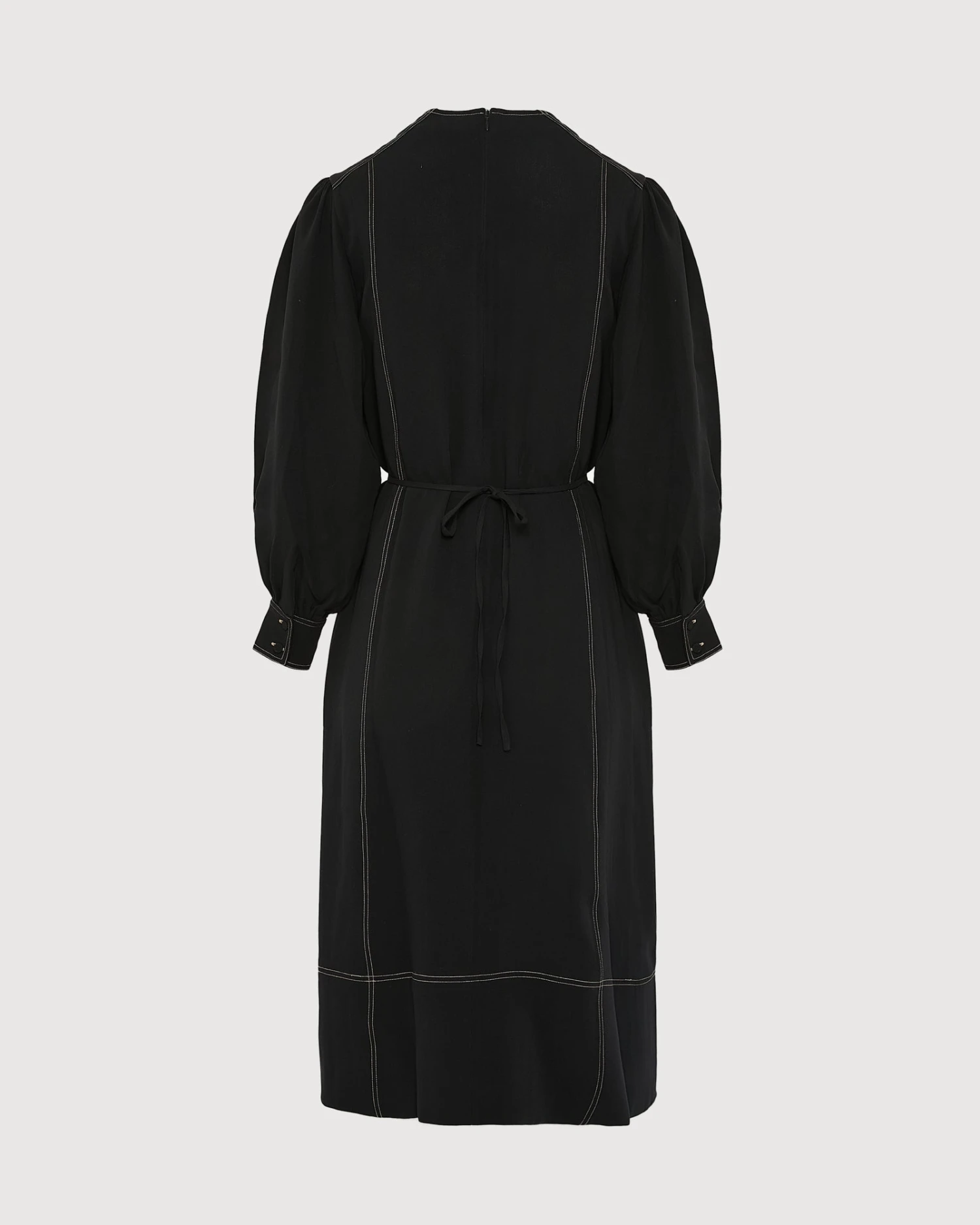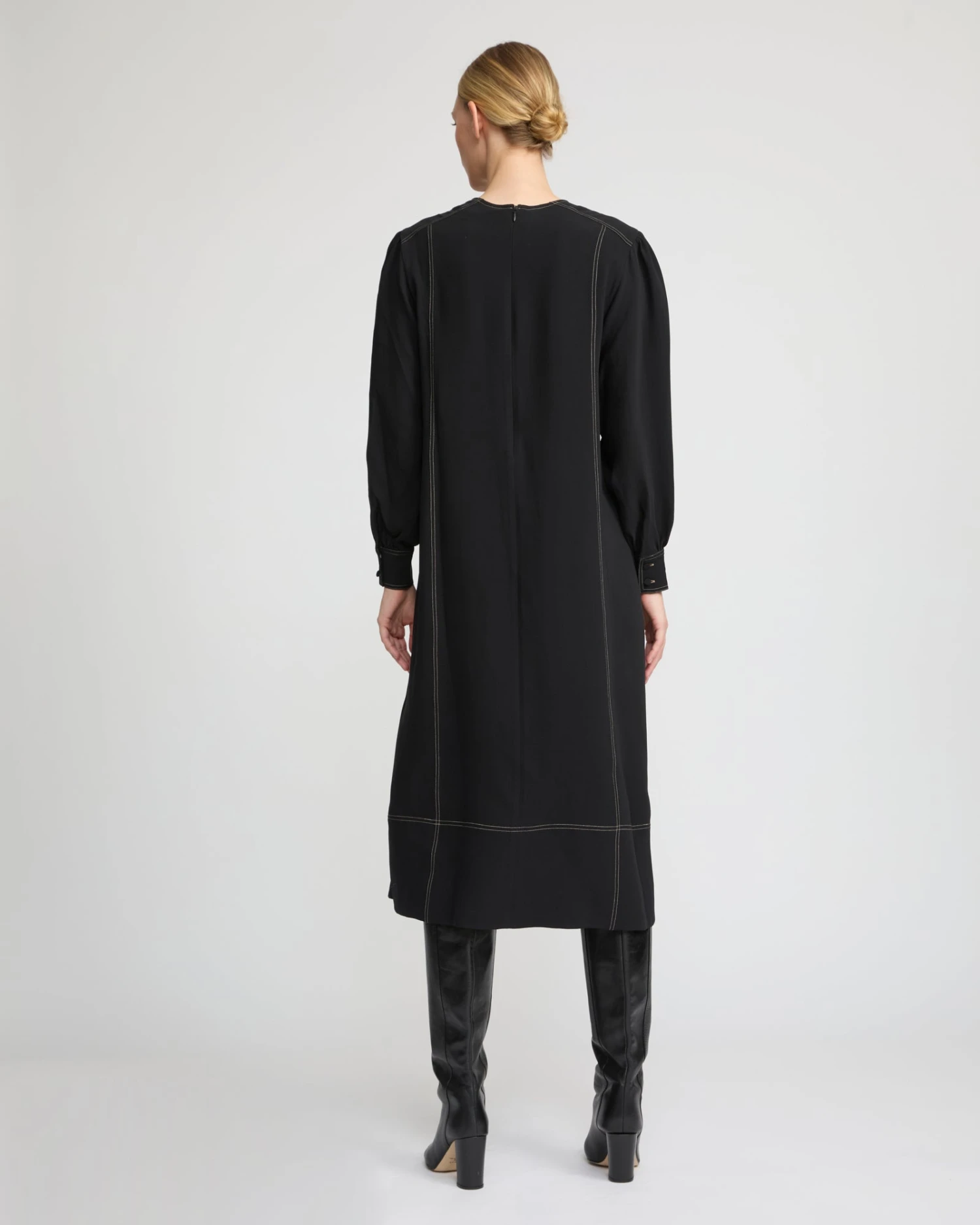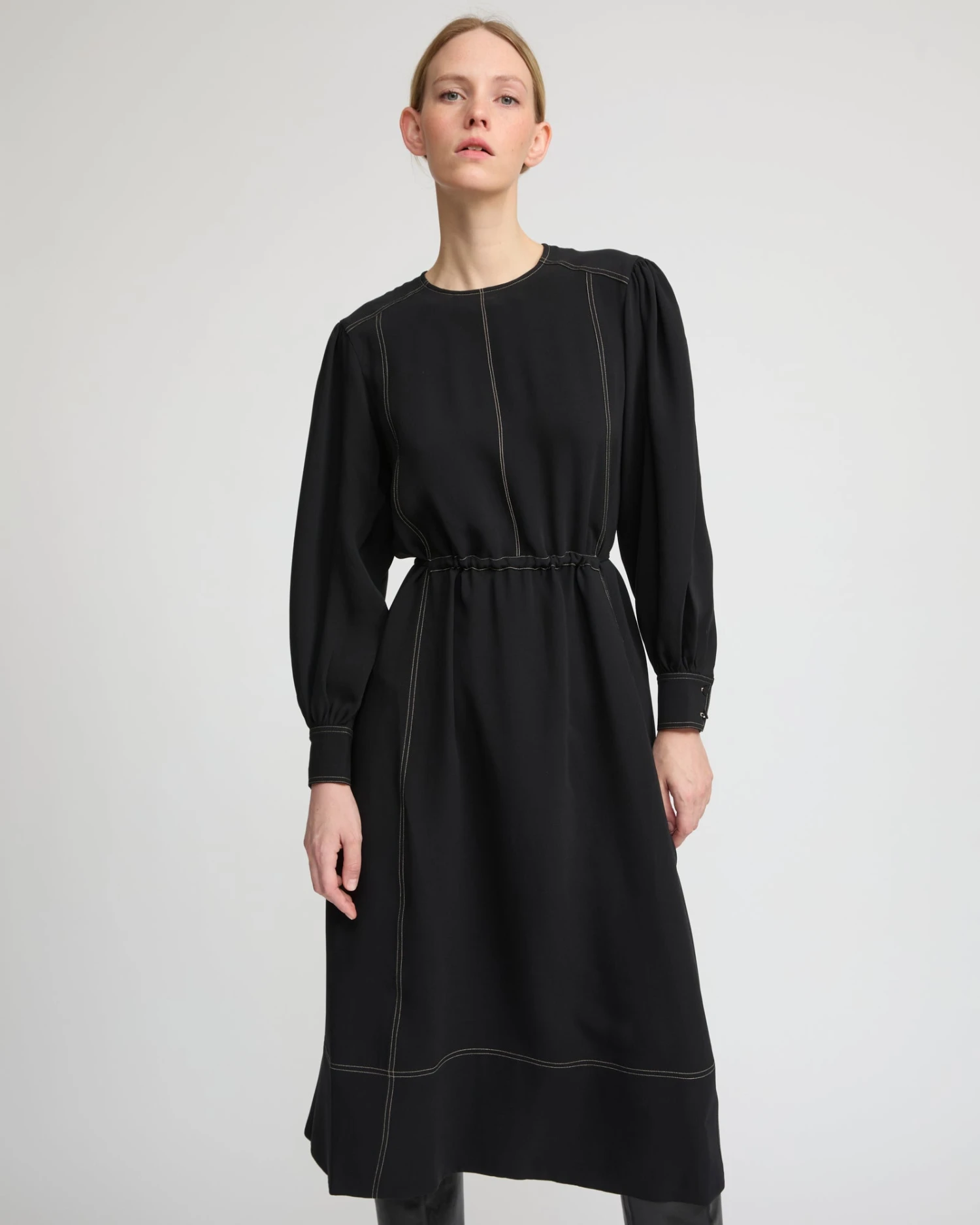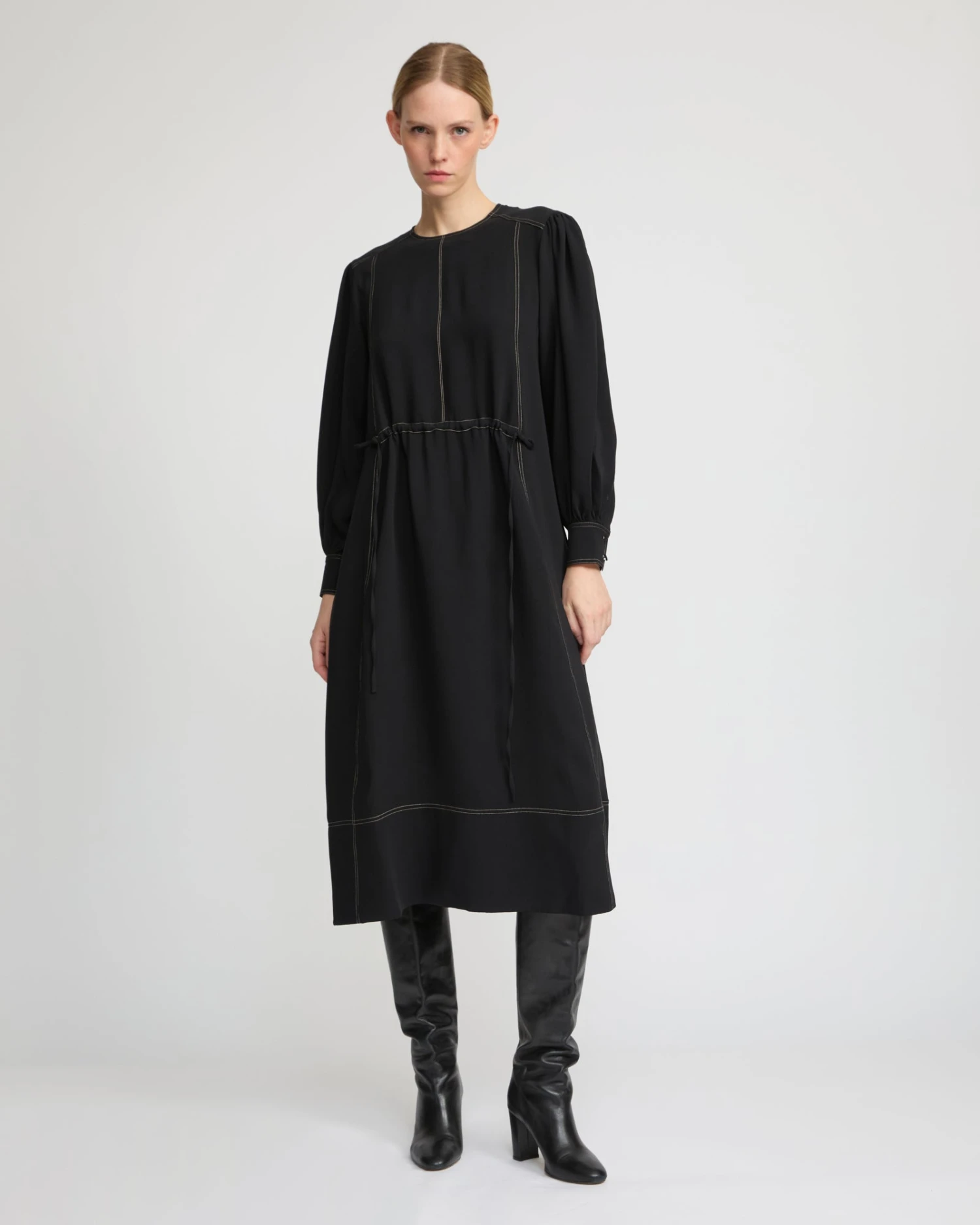 Une robe à l’élégante simplicité, dans un crêpe de soie fluide au tombé impeccable. Détails aux coutures et cordon de serrage à la taille, longueur midi.