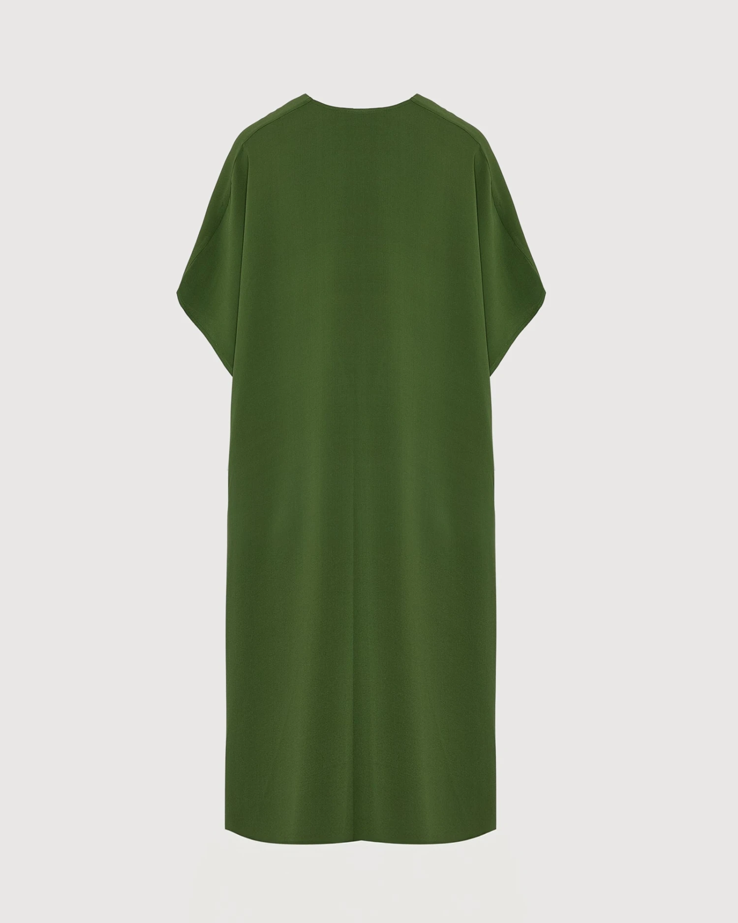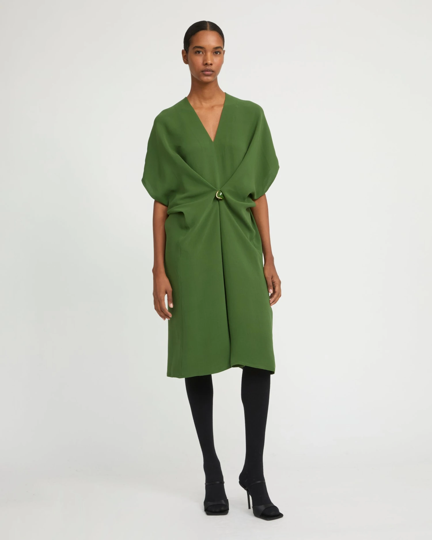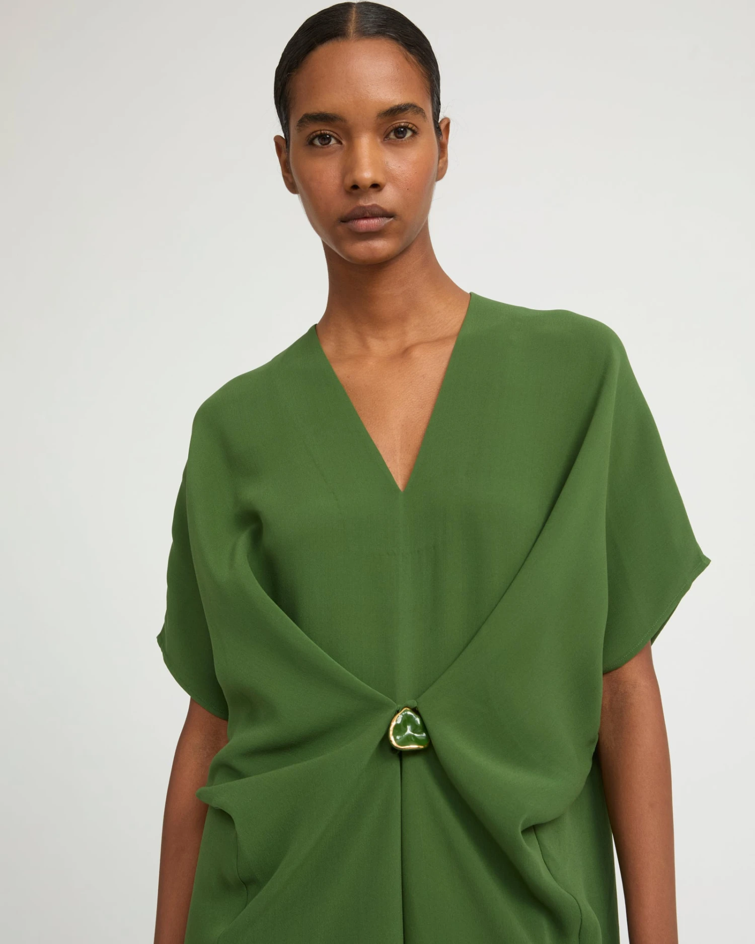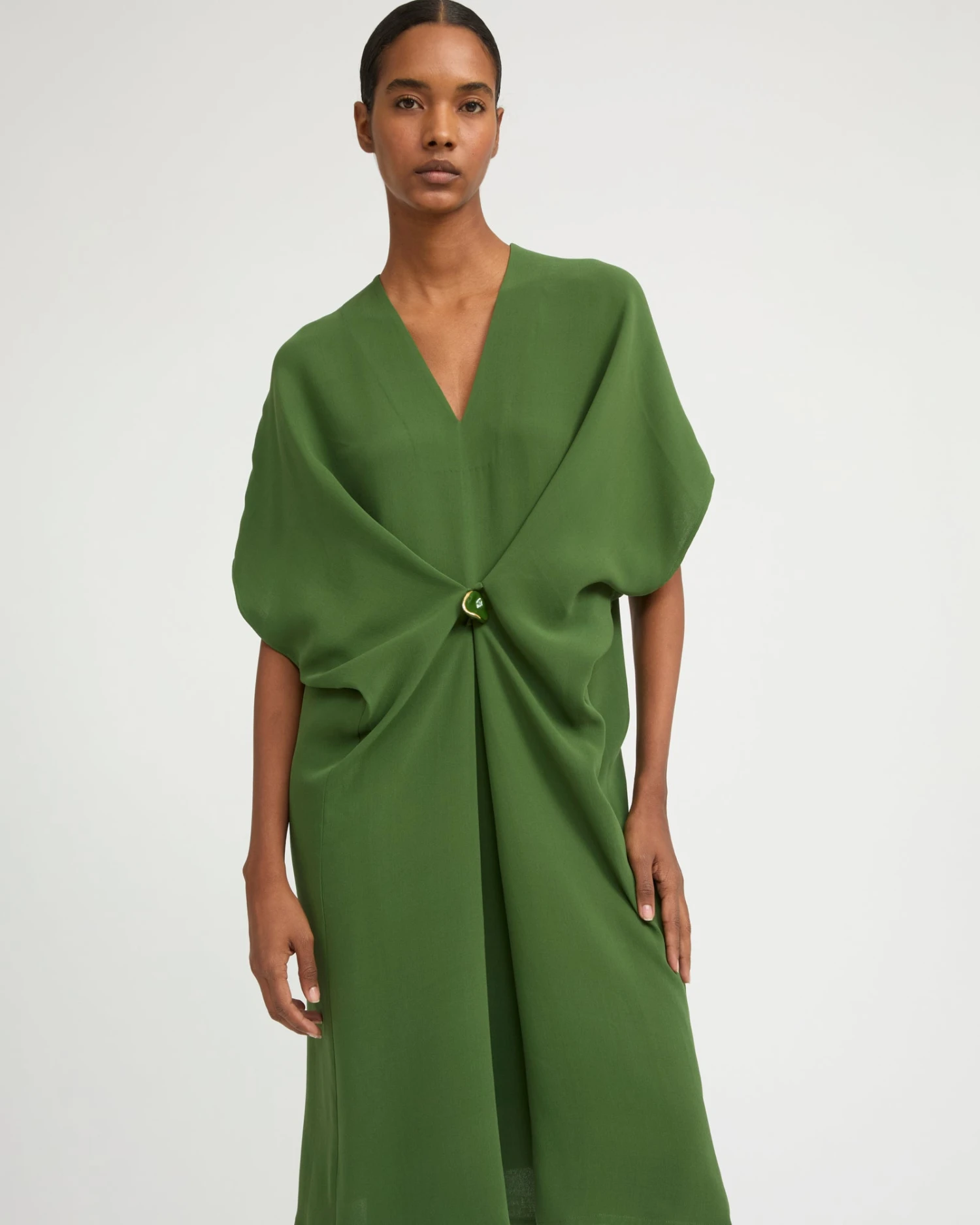 Des volumes sophistiqués pour une robe pleine d’allure au col en V, dont la crêpe de soie fluide vient se draper autour du détail central d’un bouton en céramique, peint à la main.