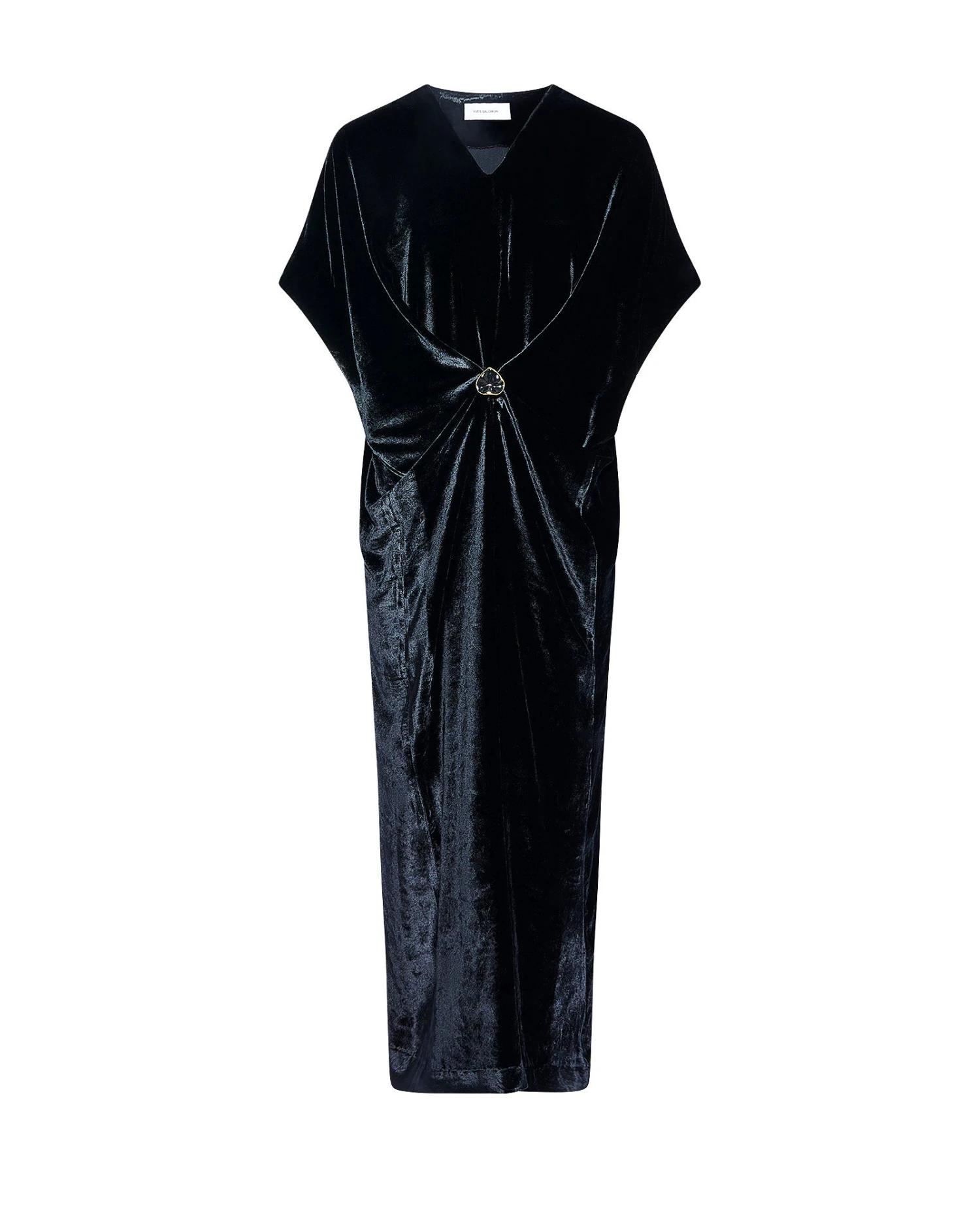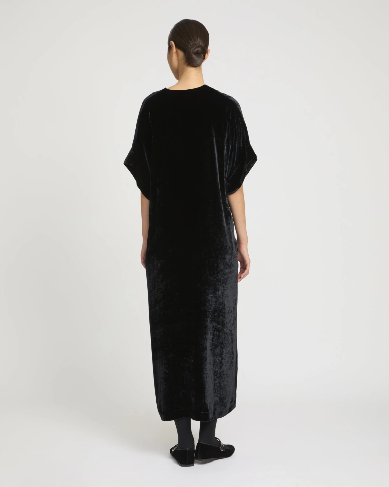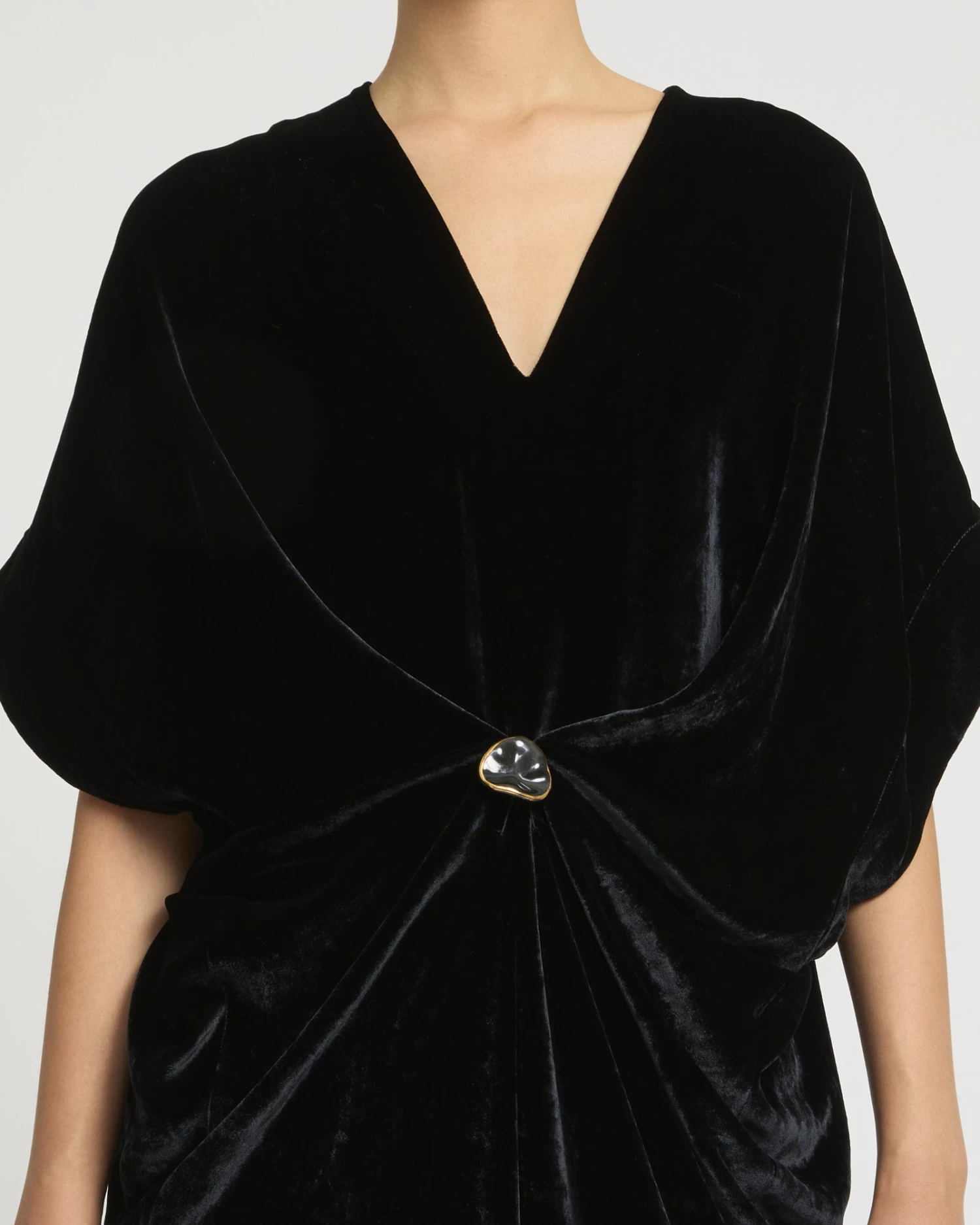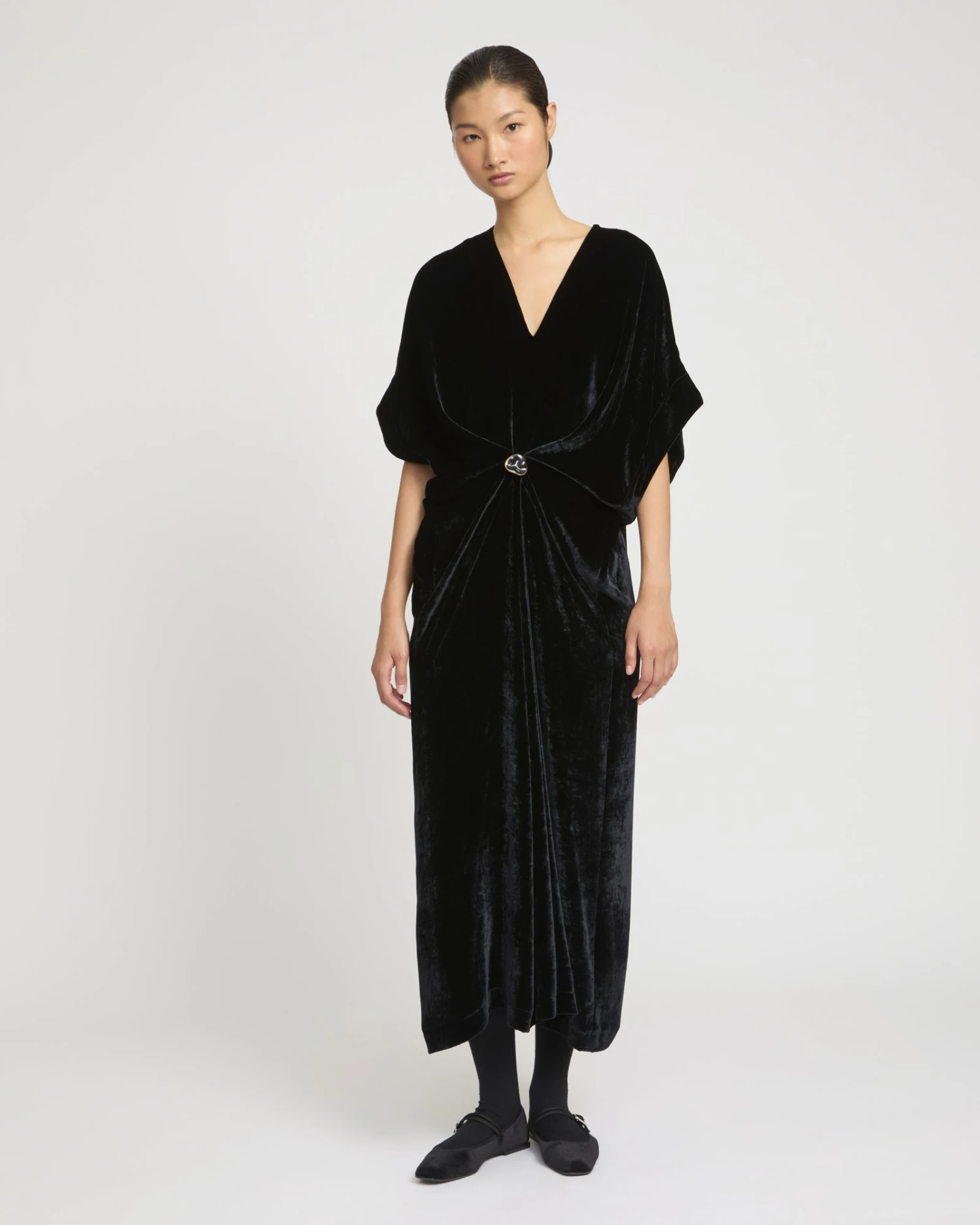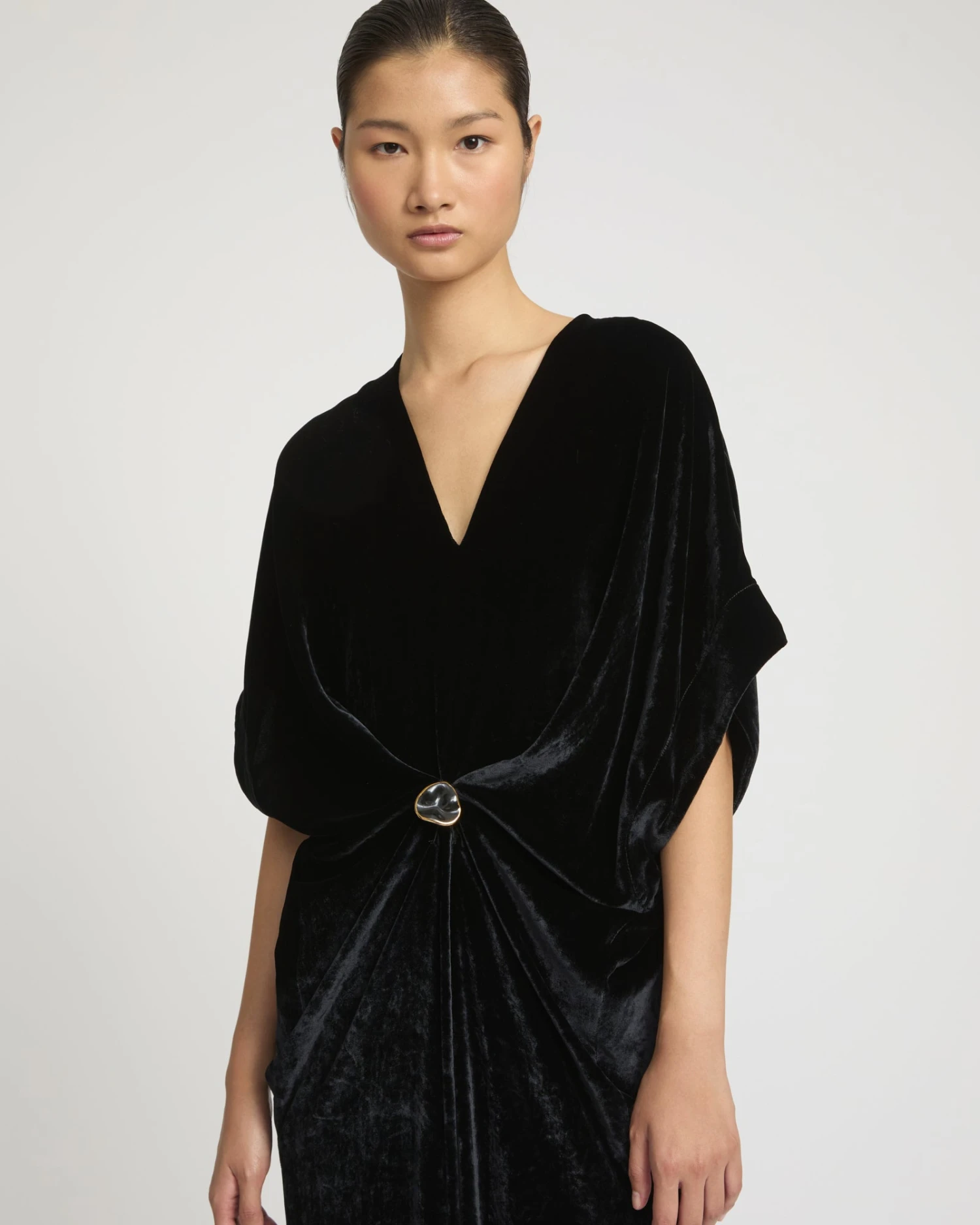 Des volumes somptueux pour une robe pleine d’allure, dont le velours fluide vient se draper autour du détail central d’un bouton en céramique, peint à la main.